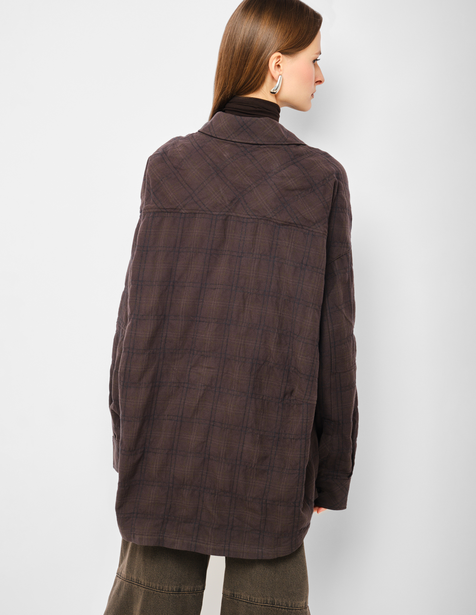 Переосмыслите саму идею верхнего слоя. Эта оверсайз-рубашка — ваш ключ к созданию сложного, многоуровневого образа с интеллектуальным подтекстом. Классическая клетка в благородной бежево-коричневой палитре обретает новый масштаб и объем благодаря стеганной текстуре и свободному, архитектурному крою. Её можно набросить поверх тонкого гольфа, объёмного джемпера или оставить как самостоятельный акцент — в любом случае она задает тон, добавляя образу тактильной глубины и неформальной элегантности. Это не просто утилитарный предмет, а скульптурный элемент гардероба, который меняет восприятие силуэта, предлагая тепло, структуру и безупречную авторскую деталь.