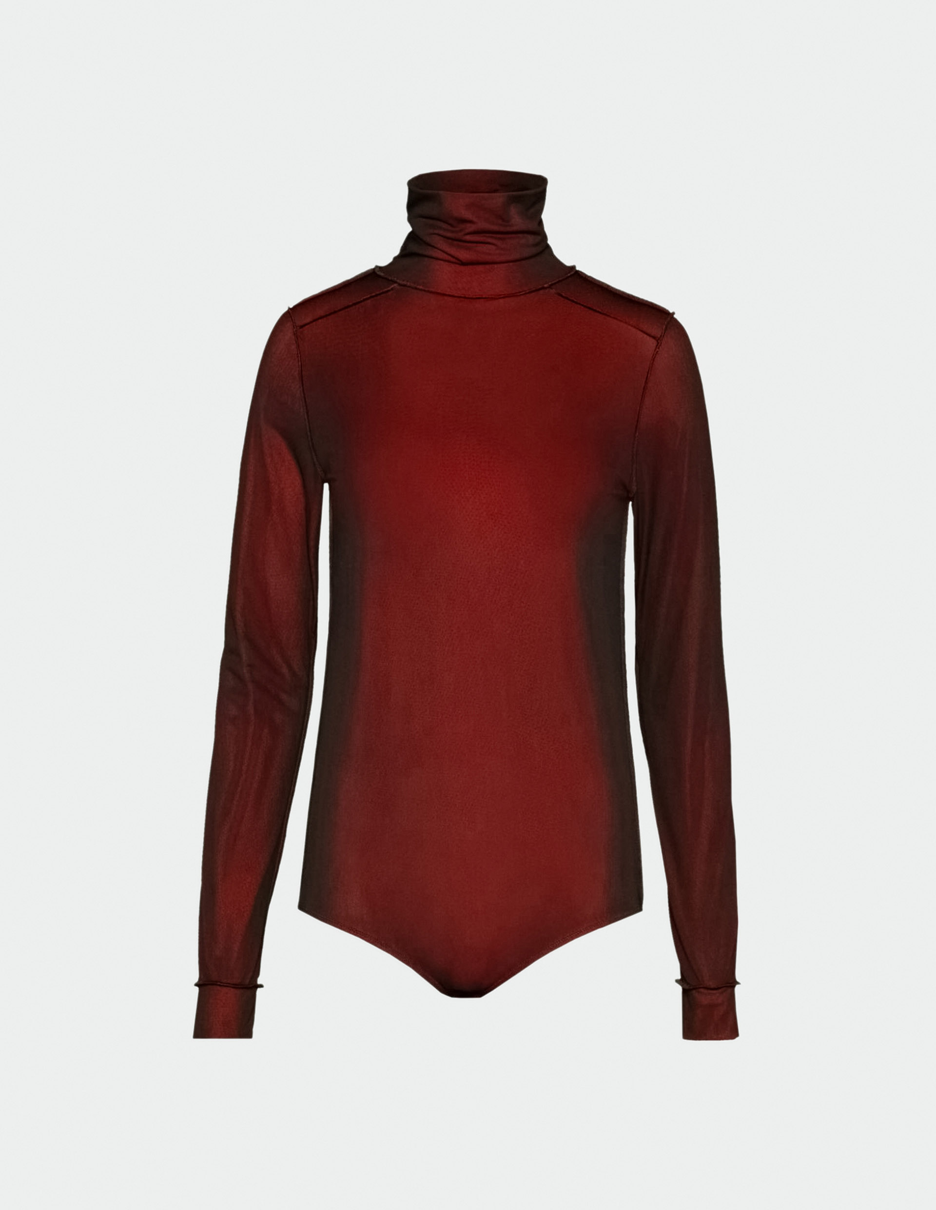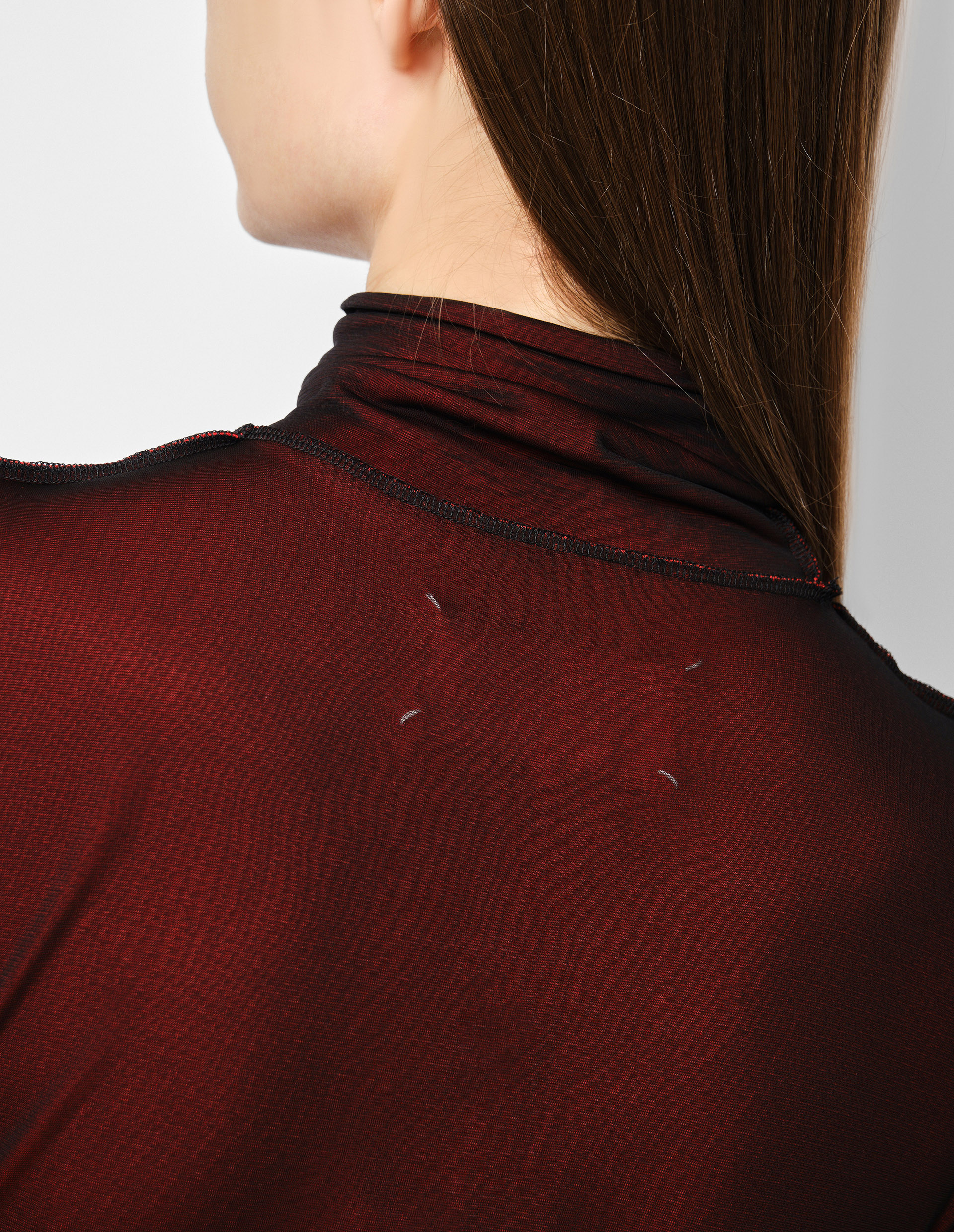 Уровень провокации и смелость брошенного вызова окружающим просто зашкаливают в бордовом полупрозрачное боди от бренда Maison Margiela. Томный и глубокий оттенок тонкой сеткой из гладкой вискозы сладострастно соприкасается с кожей, нежно и бережно облегая силуэт. Но эта дерзость искусно нивелируется дополнительным подкладом ткани, а также длинными рукавами и высоким горлом, одолженным у гольфа, чтобы уравновесить боди для комфортных и остромодных повседневных аутфитов.