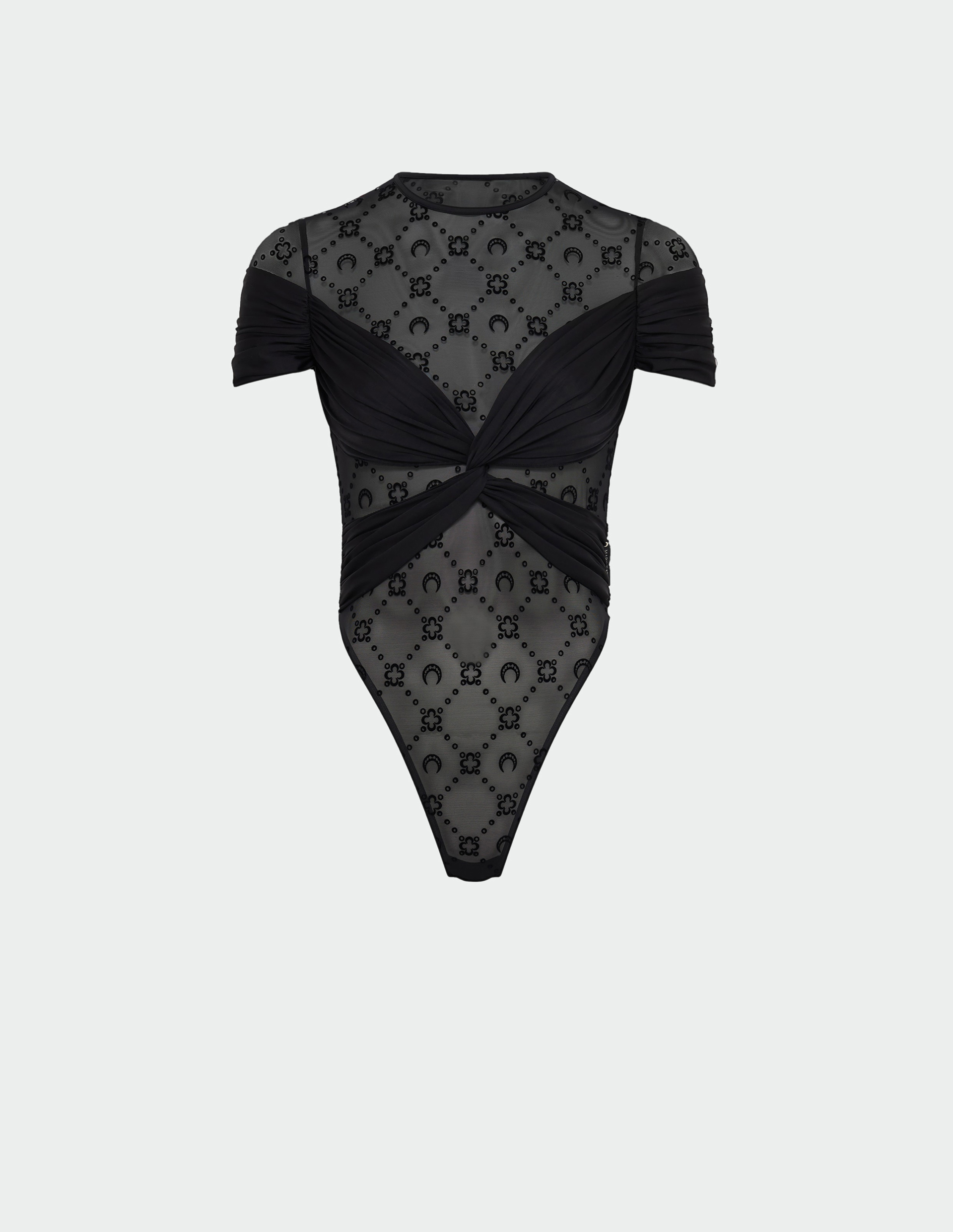 Боди, ставшее образцом трансгрессивного видения женской одежды от Marine Serre. Здесь традиционное джерси для активного отдыха возвышается посредством точных кутюрных техник, а спортивный стиль перерождается в откровенно гламурный благодаря драпированным вставкам и игре с trompe l'oeil на прозрачном mesh-трикотаже Moonogram. Он изготовлен из переработанных волокон, сертифицированных GRS. Таким образом подчеркиваются бюст и талия, движения становятся соблазнительными, полными легкости, а образы легко трансформируются от дневных к вечерним.