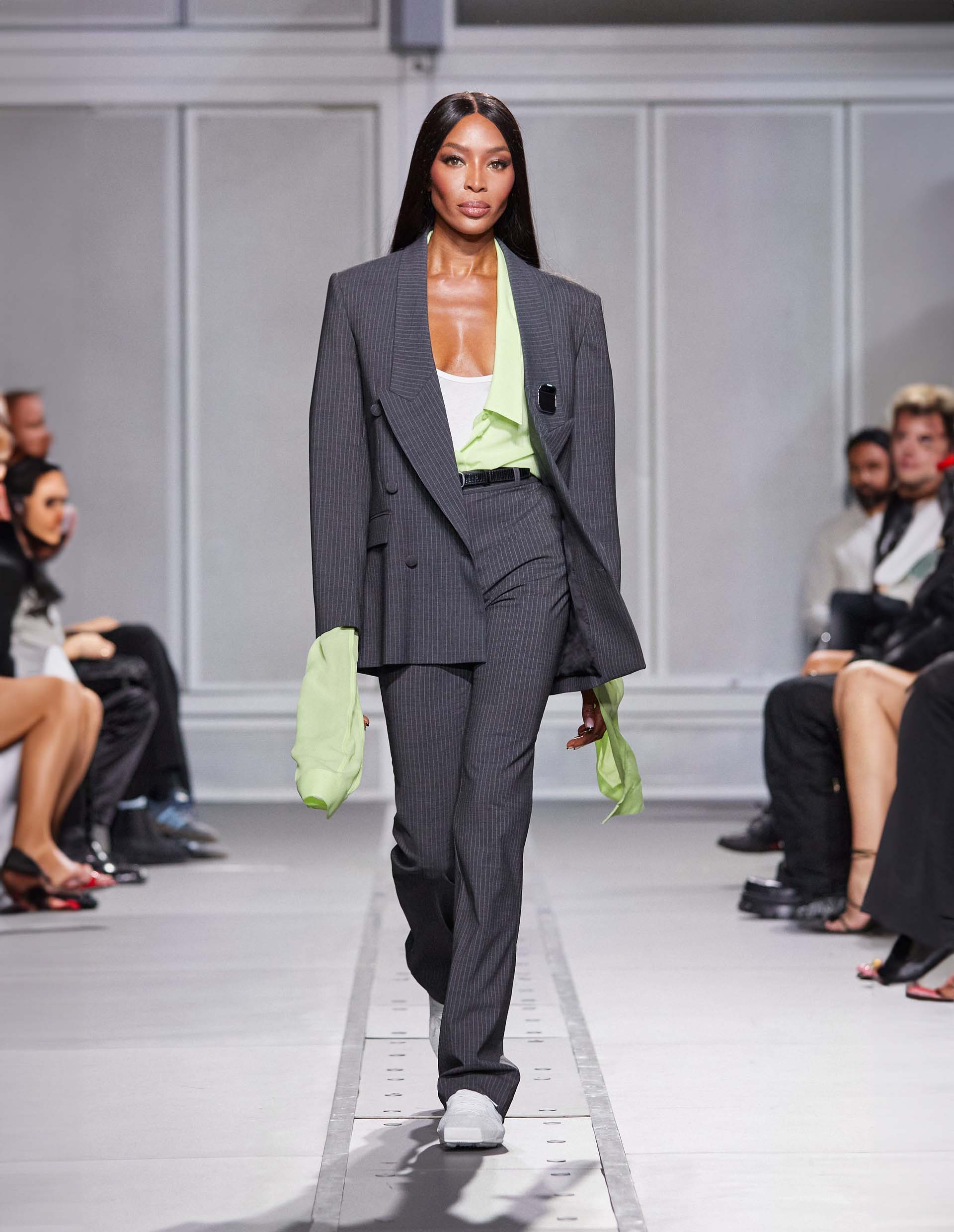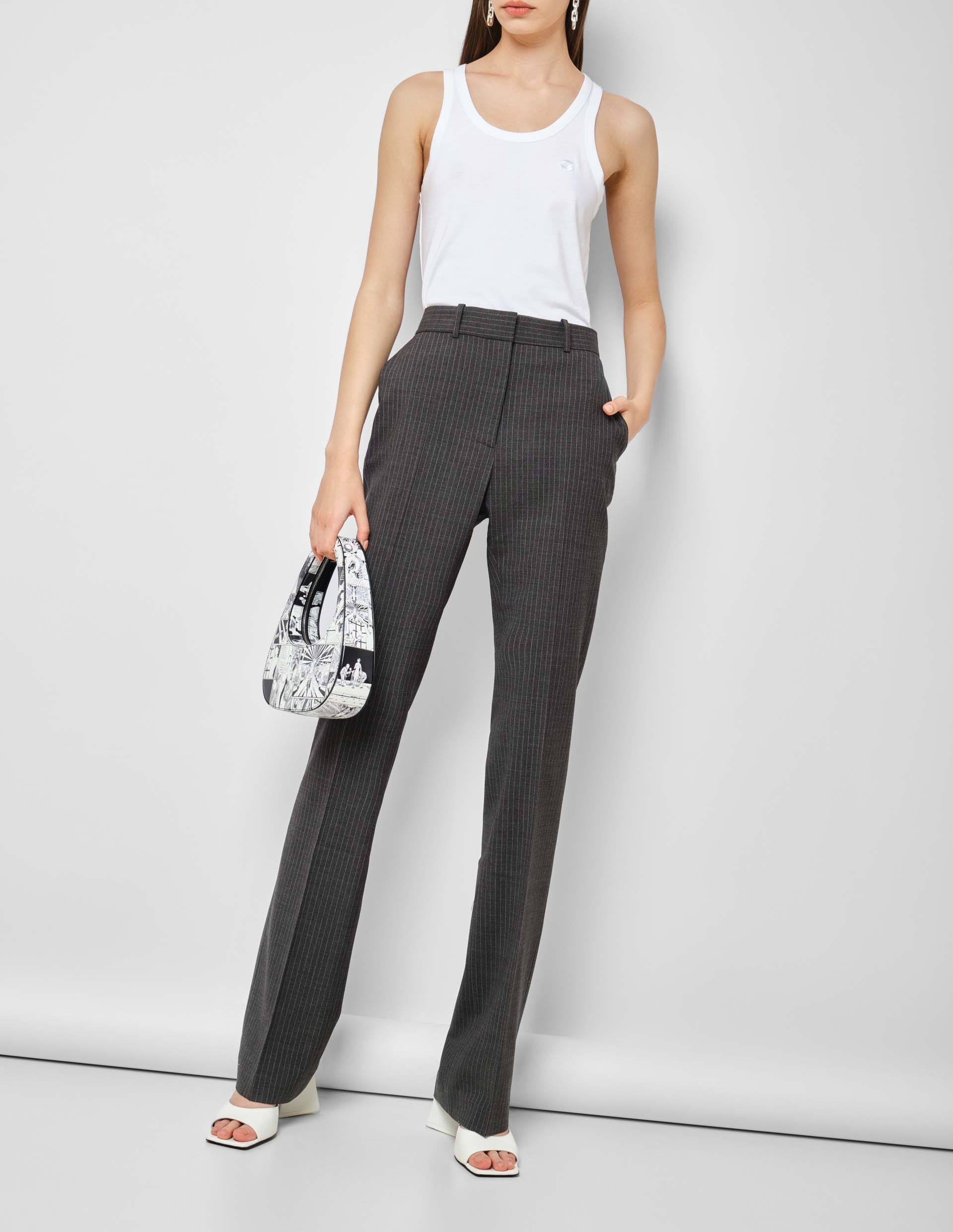 Идеальный power dressing от настоящих адептов индивидуальности и комфортно-повседневных посадок — серые прямые брюки от бренда Coperni. Именно в этой модели проходила icon моделинга Наоми Кэмпбелл на показе бренда. Самый актуальный офисный принт — тонкая вертикальная полоска в сочетании со строгими стрелками делают ноги бесконечно длинными. Прямой крой поддерживает деловой тон, а смесовая вирджинская шерсть сохраняет ощущение легкости и свободы в течение всего дня. Создайте total look как у Наоми Кэмпбелл вместе серым двубортным пиджаком в полоску от бренда Coperni.