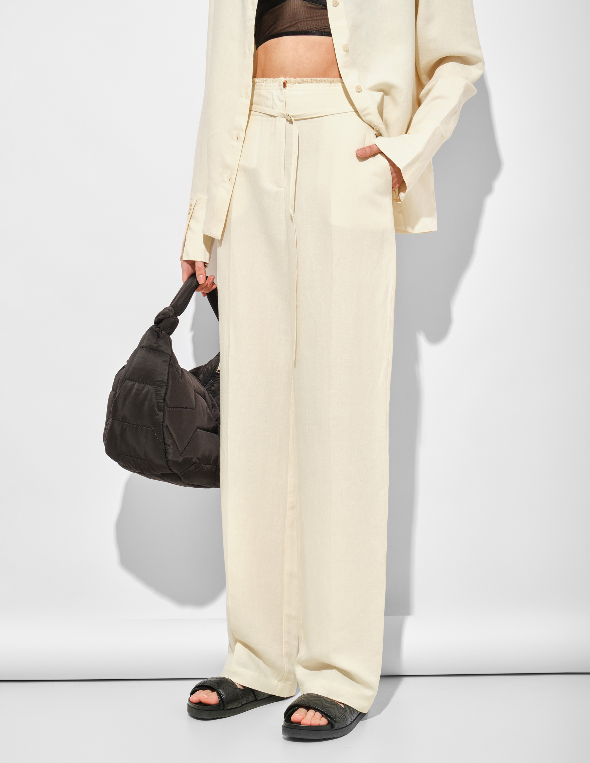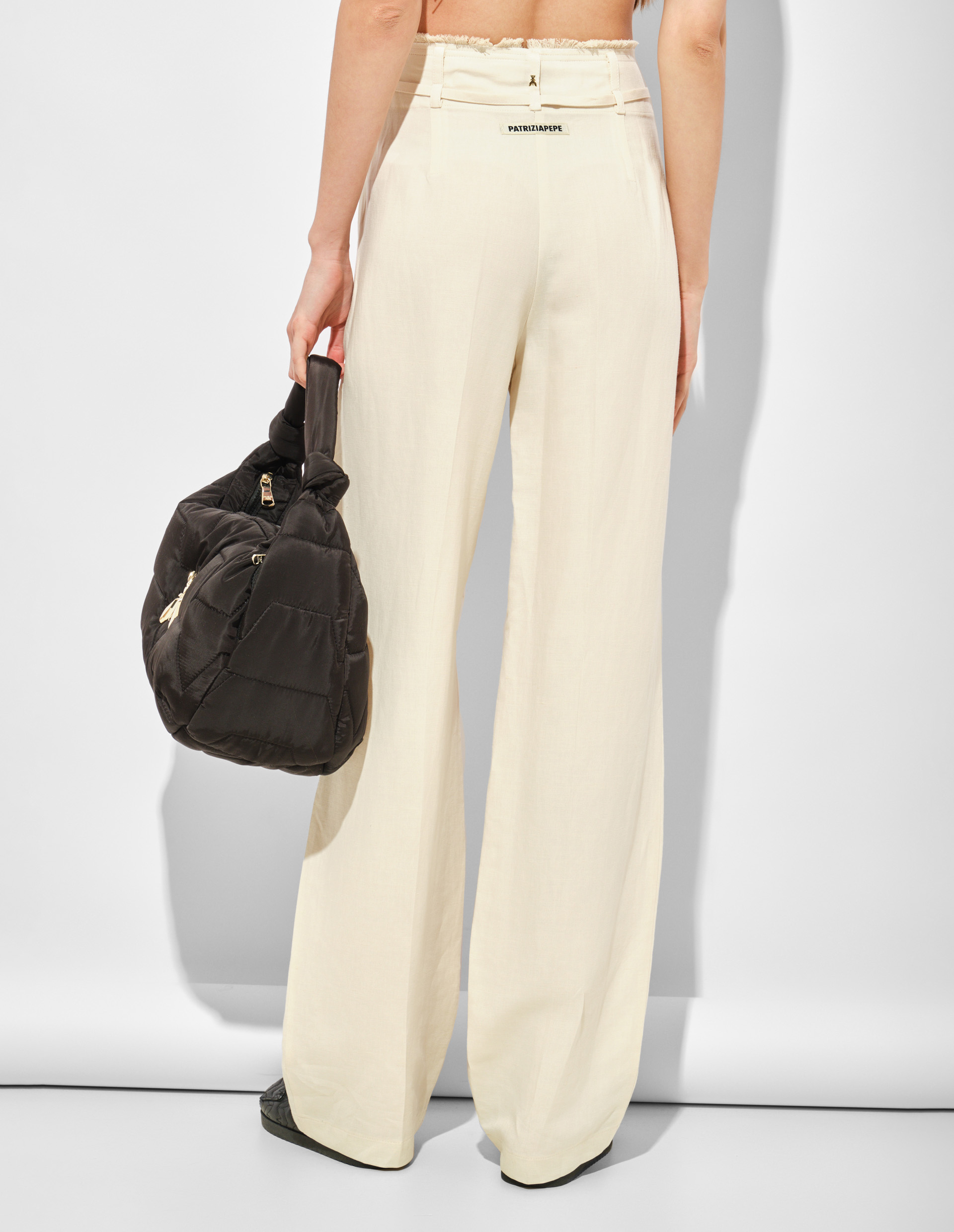 В сезоне SS25 Patrizia Pepe продолжает переосмысливать дуализм мужского и женского начала посредством непринужденной и осознанной элегантности, которая бросает вызов стереотипам и исследует истинную сущность современной женщины. Этот посыл подтверждают изысканные брюки прямого силуэта, выполненные из флюидного материала на основе льна и вискозы. Такой союз дарит бескомпромиссный комфорт и идеальную посадку, а пояс детализирован бахромой и двумя ярусами шлевок, чтобы вы могли выбрать, в какой из них продеть тонкий тканевый ремешок. Сзади модель украшена фирменным патчем и культовой мушкой Fly, символизирующей безупречное качество Made in Italy.