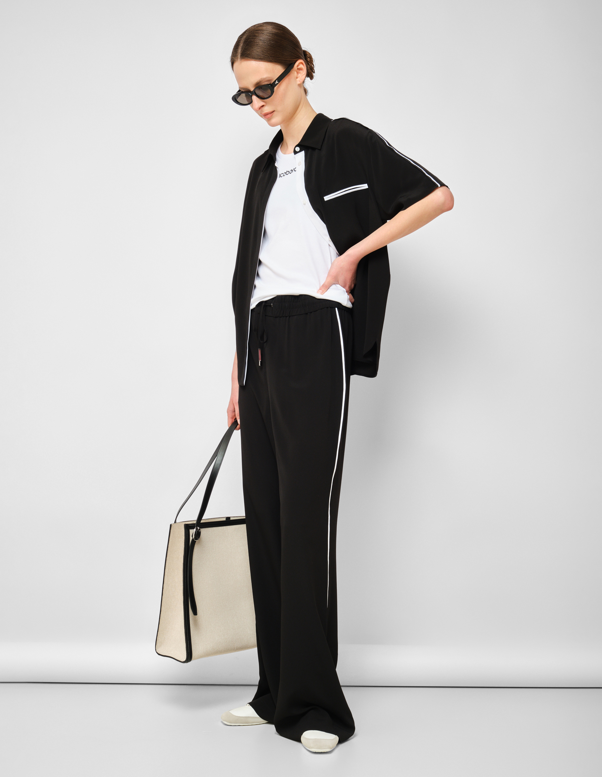 Спортивный шик в своем самом элегантном воплощении. Эти брюки от ICEBERG переосмысливают расслабленную эстетику athleisure, поднимая ее на уровень люксовой повседневности. Глубокий черный цвет — абсолютная база, идеальный фон для графичных белых акцентов. Две вертикальные полосы по бокам, классические лампасы, задают четкий ритм и визуально вытягивают силуэт, делая ноги бесконечно длинными. Широкий крой создает тот самый летящий, скульптурный силуэт, который сейчас на пике моды — брюки струятся при каждом шаге, добавляя образу драматической легкости. Модель выполнена из легкой, почти невесомой ткани высшего качества, которая идеально драпируется и не создает лишнего объема. Мягкий пояс на широкой резинке обеспечивает идеальную посадку и максимальный комфорт в течение всего дня. Эти брюки задуманы как часть костюма с рубашкой из аналогичной ткани, и в комплекте они создают тотальный образ в духе современной спортивной элегантности. Но и соло они работают безупречно, становясь идеальной базой для экспериментов с верхом. Сегодня мода на комфорт и функциональность достигла новых высот — эти брюки доказывают, что удобство не означает компромисс со стилем. Носите их с классическим пиджаком и белой футболкой для создания контраста строгости и расслабленности или с топом и босоножками для вечернего выхода. Белые лампасы поддержат любую графичную деталь в образе. Польза этой вещи — в ее универсальности: она одинаково уместна в офисе с мягким дресс-кодом, на прогулке и на светском мероприятии. Важный нюанс: легкая ткань требует бережной стирки в холодной воде, но награждает владельца непревзойденным комфортом в теплую погоду. Белые лампасы выполнены из того же качественного материала и не деформируются после стирки. Широкая резинка на поясе не растягивается и сохраняет эластичность долгие годы. Брюки идеально сидят на талии, не сползая и не пережимая.