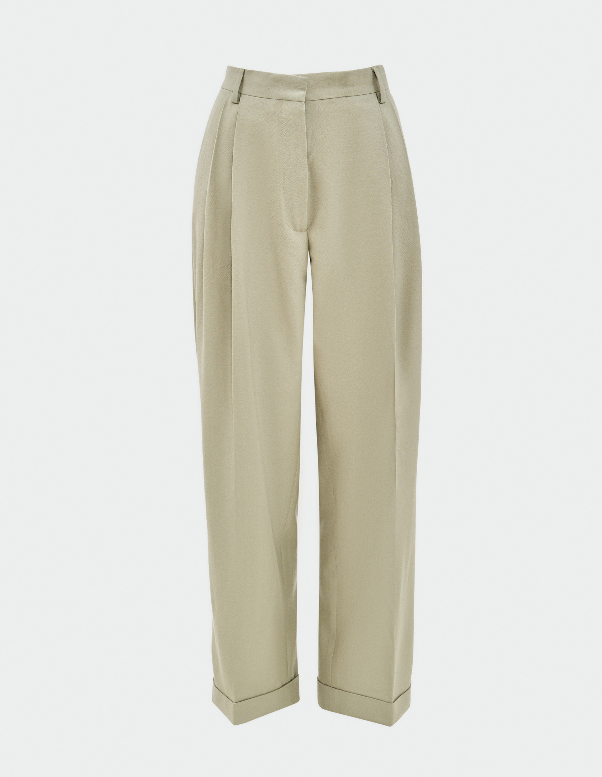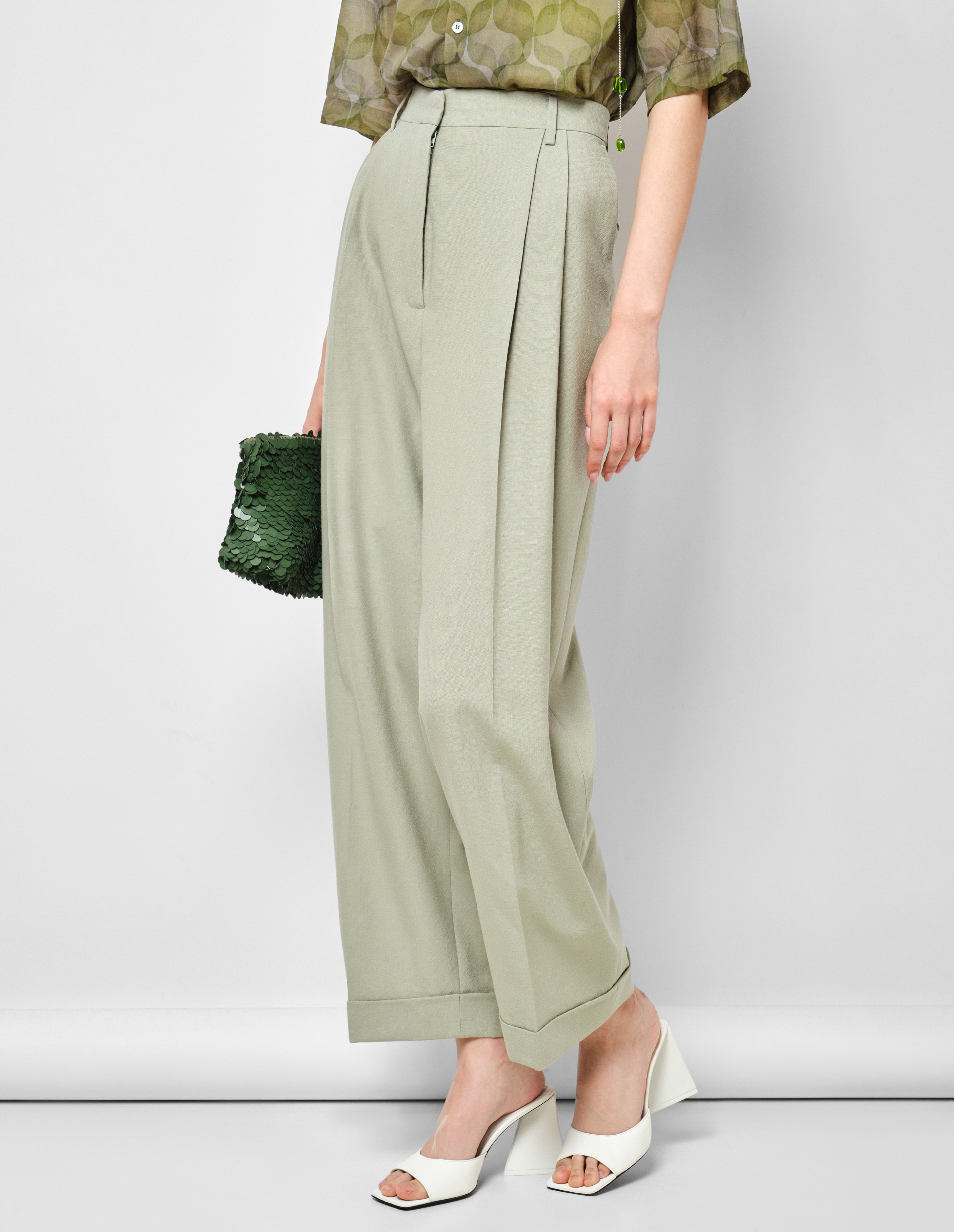 Широкие брюки PARTAN от культового бренда Dries Van Noten создают то самое летнее и уютное настроение, которое взбудоражит повседневные аутфиты, добавив им легкости, живости и естественности. Все дело в благородном мятном оттенке Peppermint от института цвета Pantone, который пленяет своей мягкостью и нежностью. Даже острые защипы на широком крое изделия кажутся более расслабленными, но не теряют свою функциональность и визуально вытягивают силуэт. Стильные отвороты добавляют непринужденности и открывают изящные женские щиколотки.