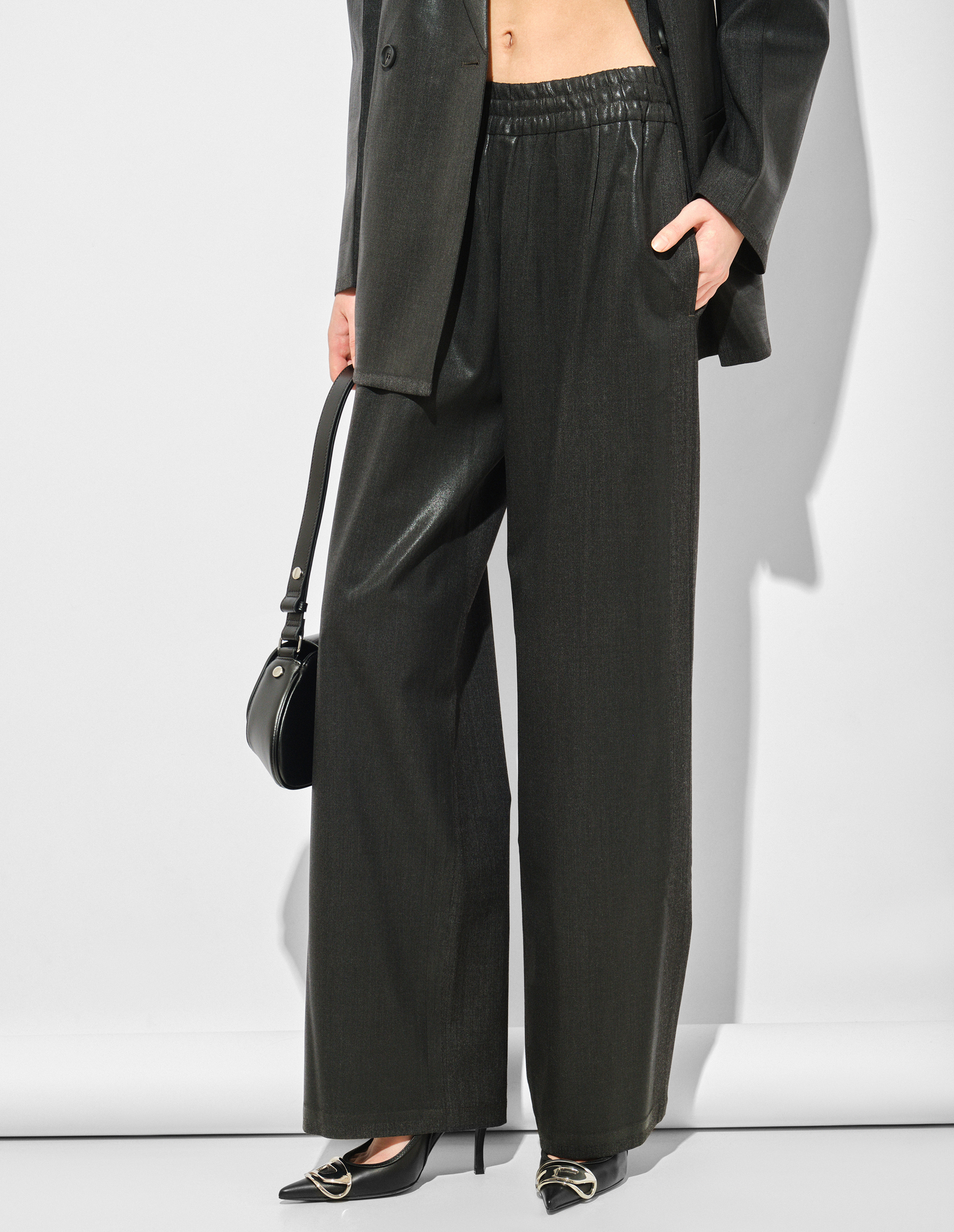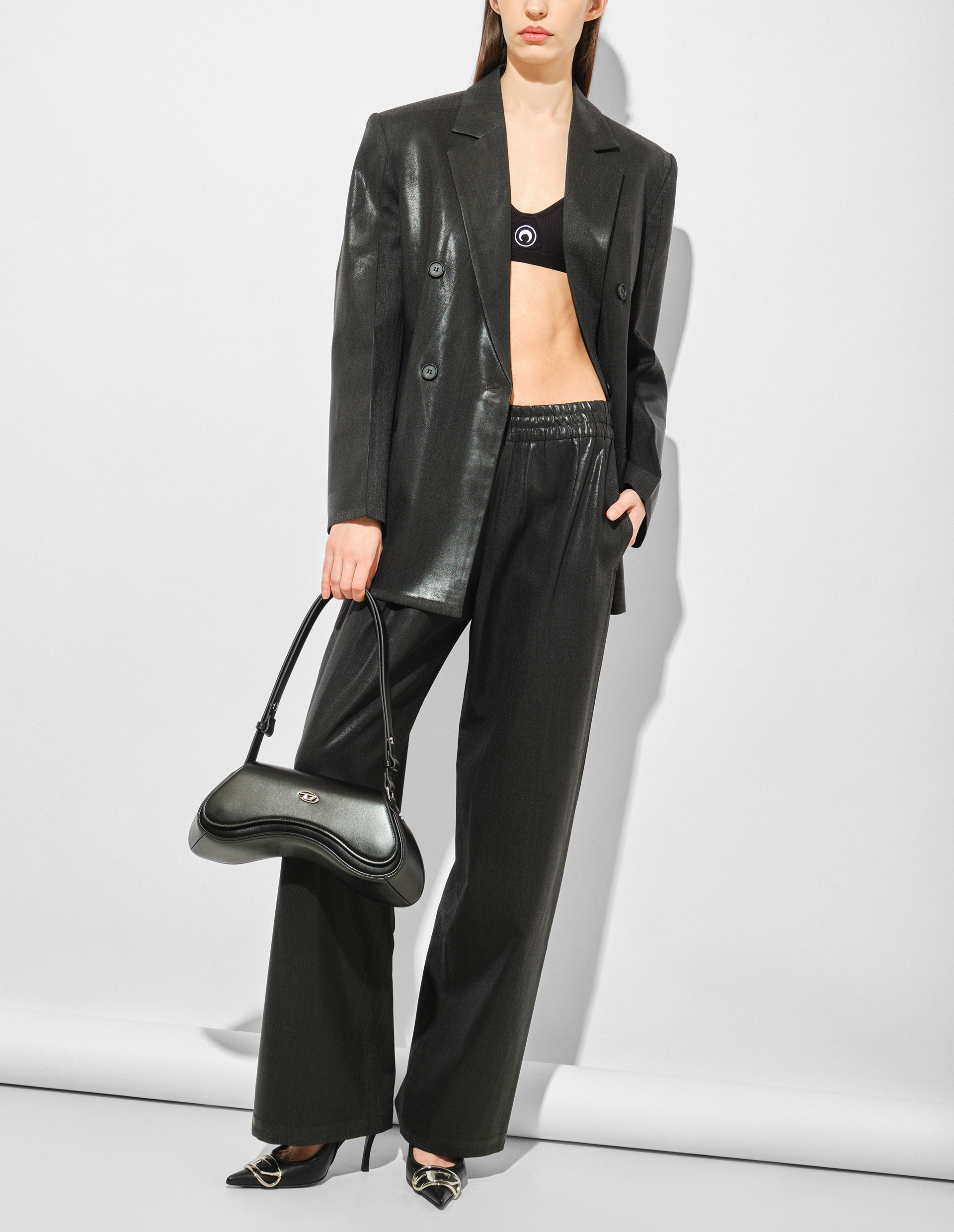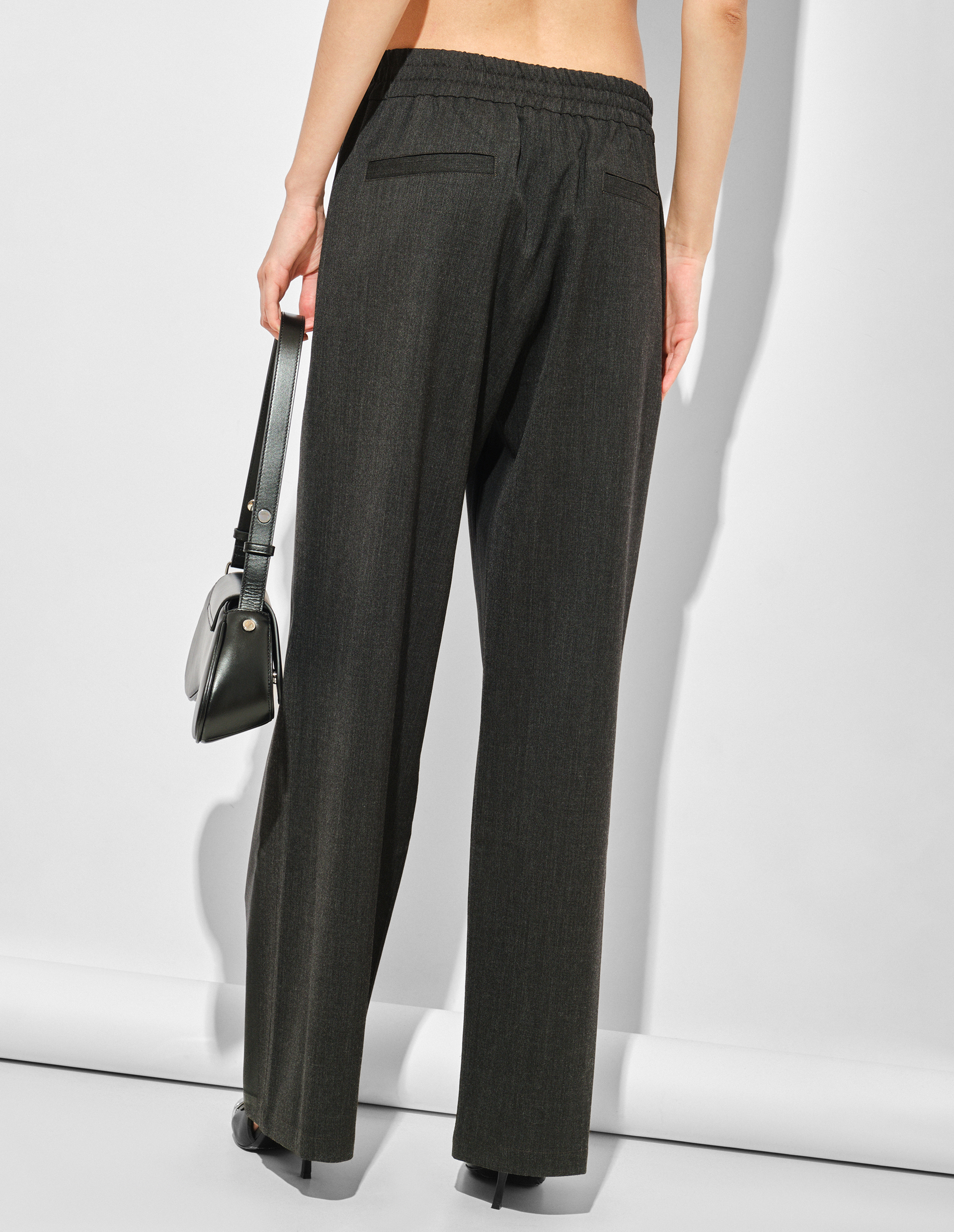 Прямые свободные брюки P-DREY изготовлены из смеси натуральной шерсти и спандекса. Этот материал мягкий и уютный, дополнительно обработан спереди тональным покрытием, нанесенным методом горячего прессования для гламурного эффекта. Такая односторонняя отделка полностью преднамеренна и вносит элемент роскошного несовершенства в духе бунтарского бренда. Эластичный пояс обеспечивает удобную индивидуальную посадку. Прорезные боковые и задние карманы, а также вручную пришитый металлизированный логотип Oval D завершают дизайн.