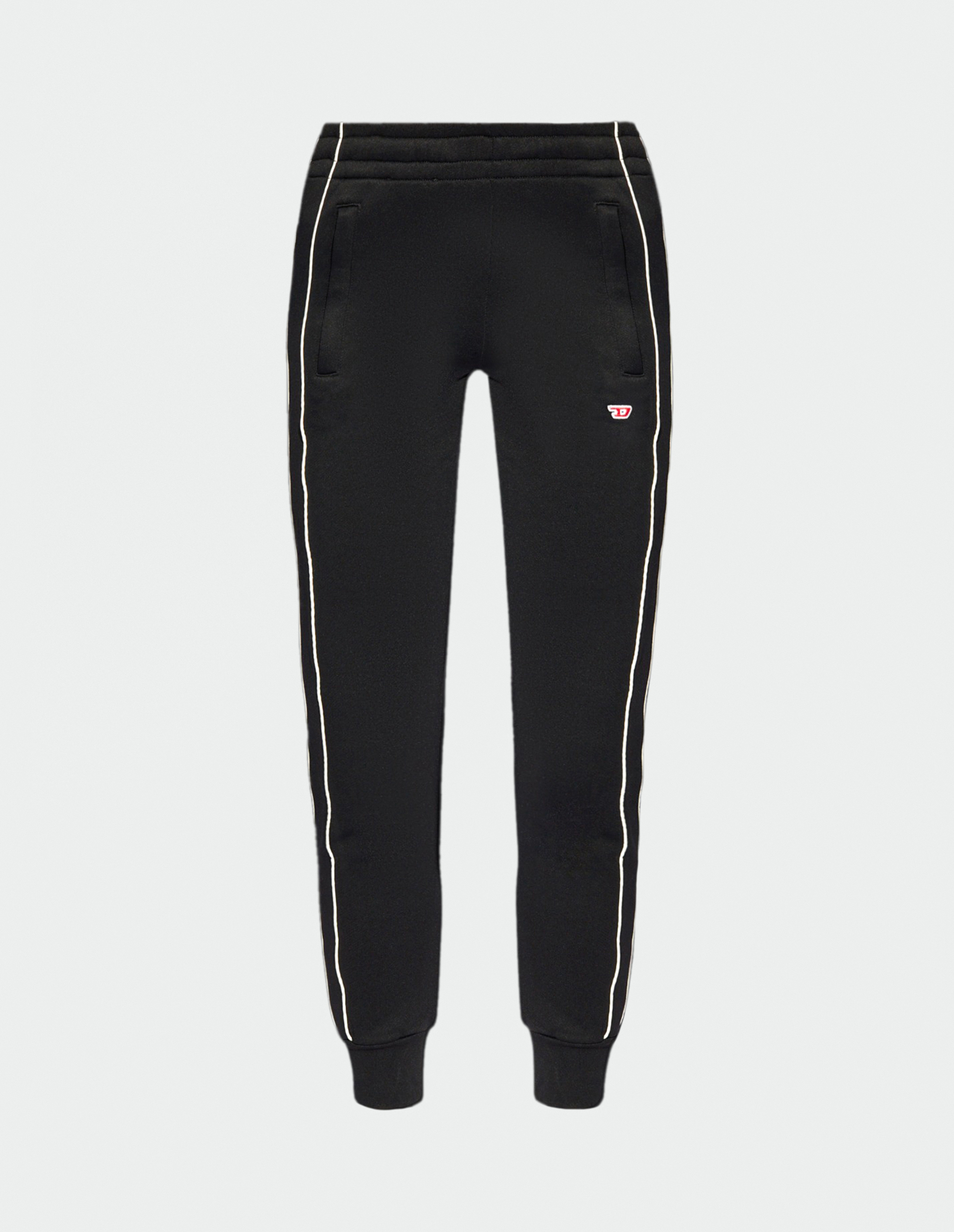 Джоггеры Diesel P-JAM-PIPING-D — шедевр современной урбанистической моды, сочетающий комфорт с элегантной эстетикой. Эти черные зауженные брюки изготовлены из высококачественной смеси хлопка и нейлона с гладкой текстурой. Контрастная белая окантовка, проходящая вдоль внешних швов, добавляет спортивный характер, удлиняя силуэт, формируя непринужденно-шикарный образ.