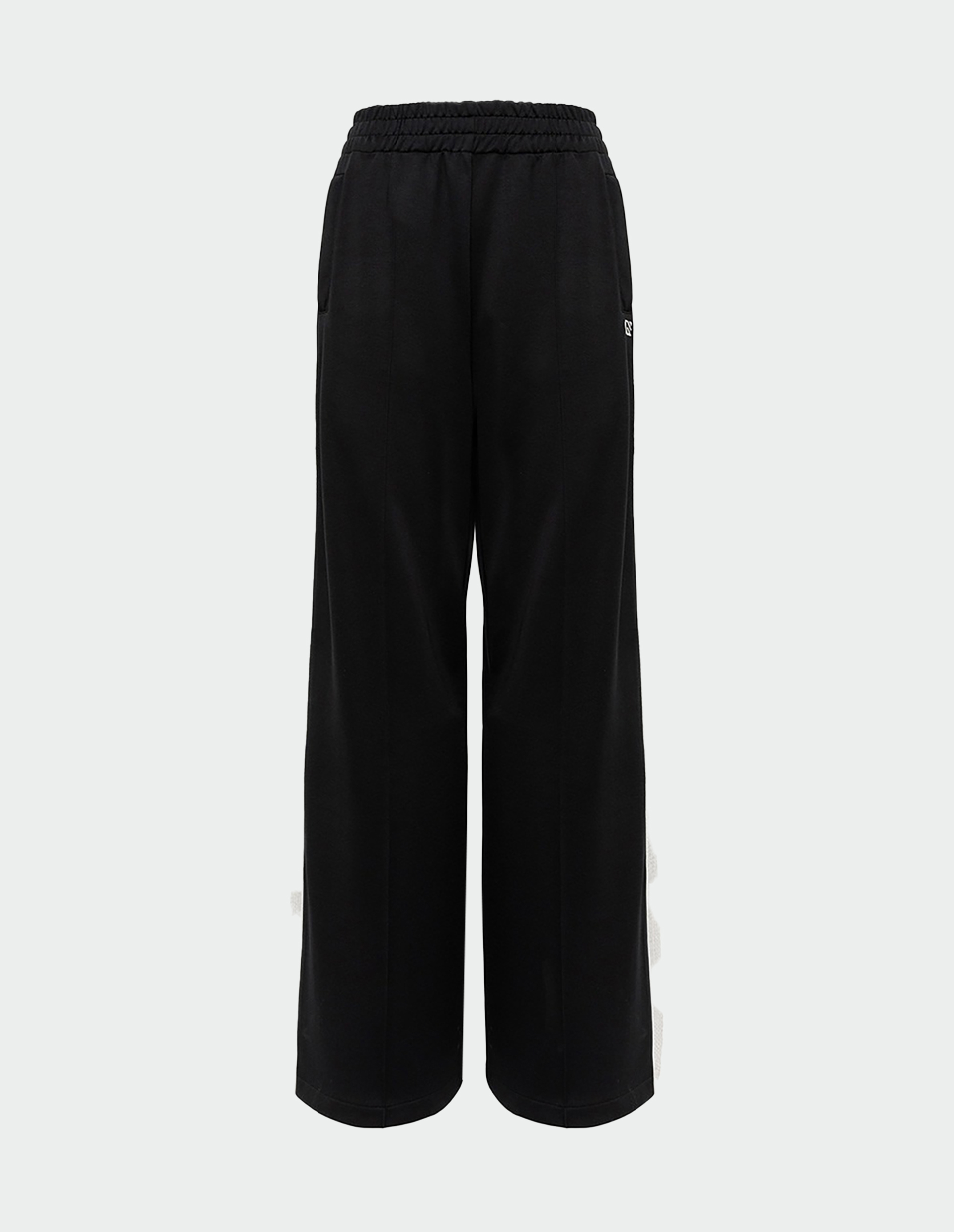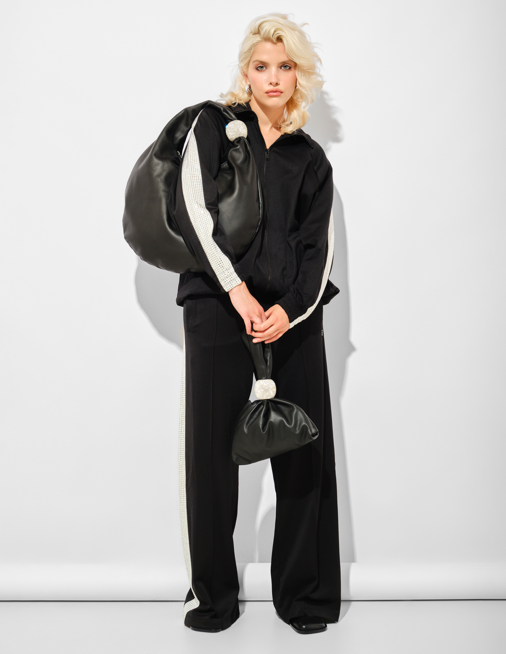 Новое направление сезона весна-лето 2026: эти брюки Giuseppe Di Morabito представляют собой обновленную версию классического ацетатного флиса в стиле sport glam. Модель прямого силуэта с эластичным поясом и простроченными стрелками дополняется контрастными полосками по бокам, украшенными стразами. Результат — смелое сочетание комфорта, свободы движений и изысканной детализации, выводящих спортивную одежду на новый, изысканный уровень.