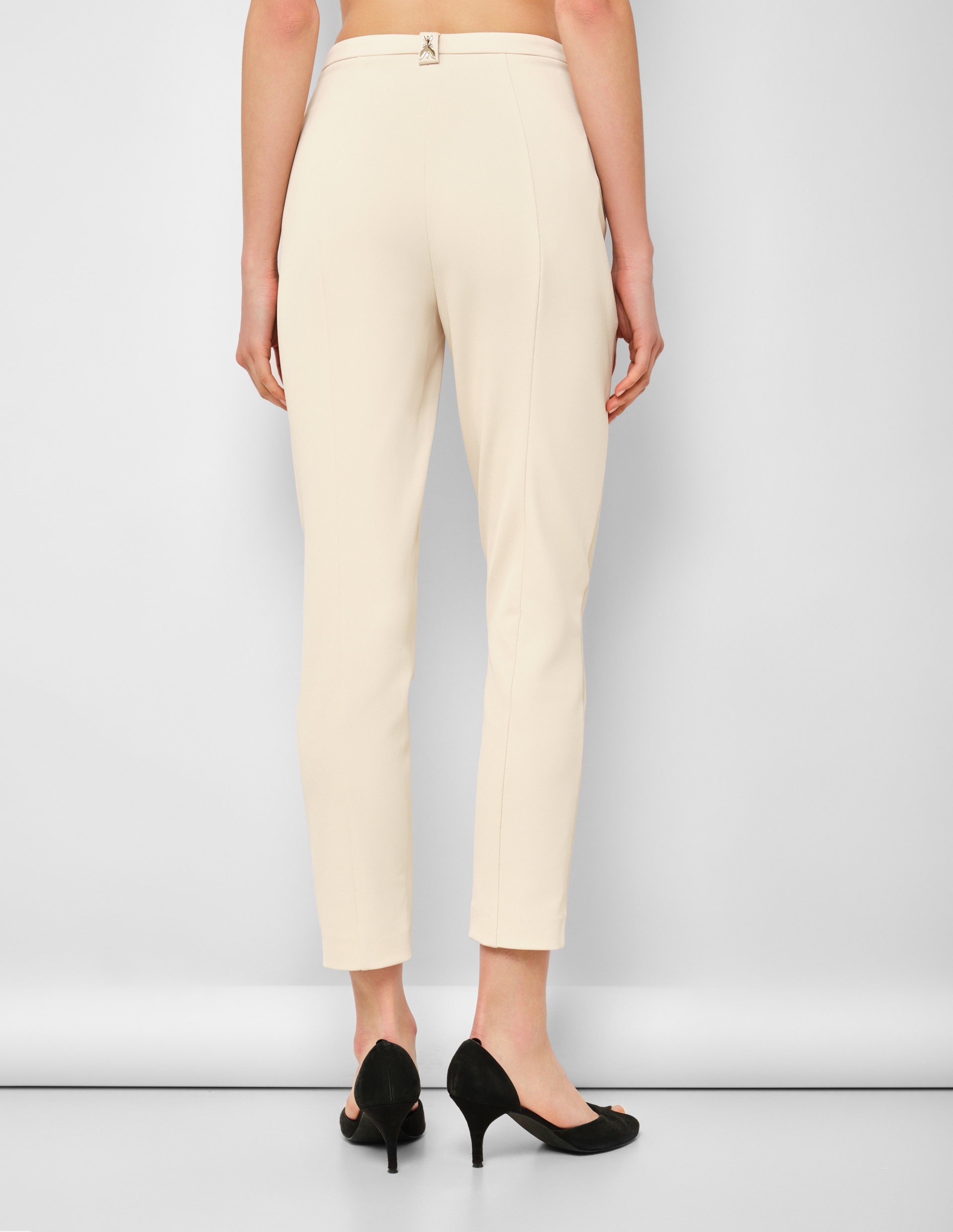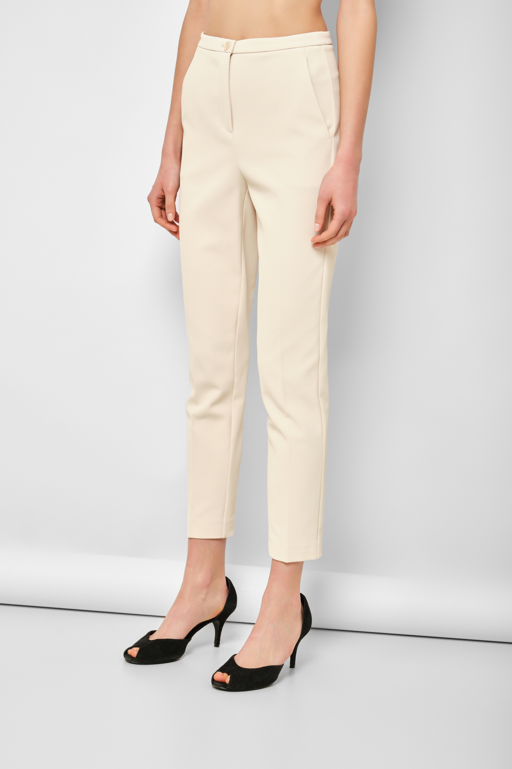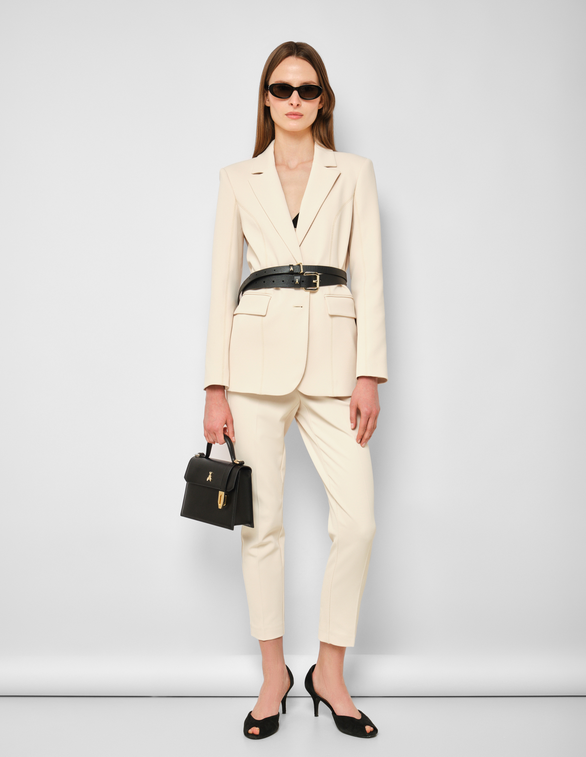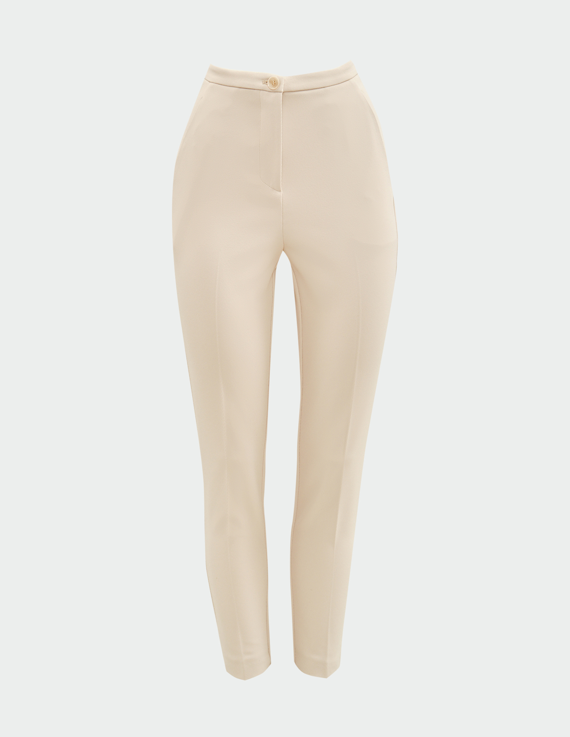 Новый взгляд на костюм-двойку. Узкий, идеально выверенный силуэт брюк облегает фигуру с математической точностью, создавая чистый, графичный контур. Главная деталь — передняя стрелка, которая работает не просто как декоративный элемент, а как архитектурная ось, визуально удлиняющая ноги и придающая образу собранность и дисциплину. Бежевый цвет, нейтральный и благородный, становится идеальным фоном для построения сложных многослойных образов — от офисной классики до вечернего авангарда. Стрелка — элемент, пришедший из классического мужского гардероба, сегодня переживает новое рождение: она добавляет даже самым расслабленным образам нотку строгости и интеллектуальной чёткости. Узкий крой — это ответ на запрос на универсальность: такие брюки одинаково хорошо работают и с объёмным свитером, и с шёлковой блузой, и с жакетом с преувеличенными плечами. Бежевый цвет остаётся главным героем сезона, предлагая бесконечные возможности для комбинирования и создавая эффект спокойной, уверенной элегантности.