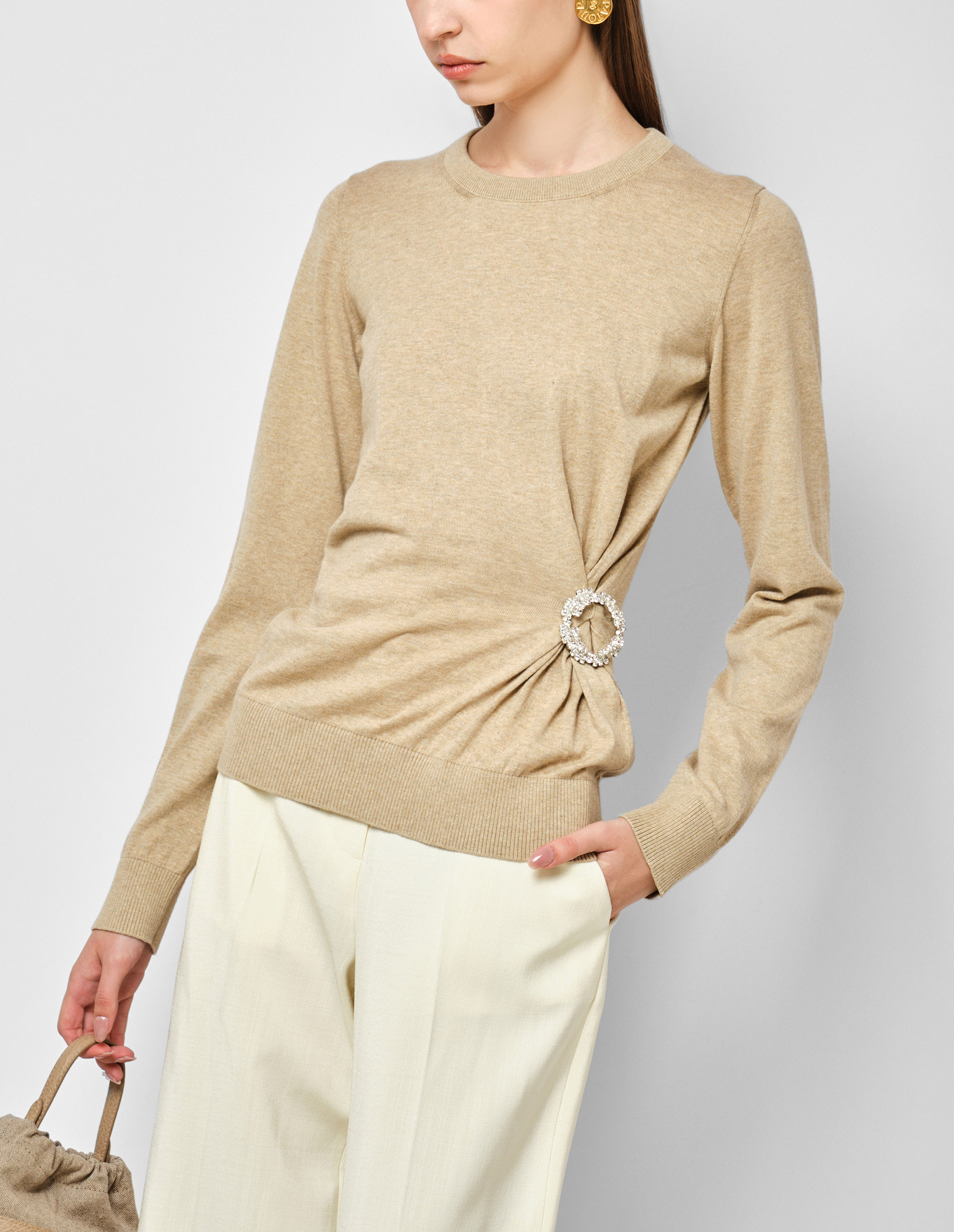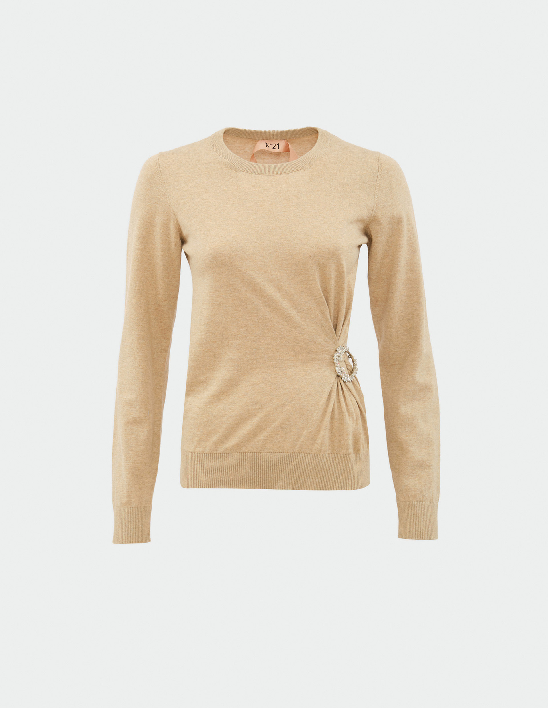 В исполнении бренда №21 минималистичный бежевый джемпер получился подчеркнуто женственным и лаконичным. Всего один акцентный элемент, в виде небольшой блестящей броши на левом боку, способен полностью изменить настроение модели и нарочито стильно очертить изящный силуэт фигуры. Изделие выполнено из тонкого трикотажа, в составе которого находится натуральный мягкий хлопок, который искусно собирается в элегантную драпировку на талии, а ребристые манжеты придают джемперу форму.