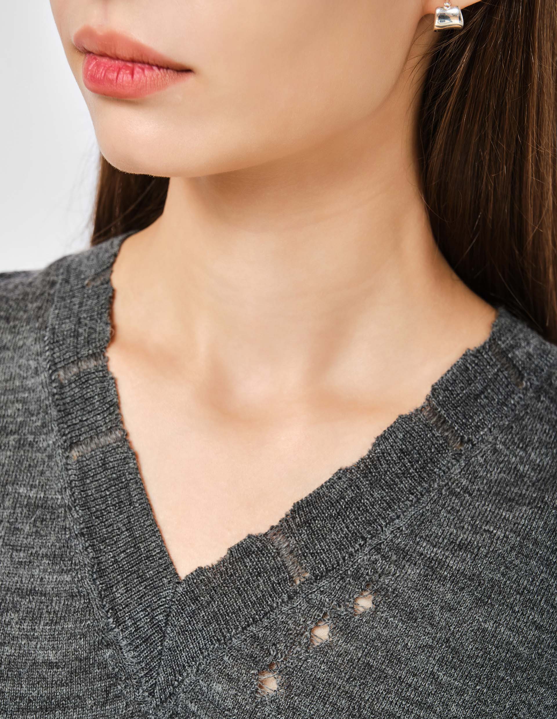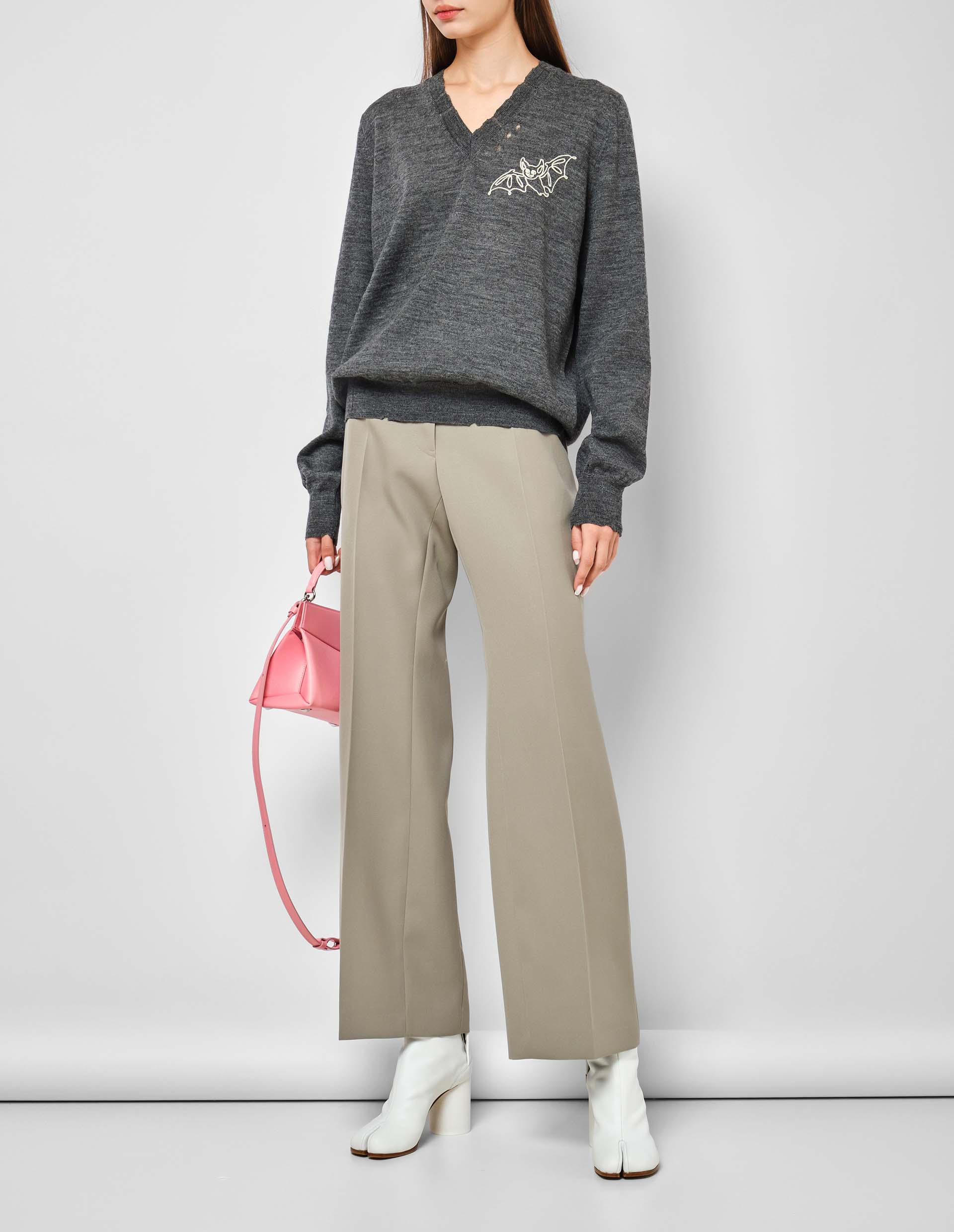 Набирающий повторную популярность стиль гранж привносит свое очарование и в подиумные коллекции знаменитых модных домов, как парижский Maison Margiela, который точно не боится ярких экспериментов. Результатом вдохновения этой эстетикой стал серый джемпер с вышивкой. Слева на груди красуется маленькая летучая мышка, которая будто бы сама искусно нанесла небольшие потертости и дыры на изделие. Большие ребристые манжеты на рукавах и талии в сочетании с глубоким V-образным вырезом добавляют еще большей расслабленности джемперу. Материал в трендовом меланжевом цвете выполнен из 100% натуральной шерсти, которая сохраняет естественное тепло и мягко ощущается на коже.