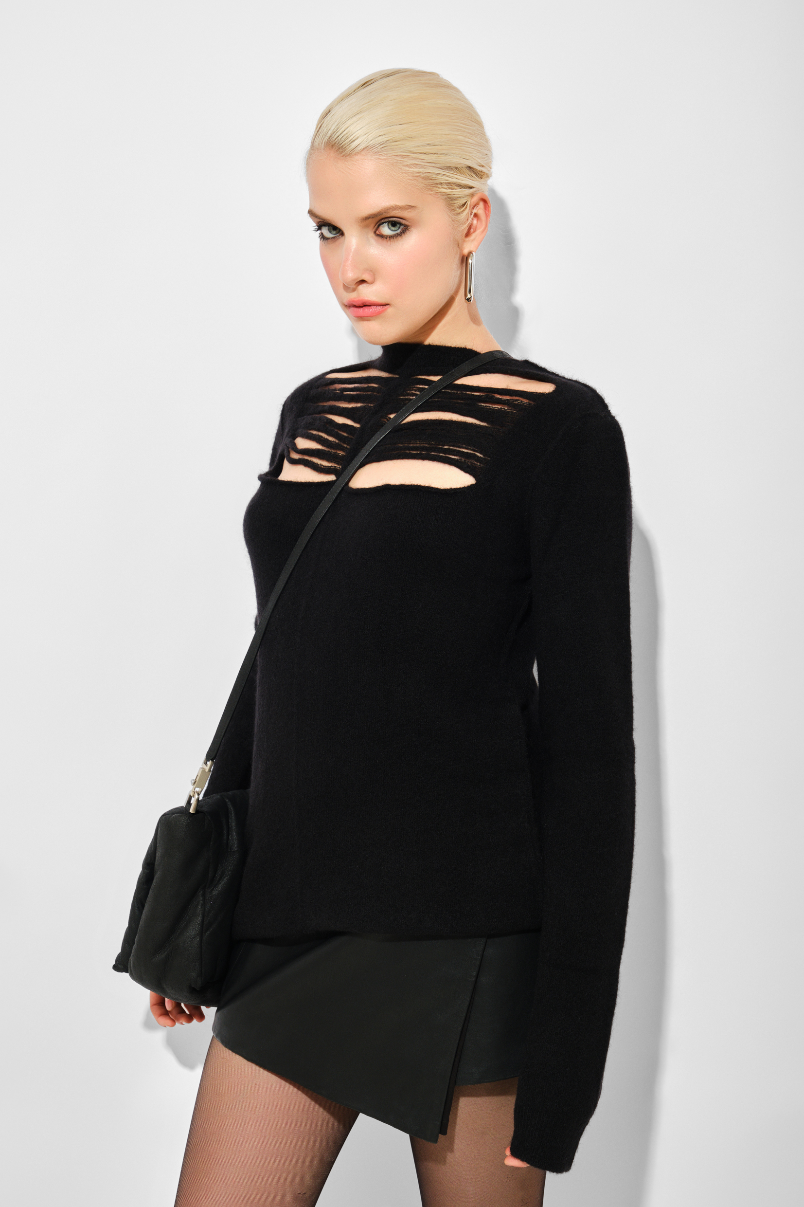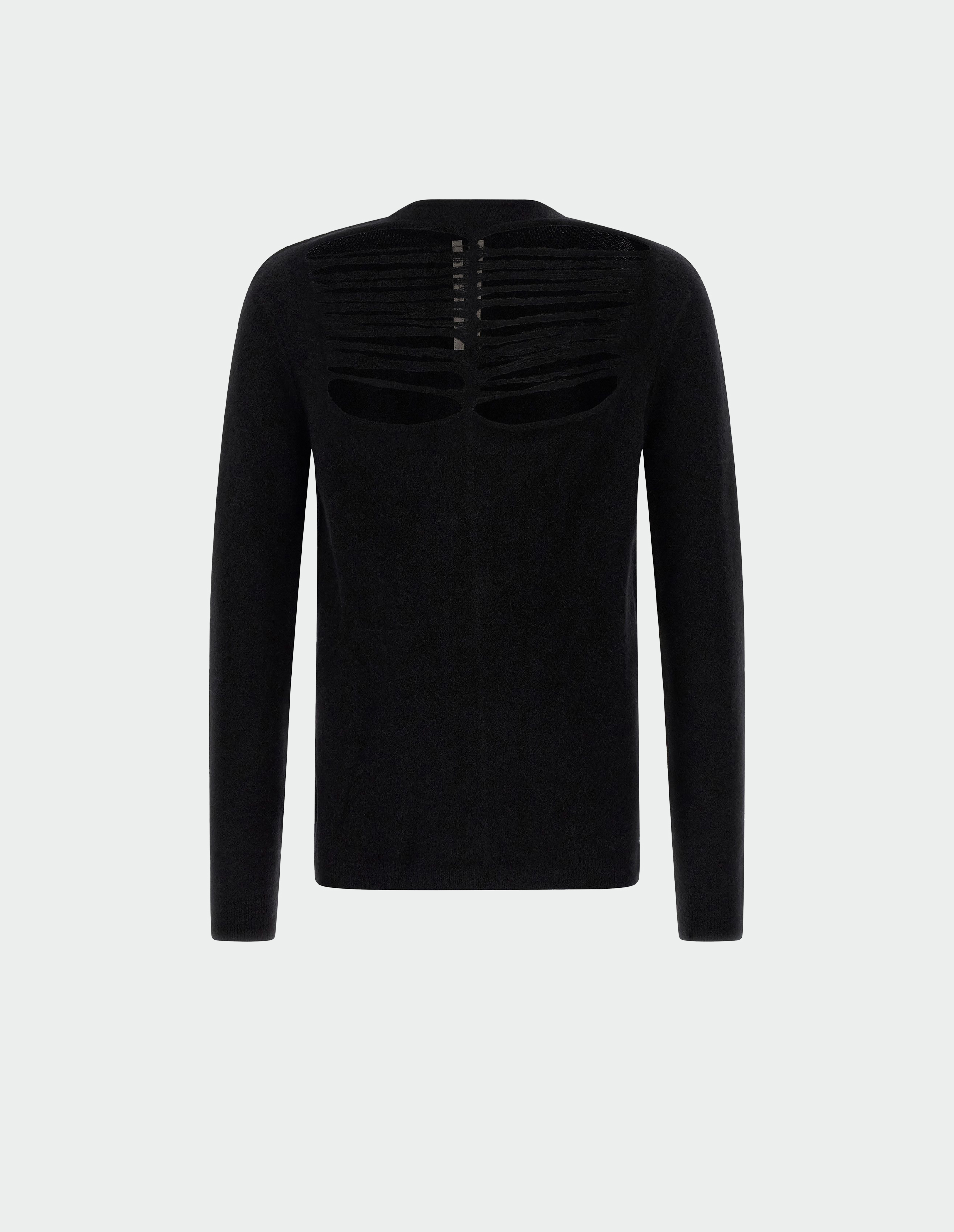 Лонгслив из коллекции FW25 Concordians выполнен на основе альпаки с использованием актирного резинчатого узора, который ритмично меняет плотность по всей поверхности. Эластичное полотно создает сложную топографию: зоны с разной степенью растяжимости образуют объемный рельеф, обеспечивающий идеальную посадку по фигуре. Открытые участки в области груди формируют сложную игру обнажения и прикрытия, а удлиненная спинка с центральным швом подчеркивает анатомическую пластику. Модель демонстрирует характерный для Оуэнса подход, где базовый предмет наполняется сложностью за счет инженерного кроя и контрастных текстур, сохраняя функциональность повседневного гардероба.