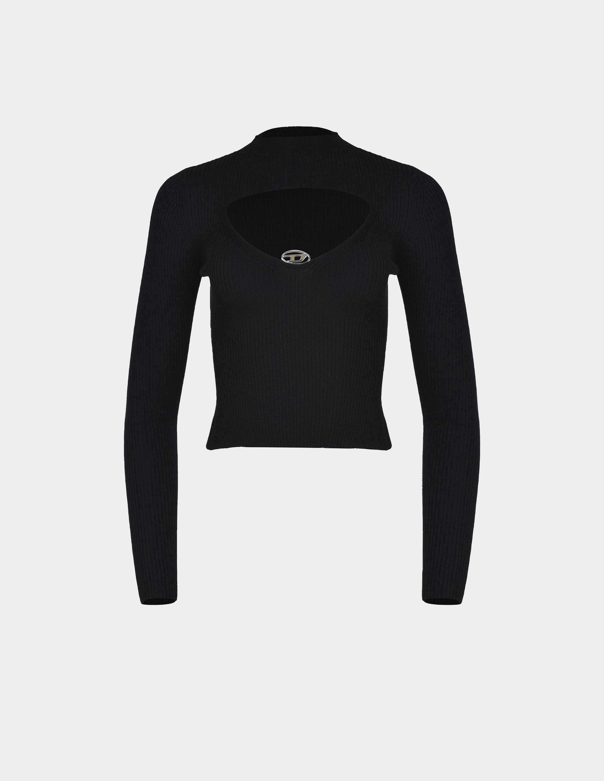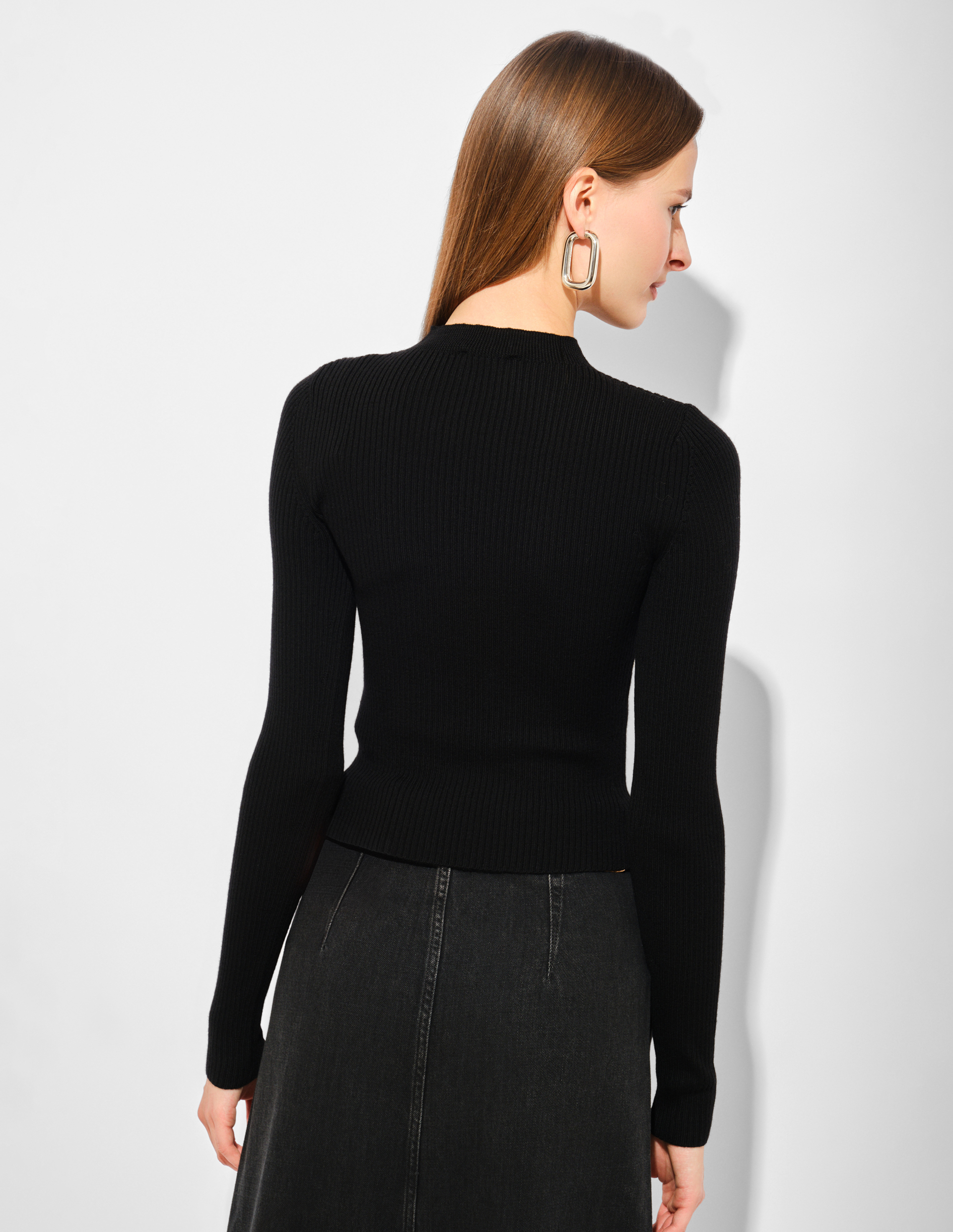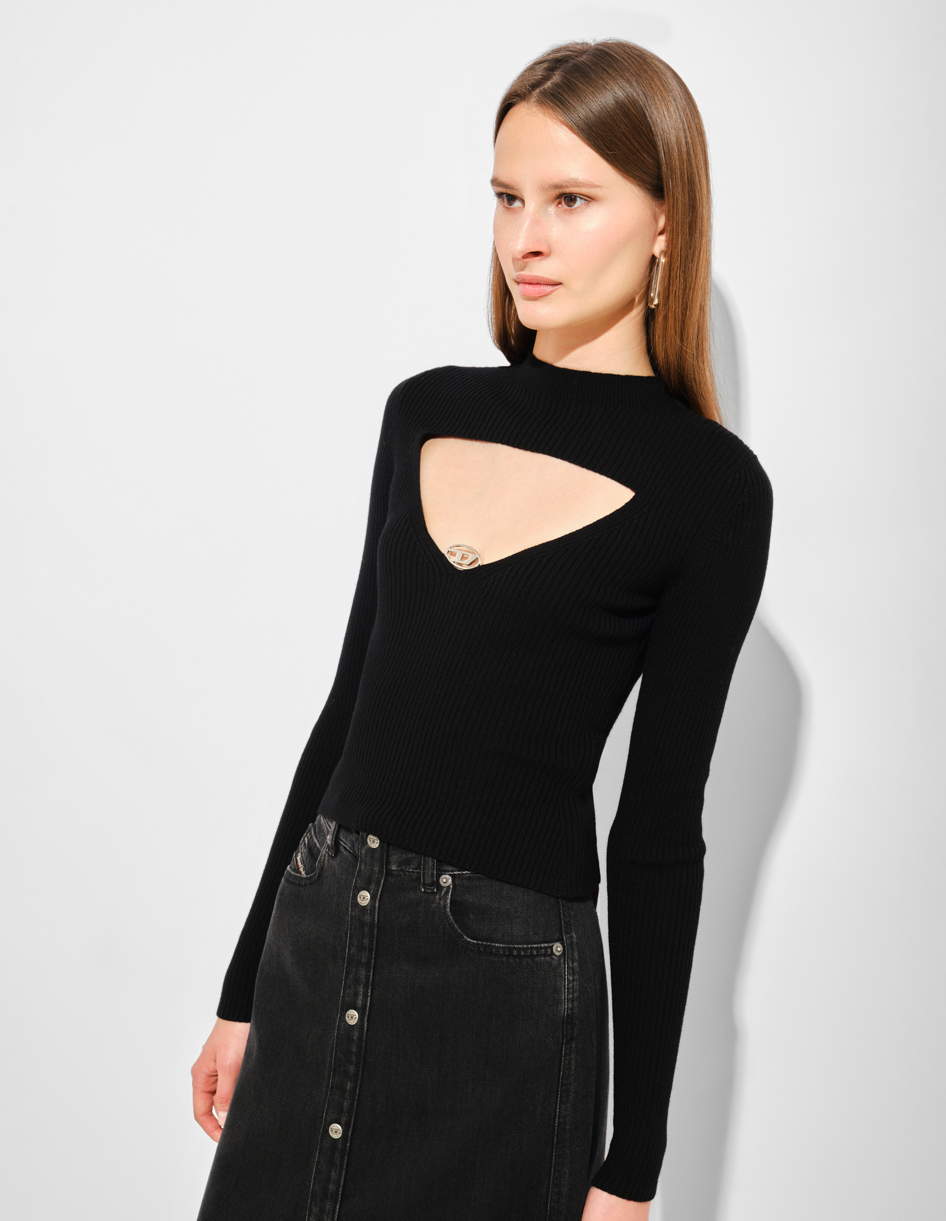 Этот джемпер из ребристого трикотажа имеет воротник-стойку и эффектный треугольный вырез, в основании которого расположен металлический логотип Oval D — украшение минималистичное, но продуманное. Модель облегающего силуэта связана из 100% шерсти, полученной ответственным образом с ферм, где соблюдаются принципы гуманного обращения с животными и рационального использования земельных ресурсов.