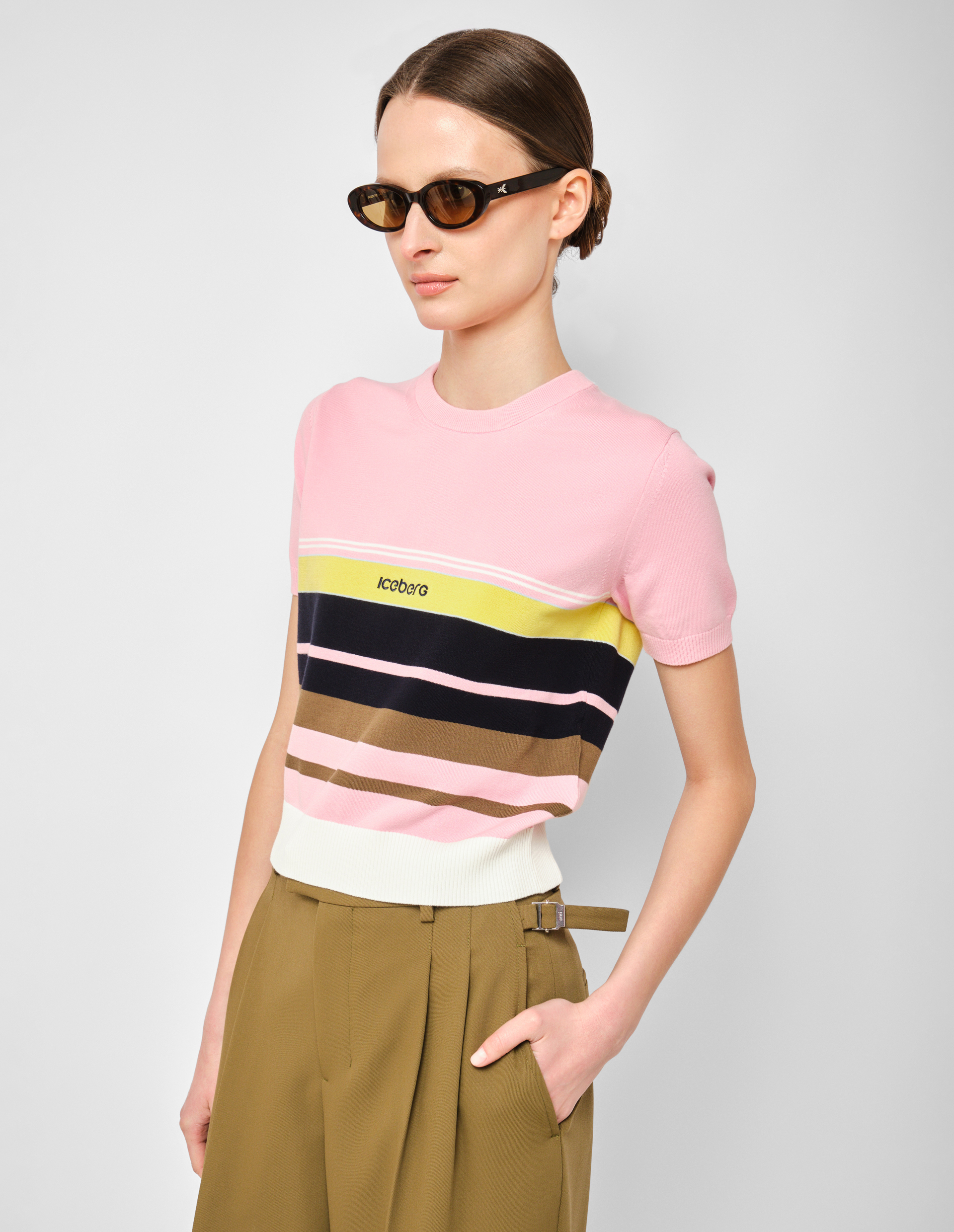 Полосатый ритм и итальянская беззаботность. Этот джемпер от ICEBERG впускает в гардероб энергию средиземноморского побережья, где цвет правит миром, а комфорт становится главной роскошью. Мягкий розовый фон — нежный, но не приторный — служит идеальной основой для графичных цветных полос, которые опоясывают модель горизонтальными линиями, задавая динамику и визуально структурируя силуэт. Контрастная окантовка по краям рукавов и горловины добавляет четкости и завершенности, словно произведение искусства в идеально подобранной раме. Модель выполнена из мягкого стретч-хлопка — ткань тянется ровно настолько, чтобы идеально облегать фигуру, но не сковывать движений. Короткий рукав делает джемпер идеальным выбором для теплых дней и многослойных образов в межсезонье. В центре внимания — фирменное лого Iceberg, выполненное объемной вышивкой контрастного оттенка. Оно приковывает взгляд, но не выглядит навязчиво, подчеркивая принадлежность миру итальянского люкса сдержанно и благородно. Сегодня мода на цвет и позитивные послания выходит на первый план — этот джемпер становится вашим личным источником хорошего настроения. Носите его с белыми брюками и кедами для создания расслабленного образа в духе coastal grandpa или с джинсами и слипонами для уикенд-лука. Польза этой вещи — в ее универсальности и способности освежать образ без лишних усилий. Важный нюанс: стретч-хлопок высокого качества не вытягивается на локтях и не теряет форму после множества стирок. Вышивка лого выполнена плотными стежками, которые не распускаются и не теряют яркости со временем. Цветные полосы созданы с использованием стойких красителей — они не полиняют и не поблекнут даже при частой носке.