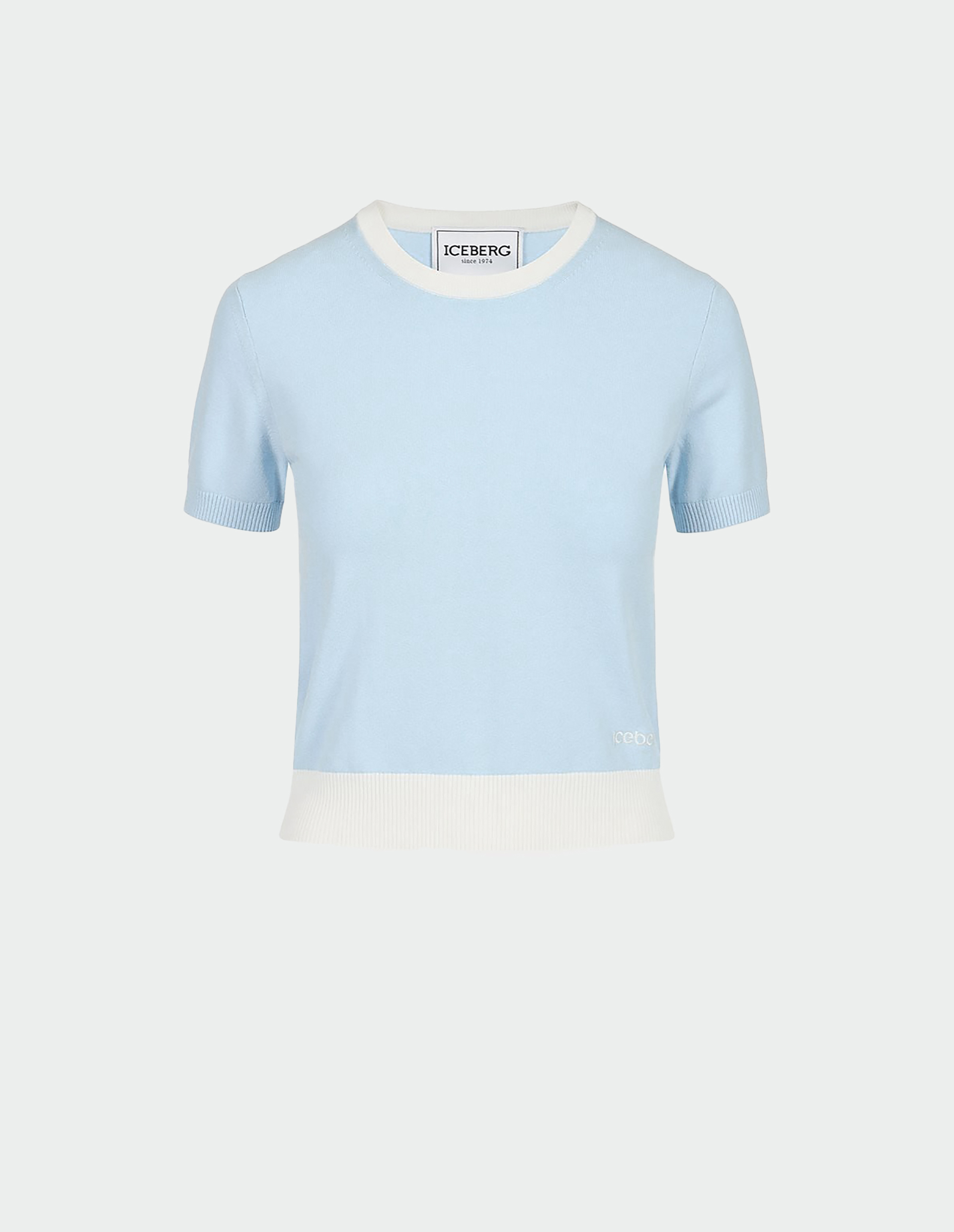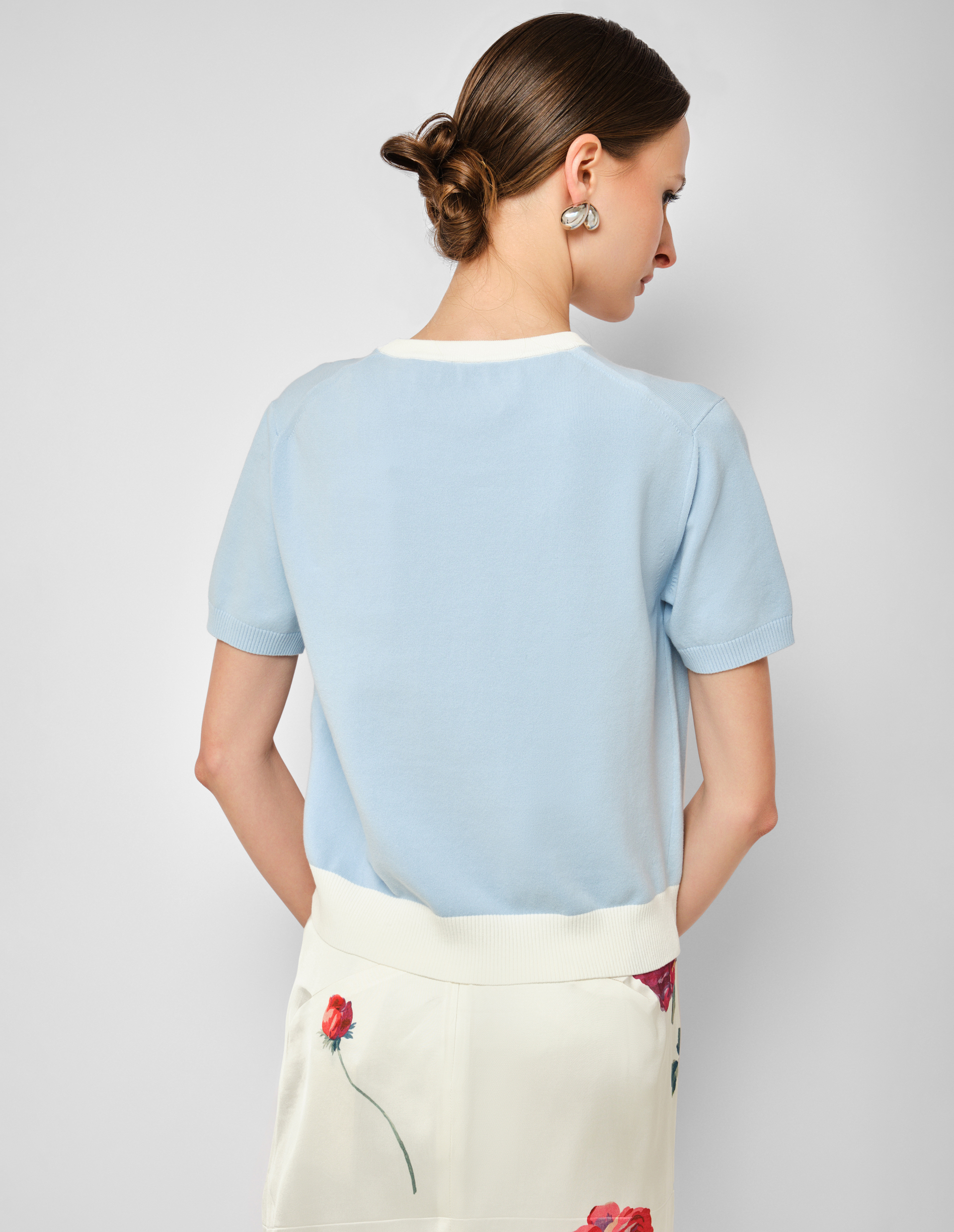 Светло-голубой джемпер с коротким рукавом и белыми манжетами