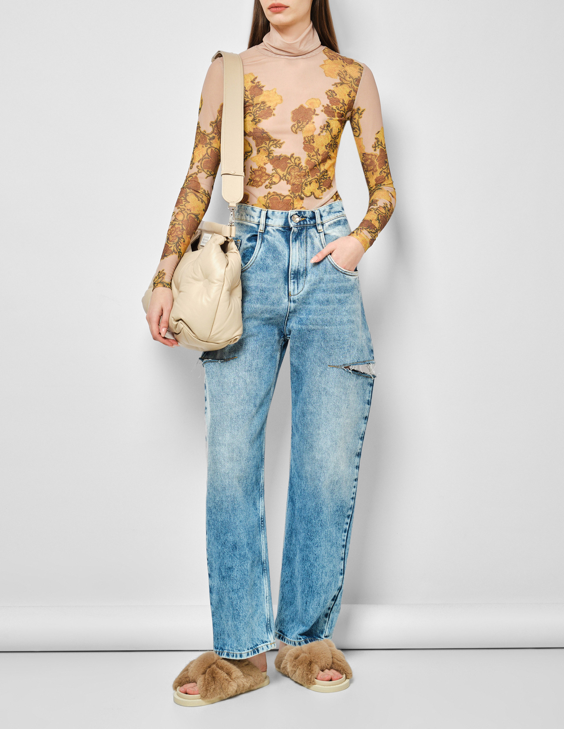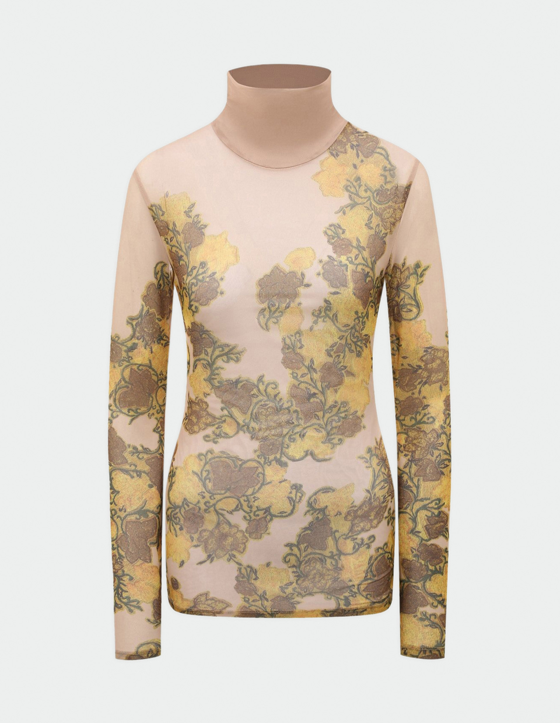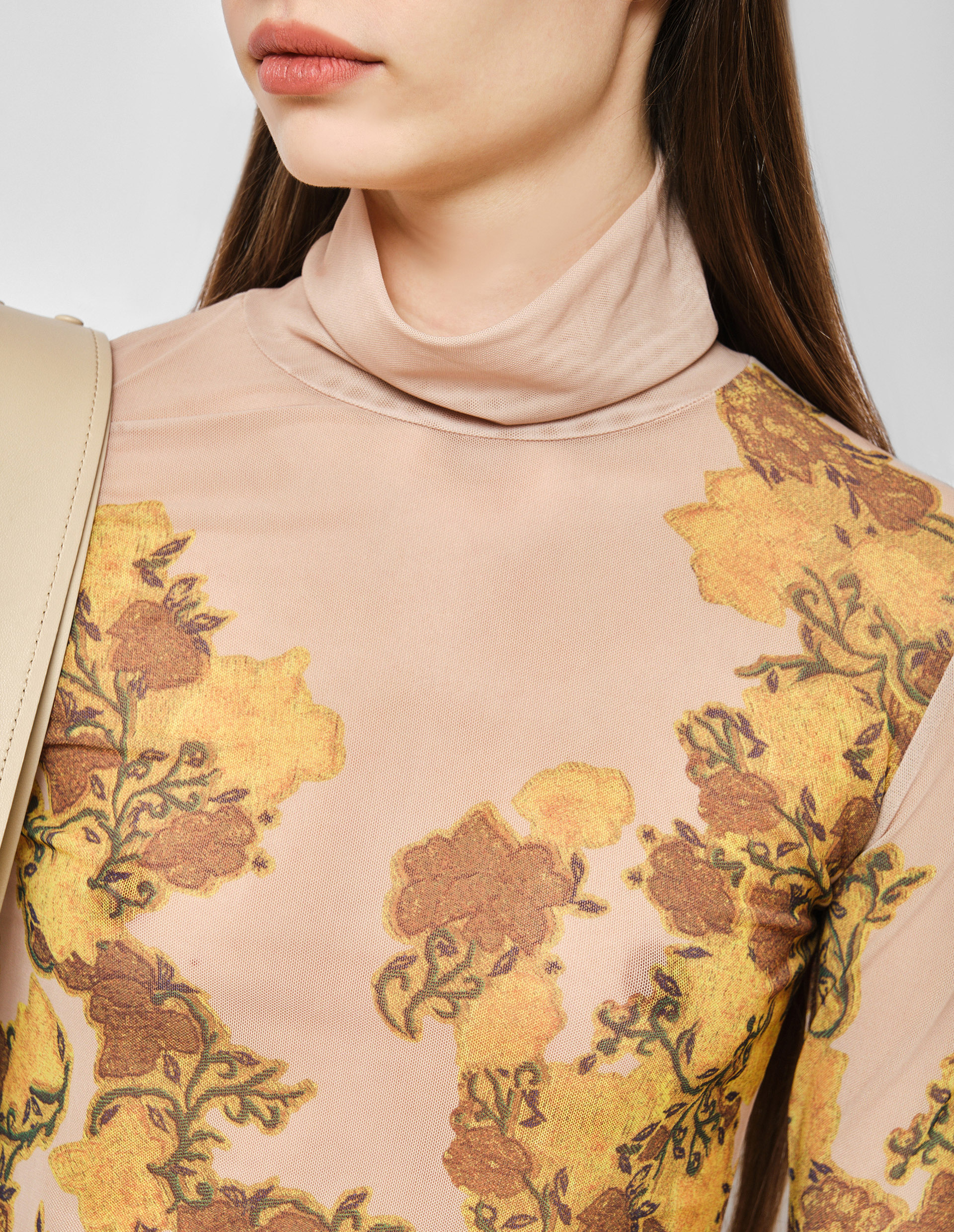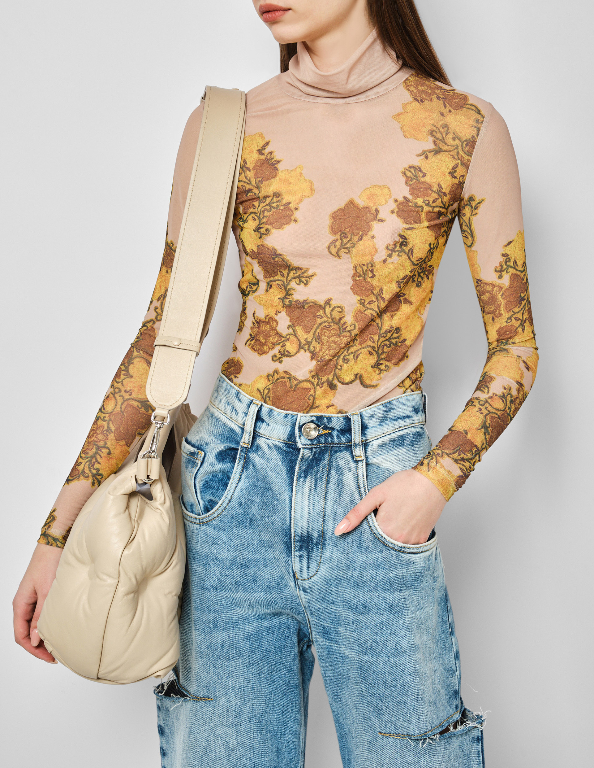 Изделия дизайнера в одноименном бренде Dries Van Noten – это, в первую очередь, эстетическая поддержка его одежды. Это одежда созданная для жизни и всегда из высококачественных материалов, как и бежевый гольф в сетку, который ощущается как вторая кожа. Плотный полиэстер соединяющийся с тянущимся эластаном искусно облегает и подчеркивает фигуру. Дополнением к нежной сетке идут роскошные желто-коричневые цветы, которые изумительно подчеркивают фактуру гольфа, сочетаются с его цветовой палитрой, а также служат одновременно акцентной и лаконичной деталью.