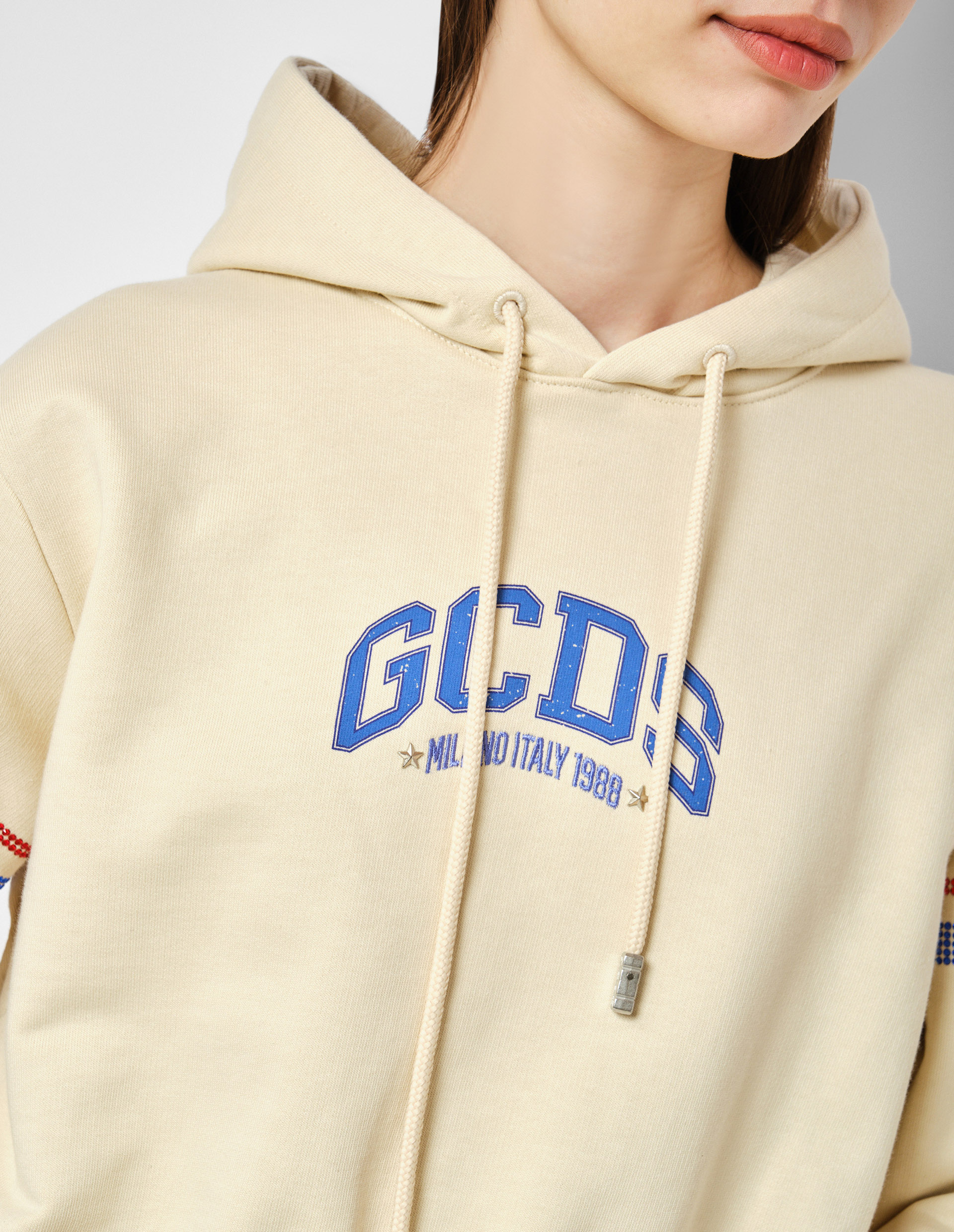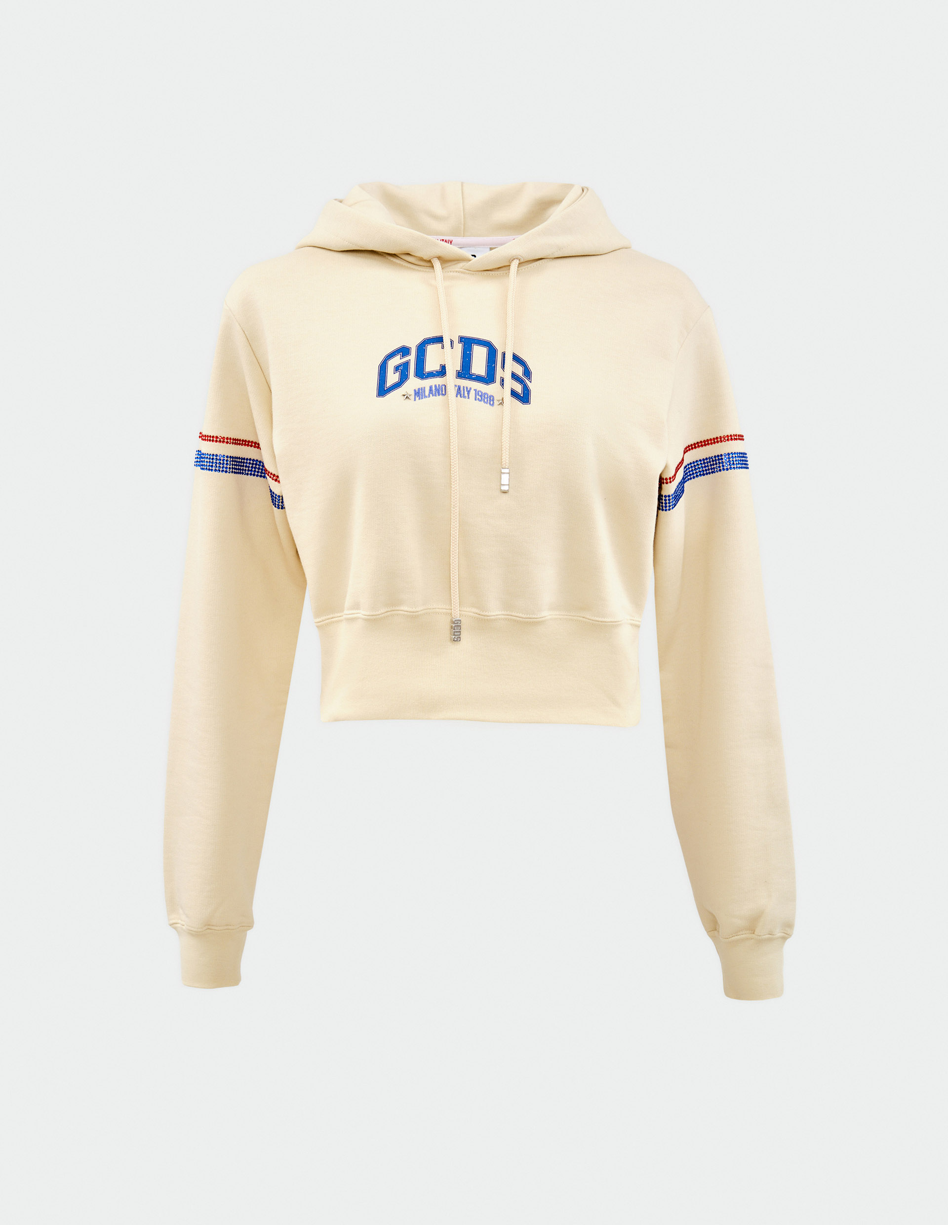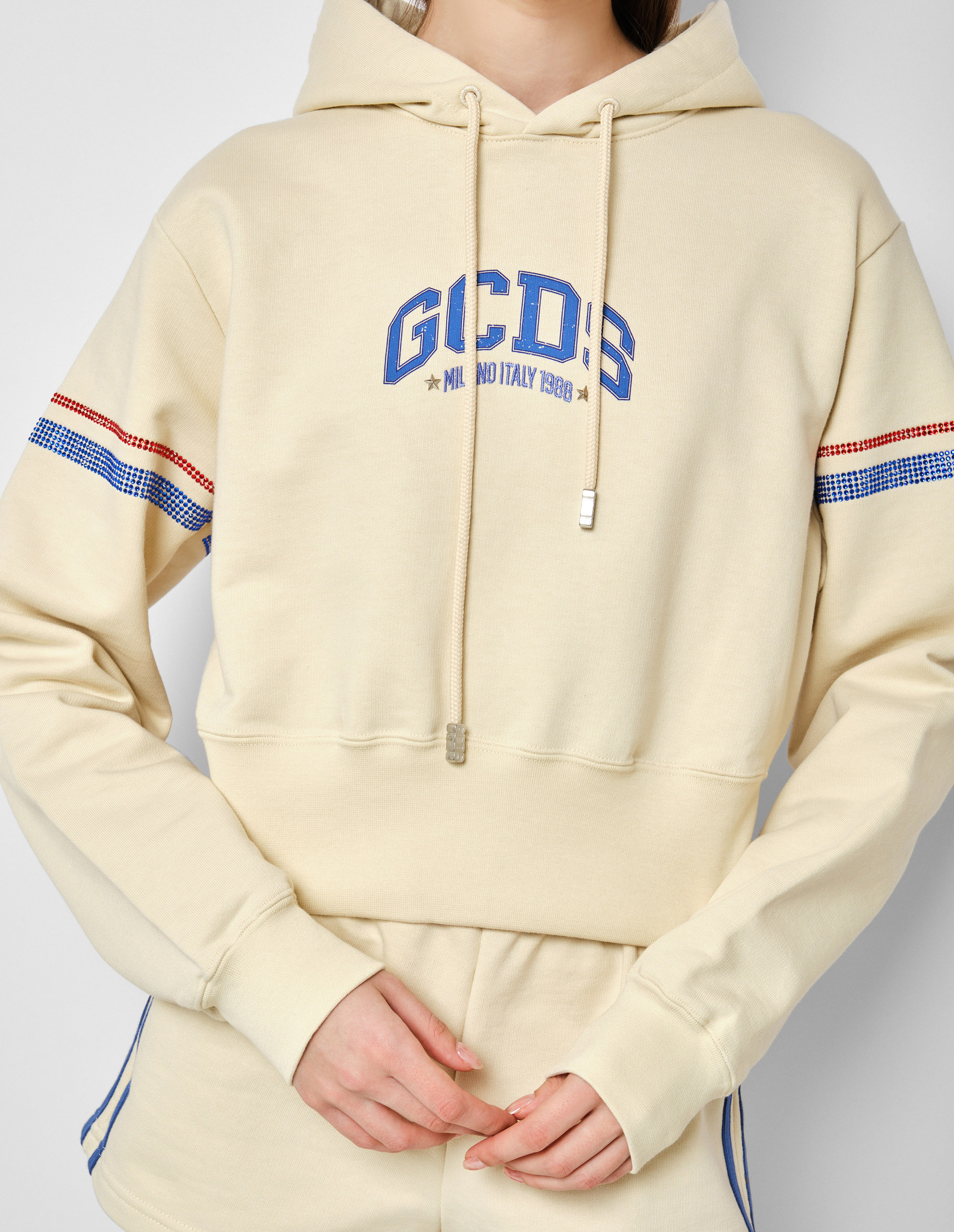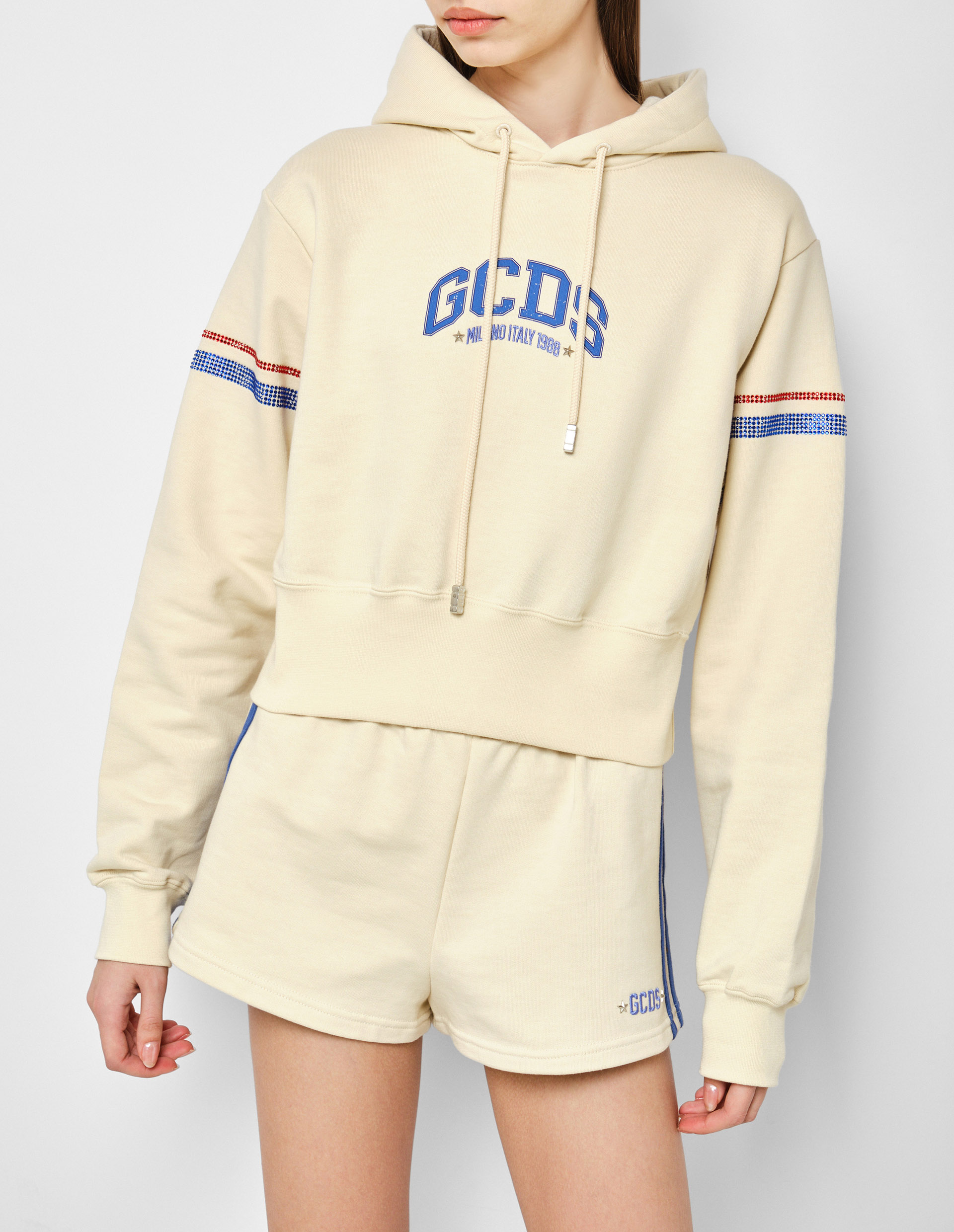 Бежевое укороченное худи от миланского бренда GCDS отражает современные чувства миллениалов с помощью выразительных посланий и смелого дизайна. В этом изделии дизайнеры пленяют ностальгическим настроением, которое передано в логотипе с эффектом винтажности в глубоком синем оттенке. За трендовость отвечает блестящие детали в виде эффектных сине-красных полос на рукавах, украшенные мерцающими стразами. Укороченный силуэт на эластичной резинке подчеркнет изящную фигуру, объемный капюшон с кулиской создает расслабленное настроение, а материал из отборного хлопка дарит ощущение легкости и свободы. Создайте полный образ от бренда GCDS вместе с бежевыми мини-шортами с синими лампасами.