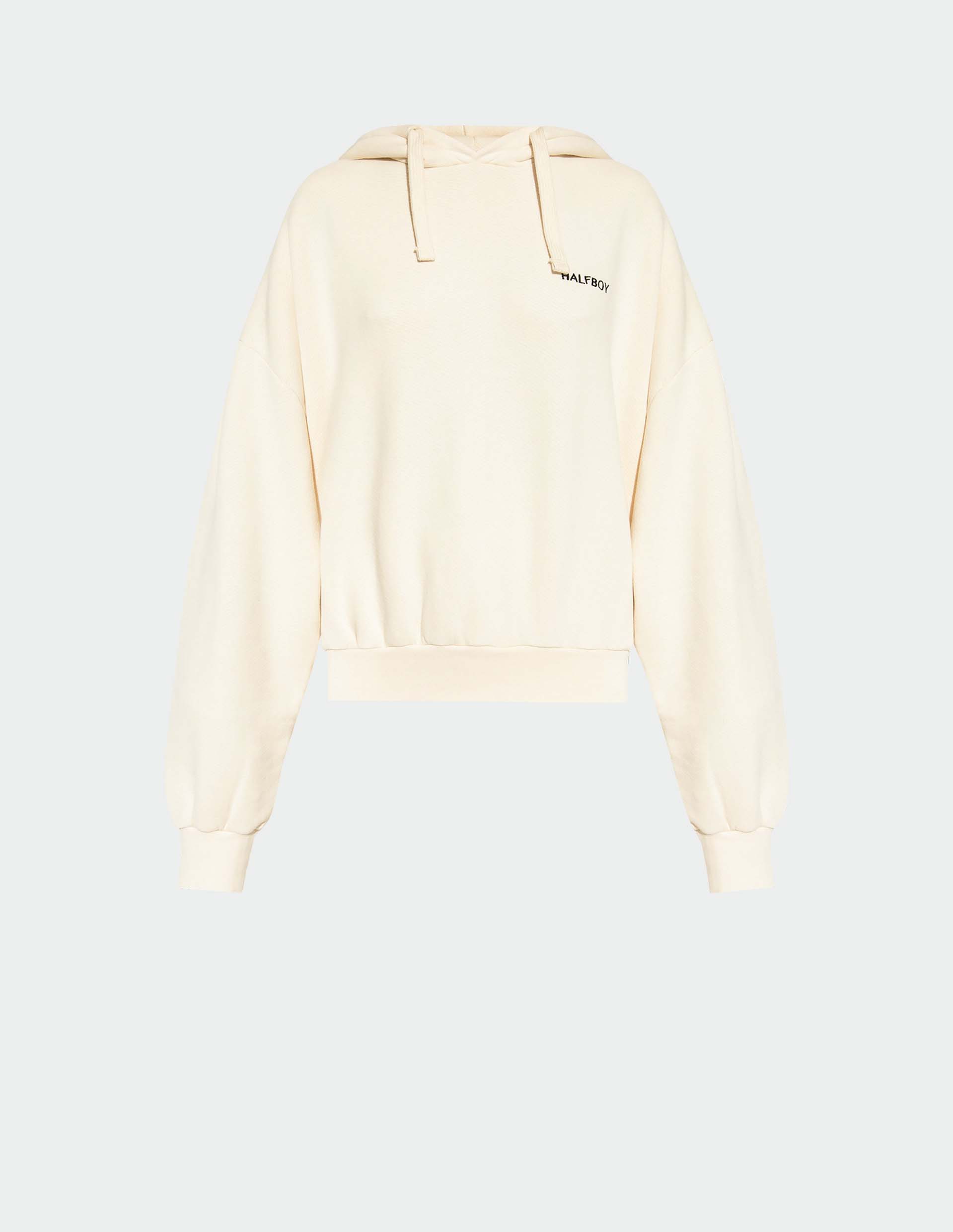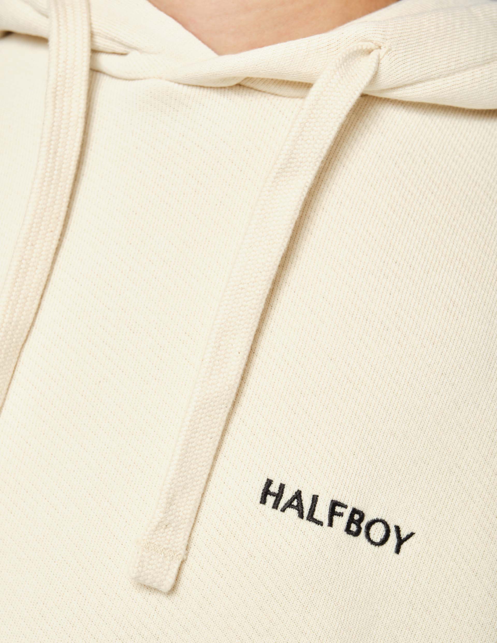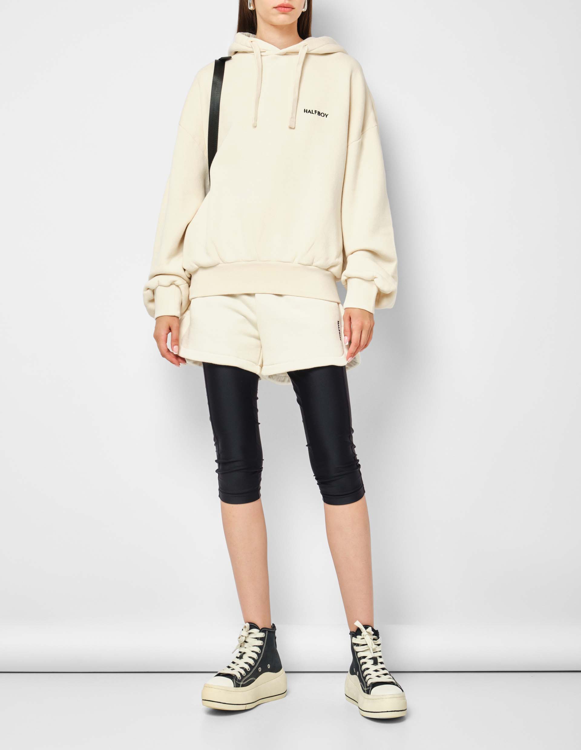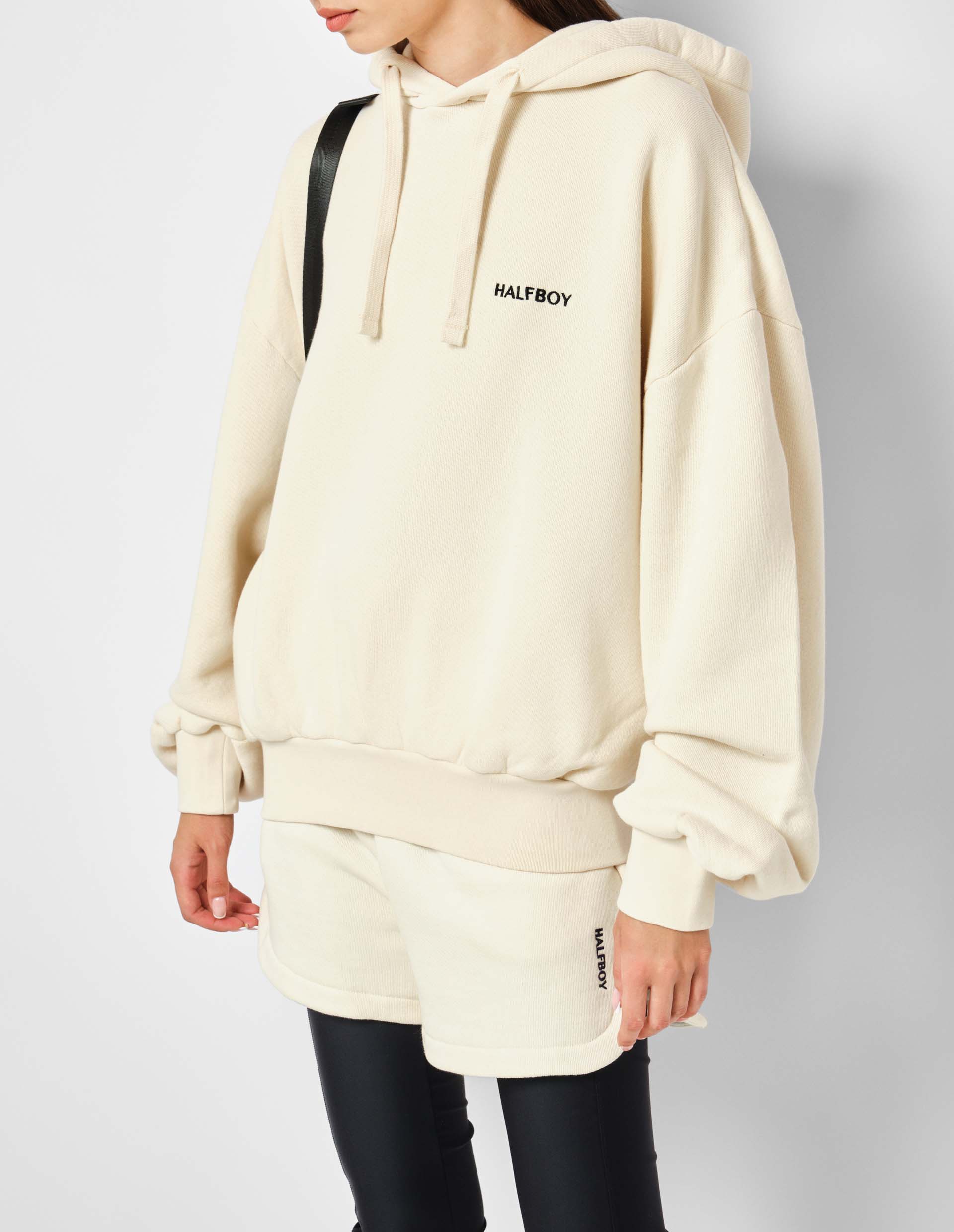 Стиль streetwear, объединение мужского и женского начал, отраженные в этом худи, воссоздают эстетику Halfboy, который стремится к гендерной нейтральности. Черпая вдохновение в уличных субкультурах и ретро-эстетике, появился объемный силуэт с глубоким капюшоном и длинными рукавами. Конструкция модели обещает свободу движениям и комфортное ношение, усиленное материалом плотного плетения из премиального хлопка.