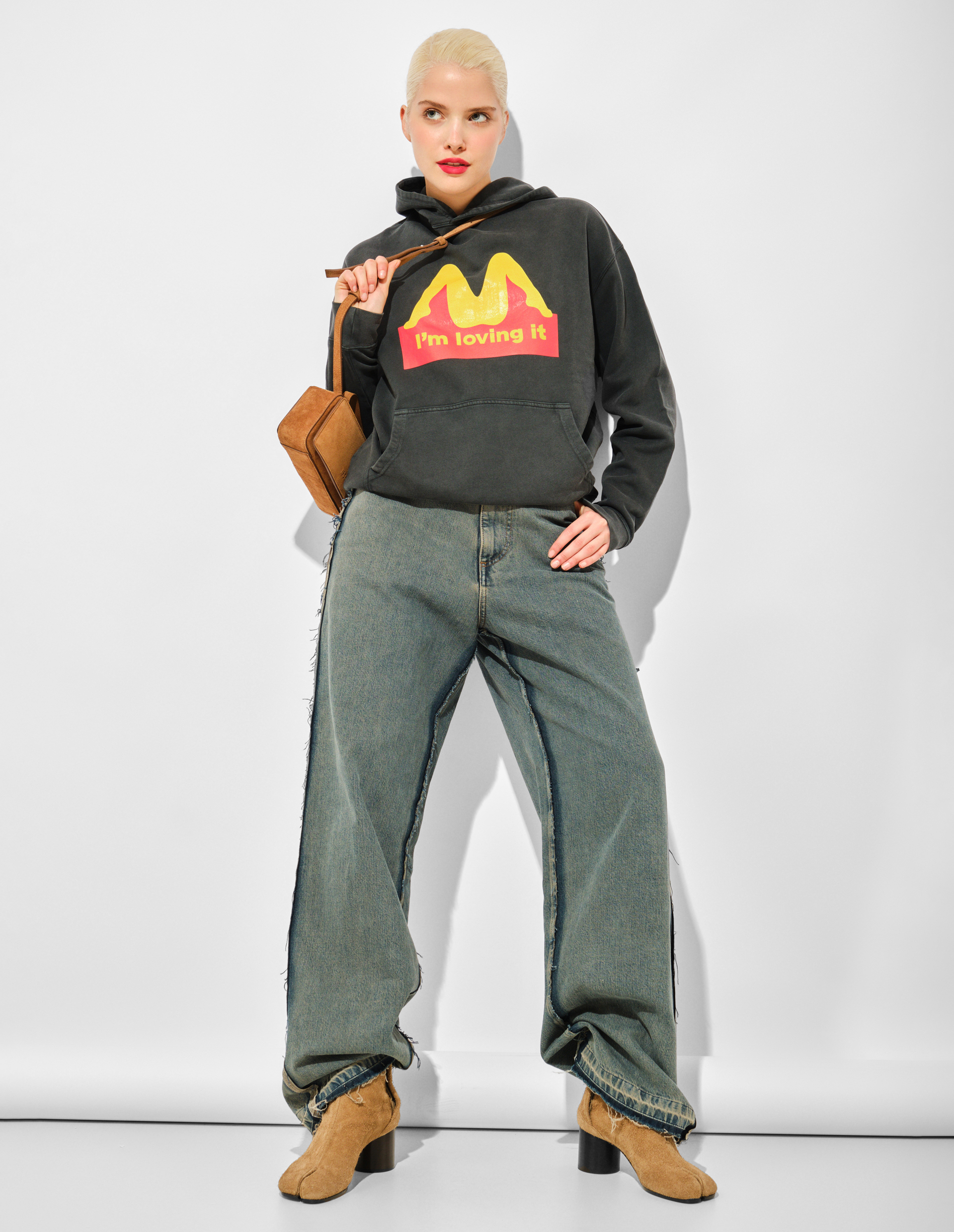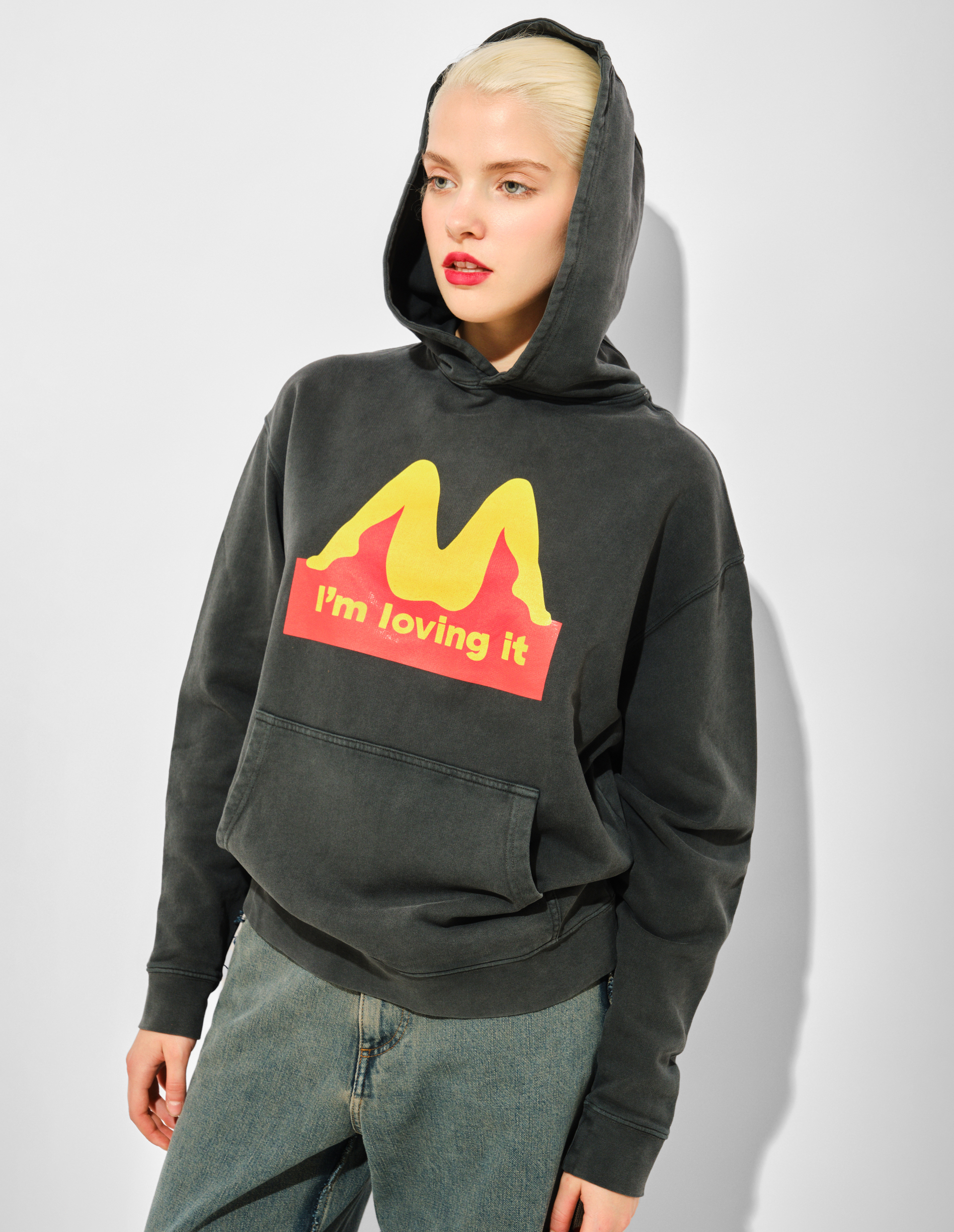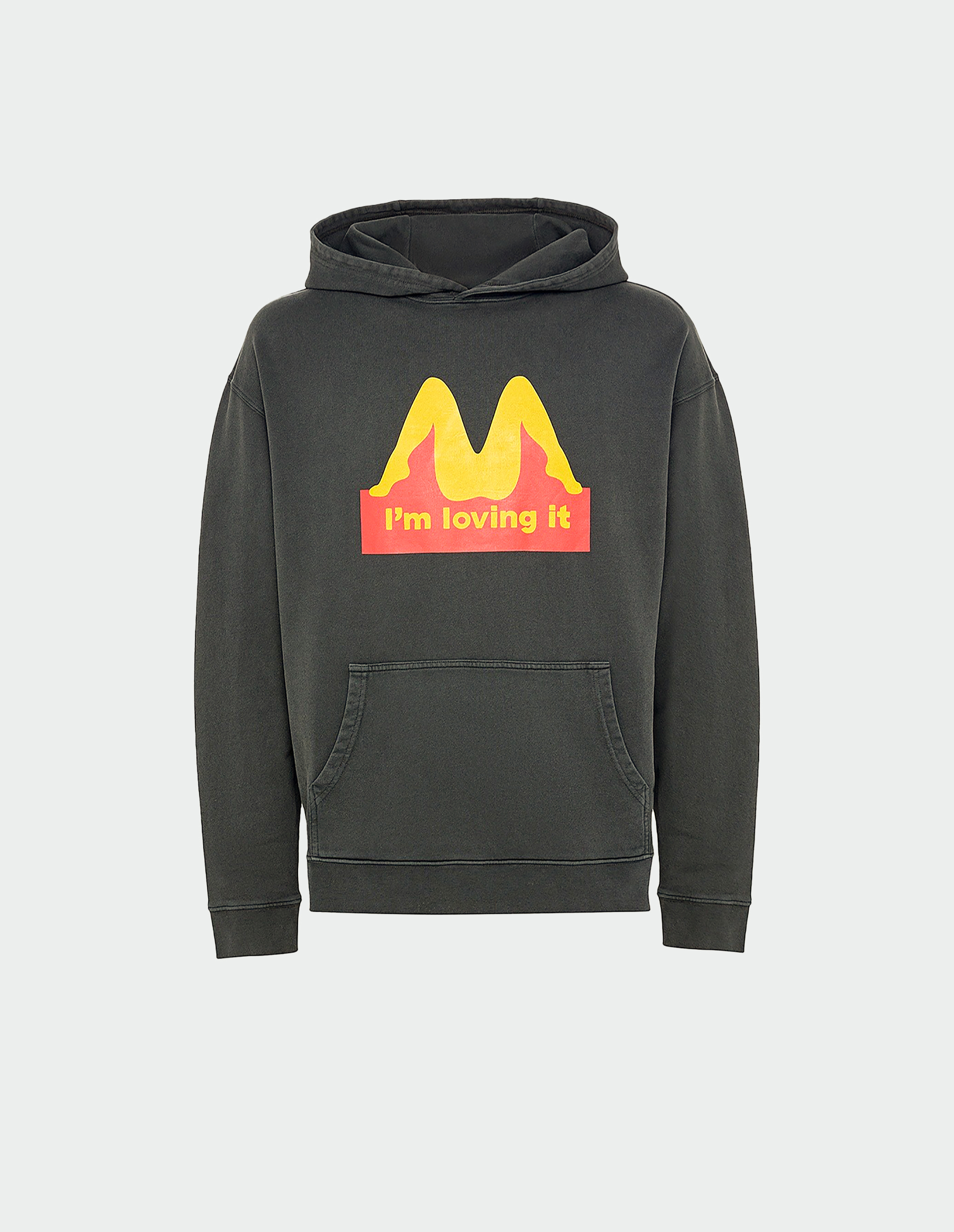 Это худи — мастер-класс по деконструкции поп-культуры и желания. Фирменный лозунг фастфуда «I'm Lovin' It» и узнаваемые золотые арки McDonald's здесь переосмыслены до неузнаваемости: они превращены в игривую и откровенную графическую метафору любовных ласк. Carne Bollente виртуозно заменяет объект потребления — еду — на объект желания, превращая самый массовый символ в личный, дерзкий и остроумный мем. Мягкий будто выцветший серый хлопок и расслабленный крой худи служат идеальным, кинематографичным фоном для этой смелой визуальной шутки.
