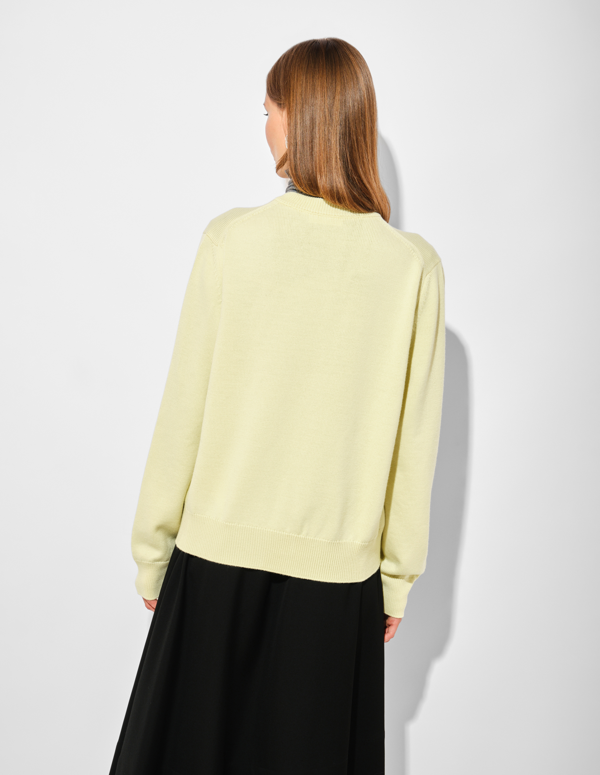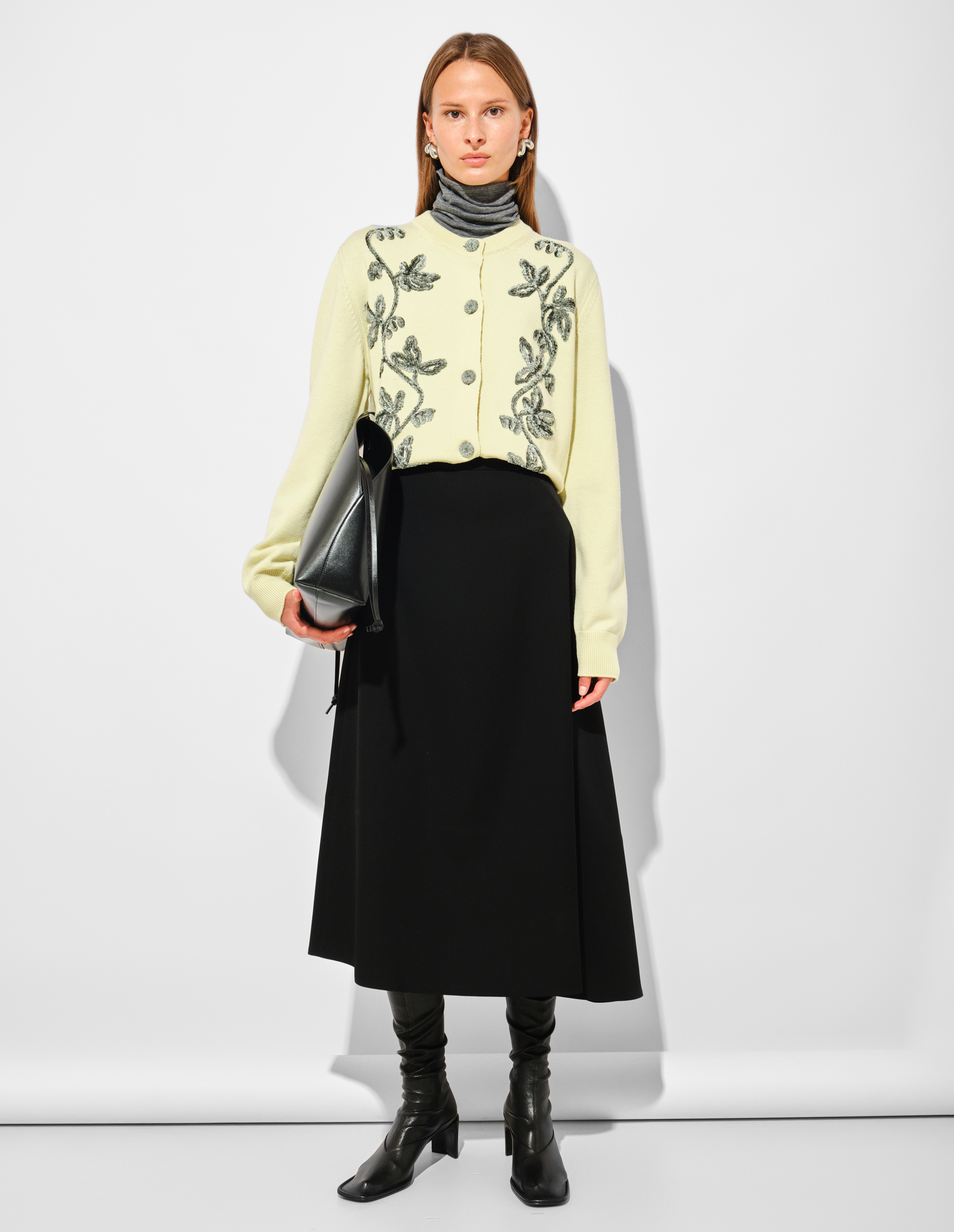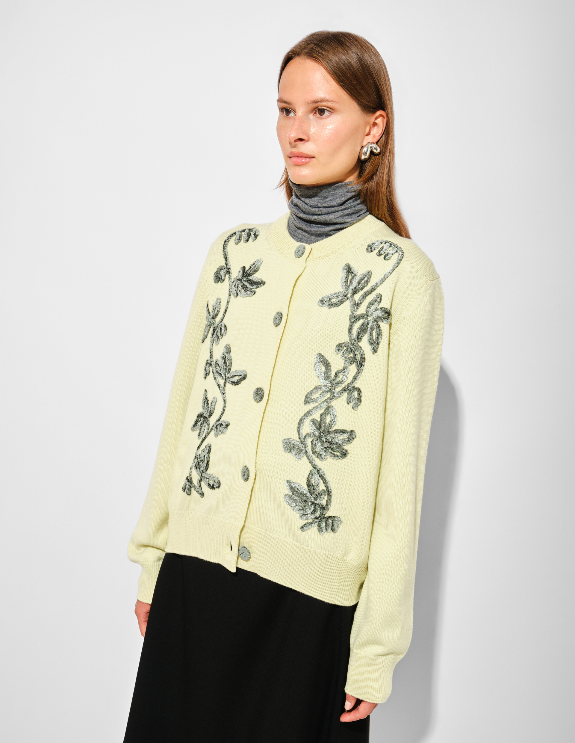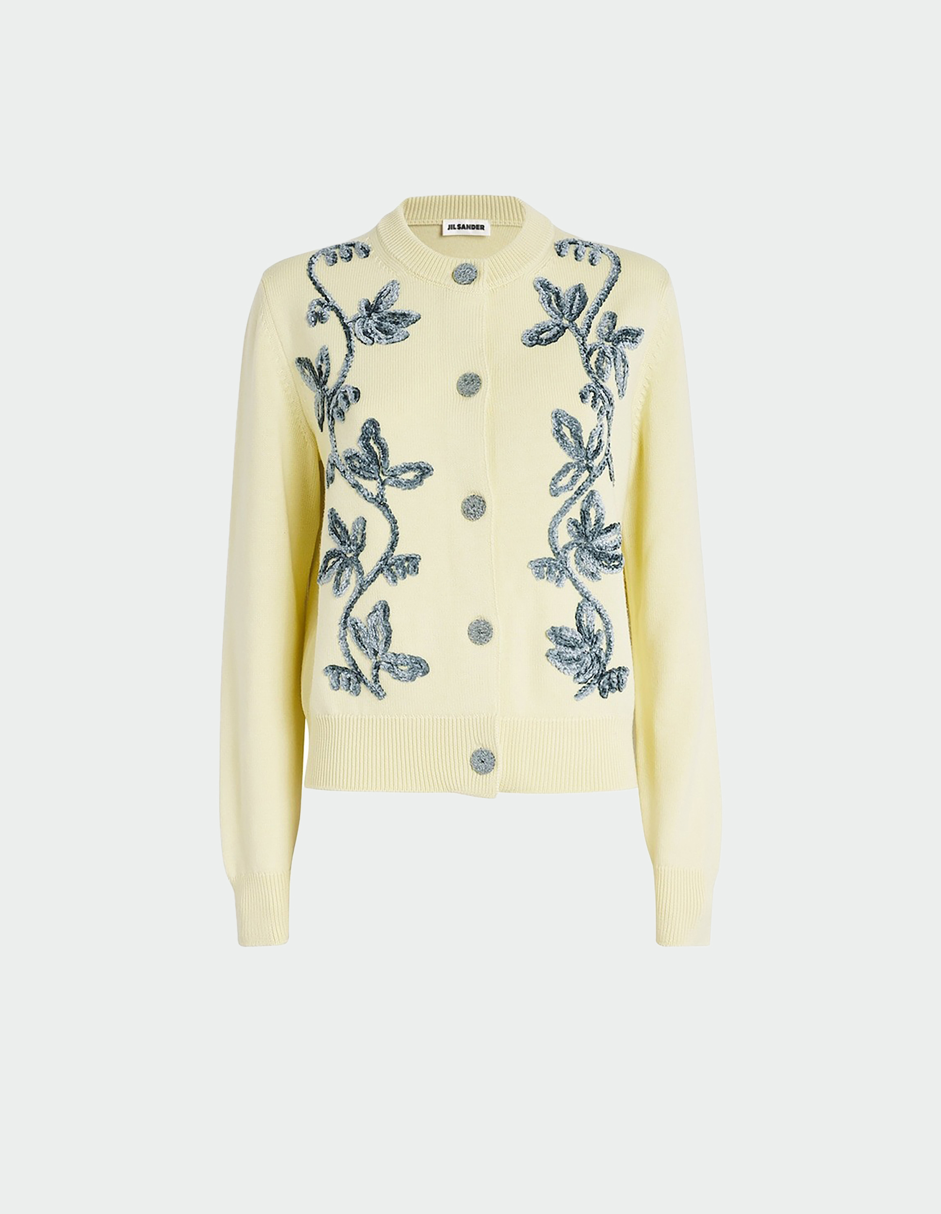 Кардиган оттенка lime wash из тонкой мериносовой шерсти с бархатной цветочной вышивкой ручной работы воплощает поэтичный дух осенней коллекции Jil Sander, где строгость встречается с одухотворенной декоративностью. Свободный силуэт и лаконичные линии трикотажного полотна отражают интеллектуальную ДНК бренда, а изысканный декор, напоминающий о «цветочных принтах, постепенно проявляющихся на ткани», вносит тот самый чувственный штрих, преображающий простоту в искусство. Нежный основной цвет, контрастируя с более глубокими тёмными тонами, становится метафорой «ослепительного света в сердце тьмы». Ребристые манжеты и застёжка на пуговицы подчёркивают скульптурность кроя, а лёгкость вискозно-шерстяной смеси создаёт эффект утончённой, почти нематериальной элегантности.