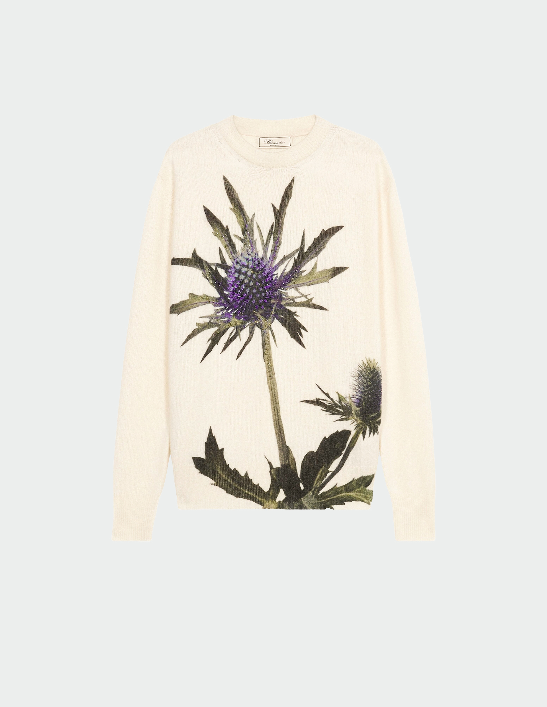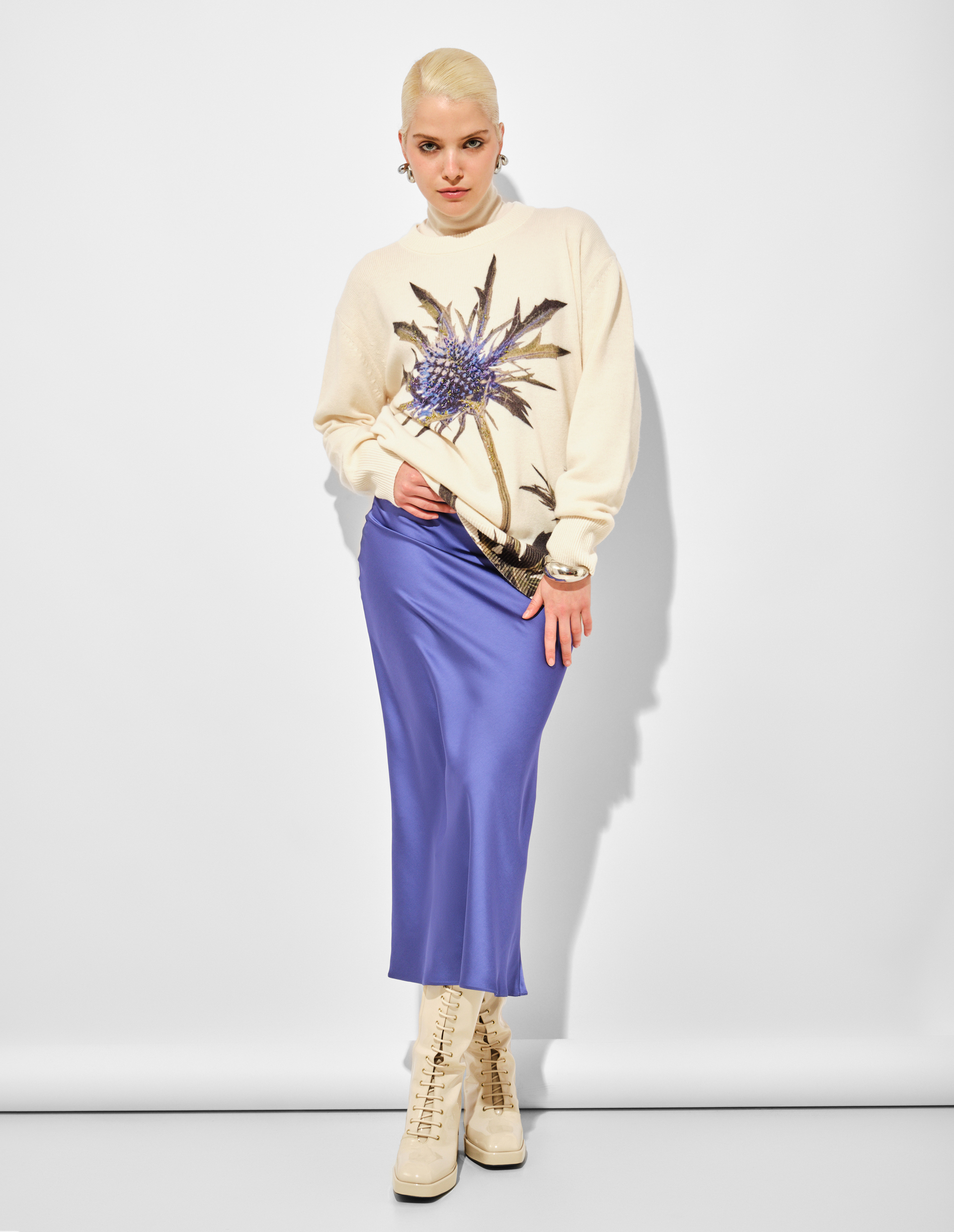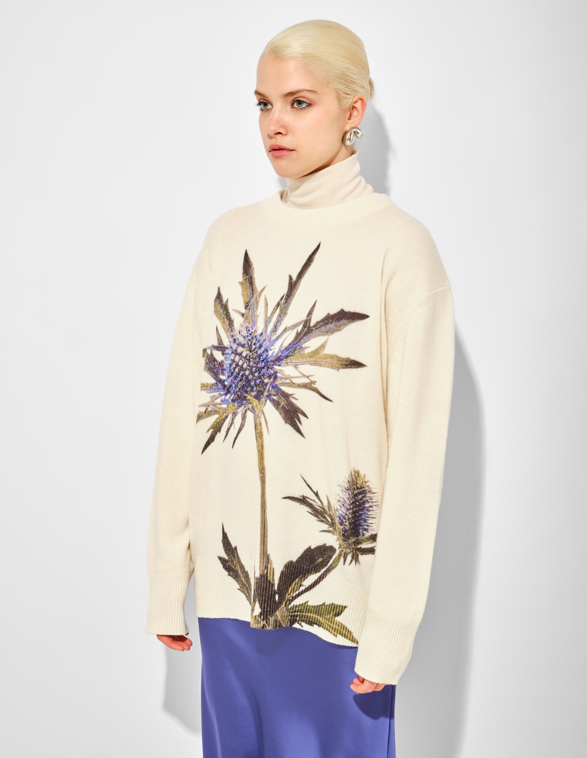Нежность в объёме, вооружённая бисером. Его оверсайз-силуэт из мягкого белого трикотажа создаёт образ уютной, расслабленной роскоши. Но спокойствие взрывает дерзкий принт — цветок чертополоха, где некоторые элементы отделанны бисером. Этот колючий, неукротимый символ, сверкающий на поверхности, превращает простой джемпер в сложное высказывание о красоте, которая может быть одновременно мягкой и опасной, романтичной и бунтарской.