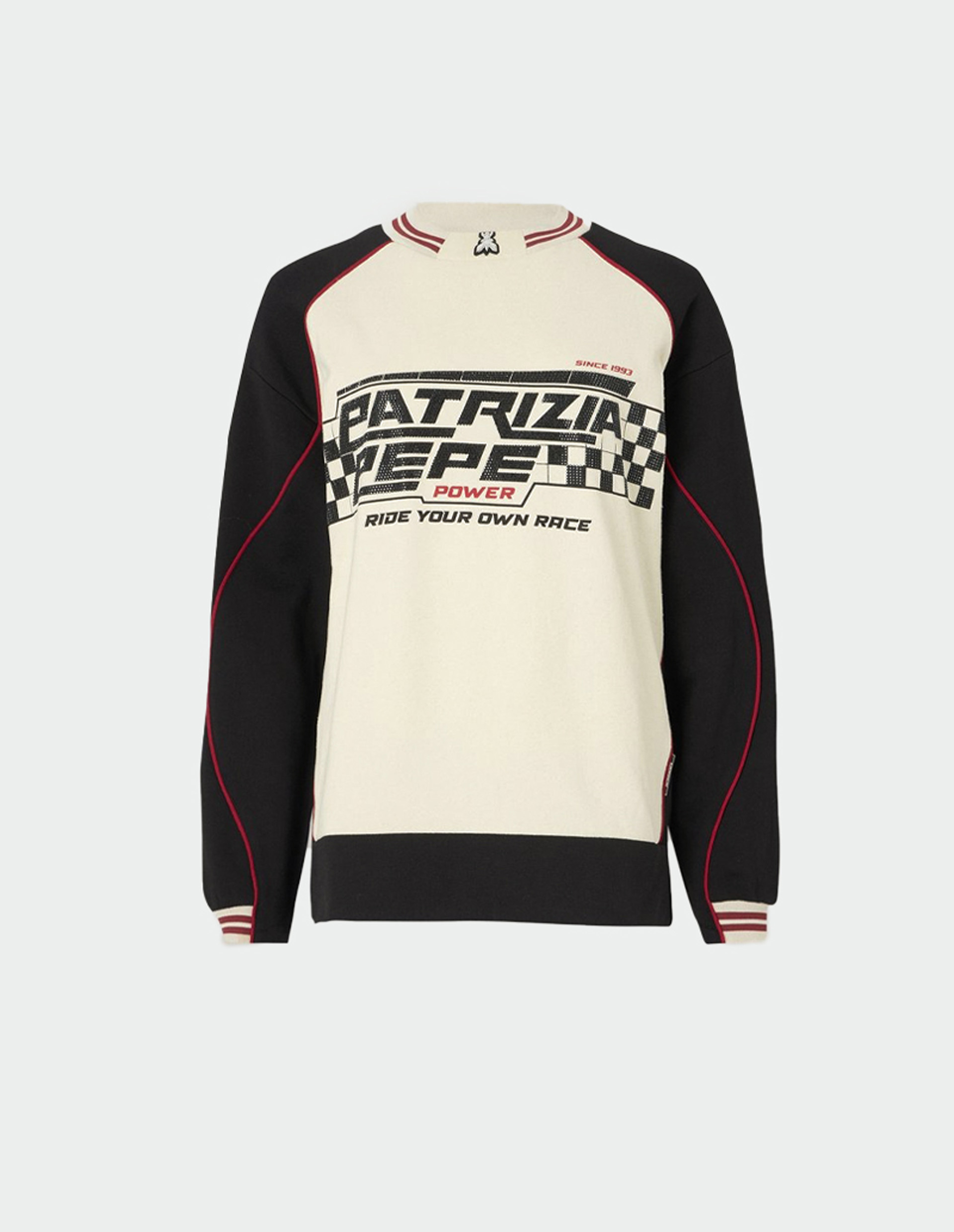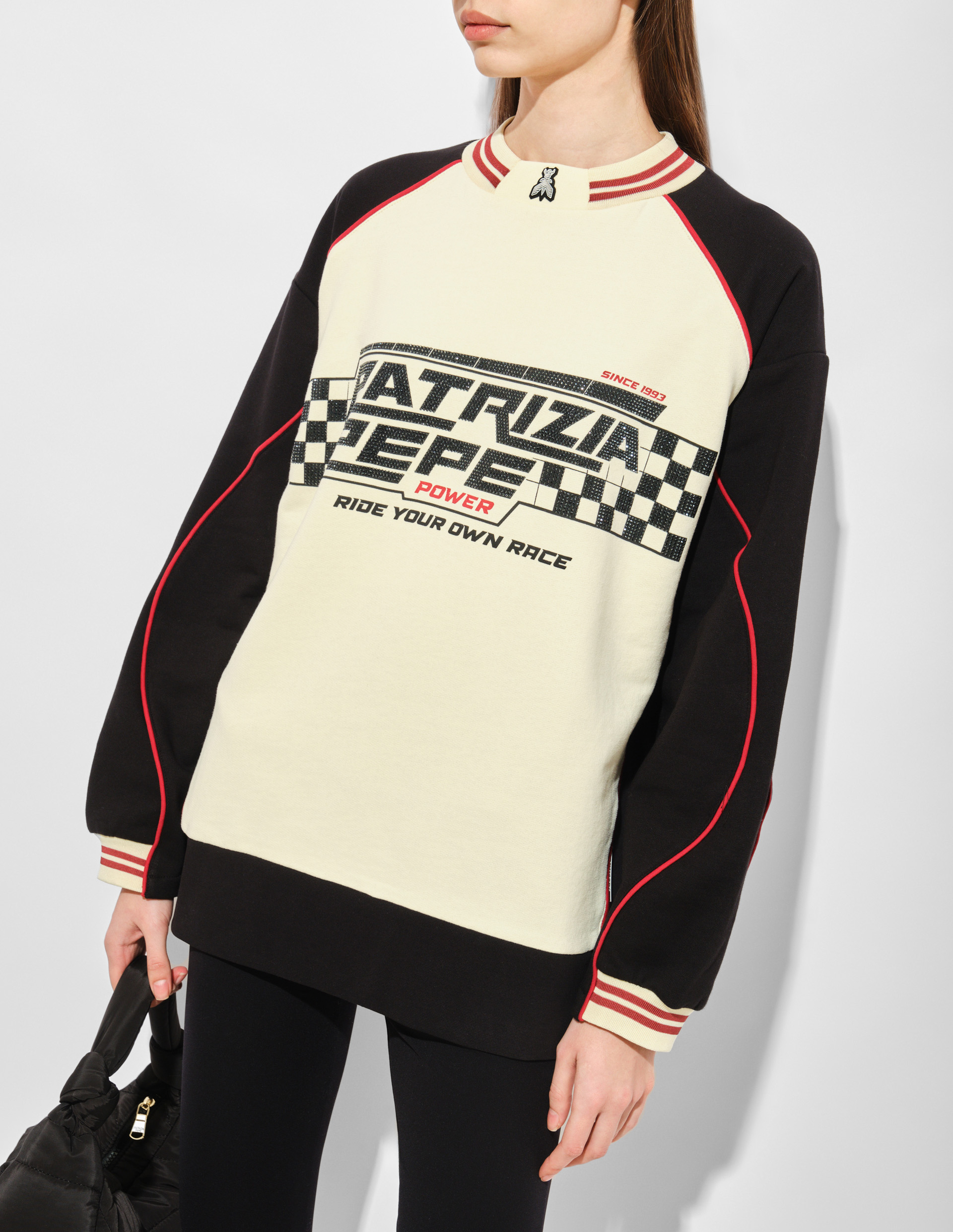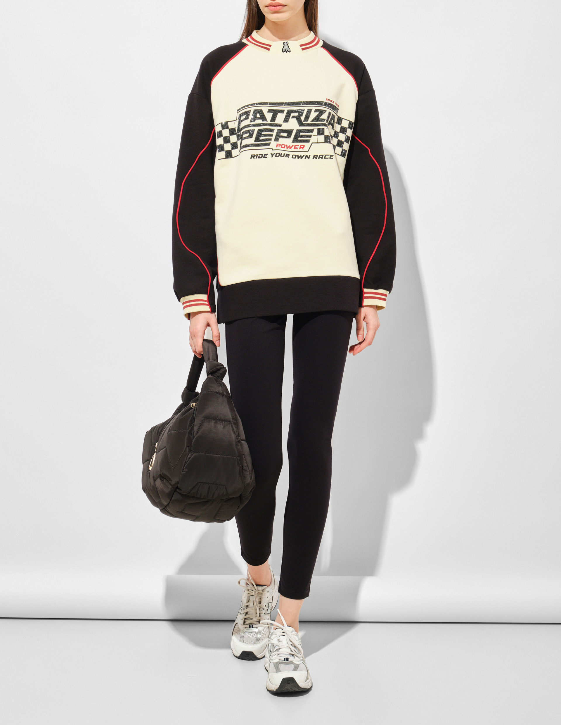 Там, где безумная скорость гоночных болидов пересекается с современным гламуром, появляется этот свитшот от Patrizia Pepe. Он входит в капсулу TURBOLENCE, которая поет оду яростному утверждению собственного "я". Модель выполнена из мягкого чесанного хлопка, а ее дизайн в гоночном стиле словно вобрал в себя энергию одной из самых знаковых трасс Формулы-1. Но этот дерзкий мотив мгновенно приобретает дух женственности благодаря сочетанию оттенков, которые также оживляются сверканием страз на крупном логотипе.