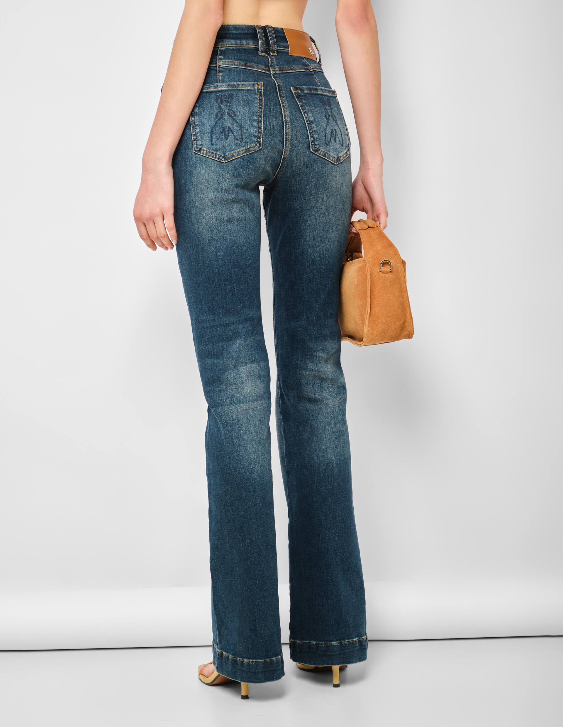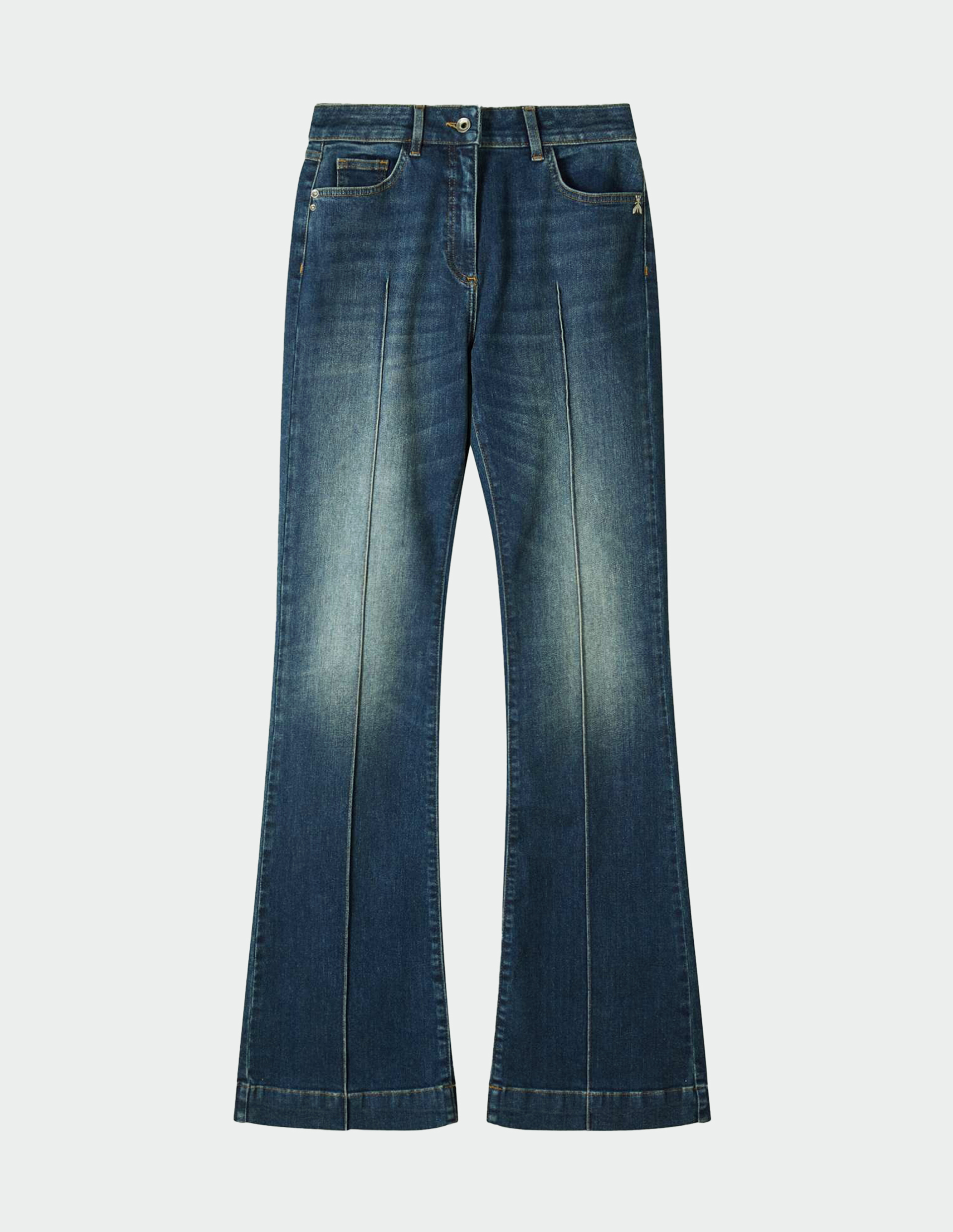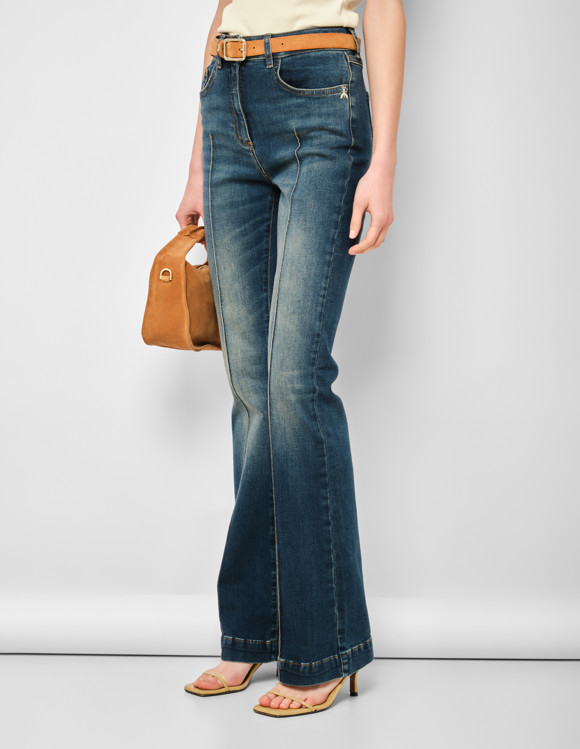 Темно-синие джинсы-клеш с декоративным швом и потертостями