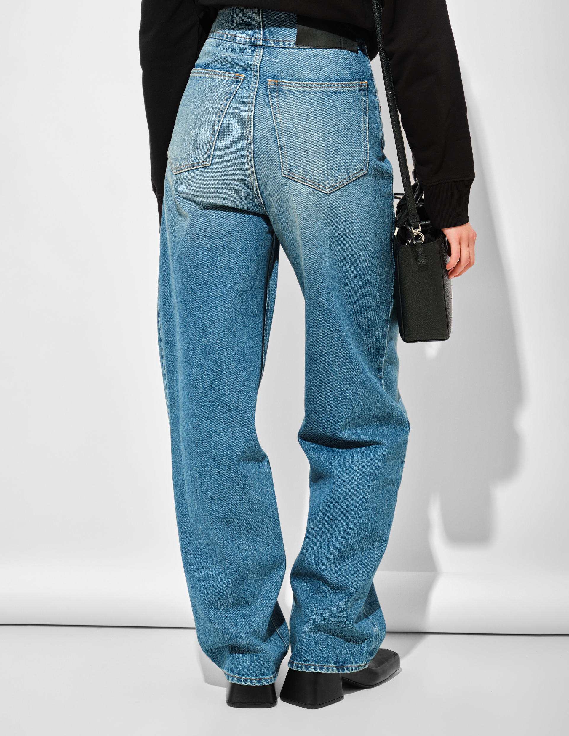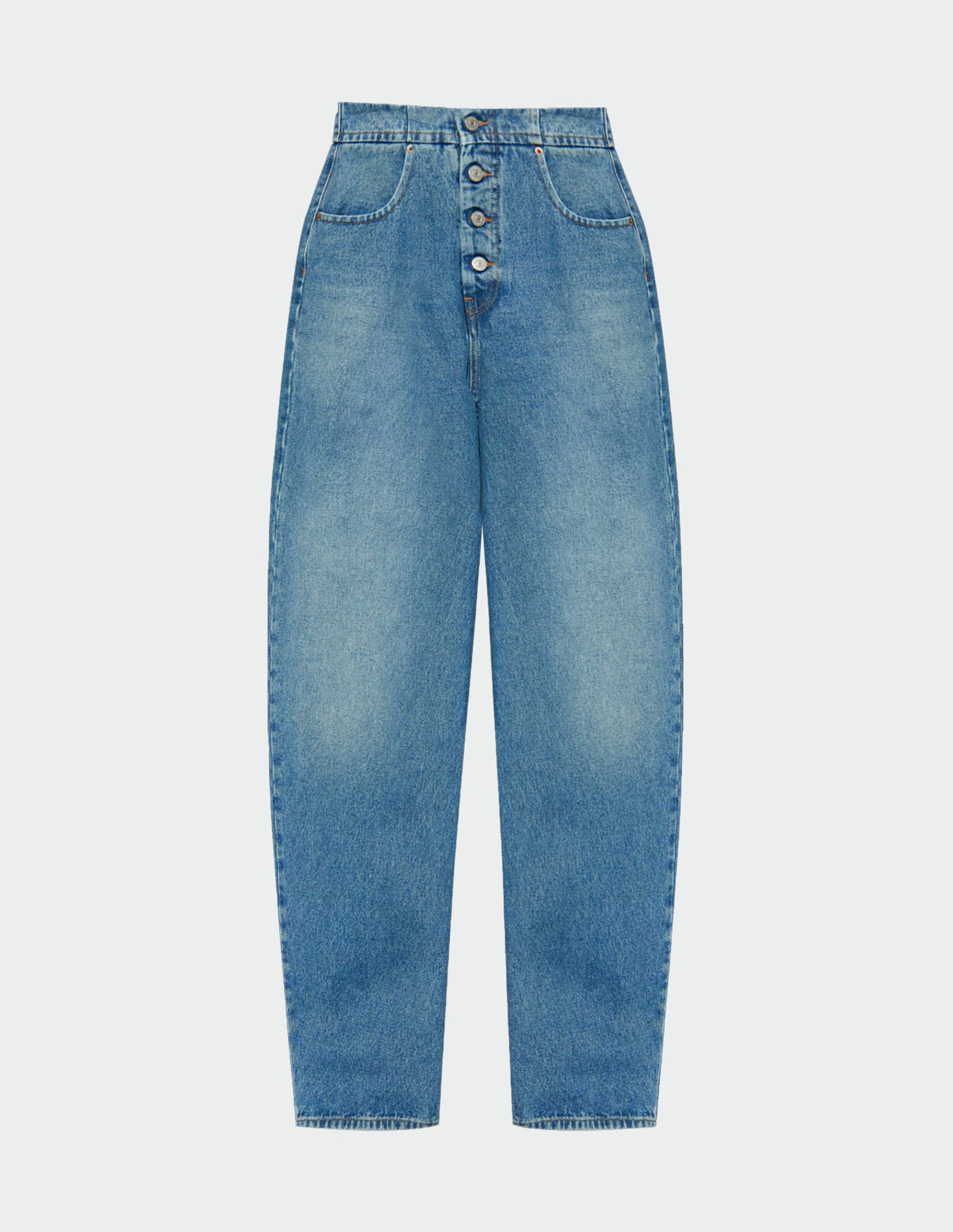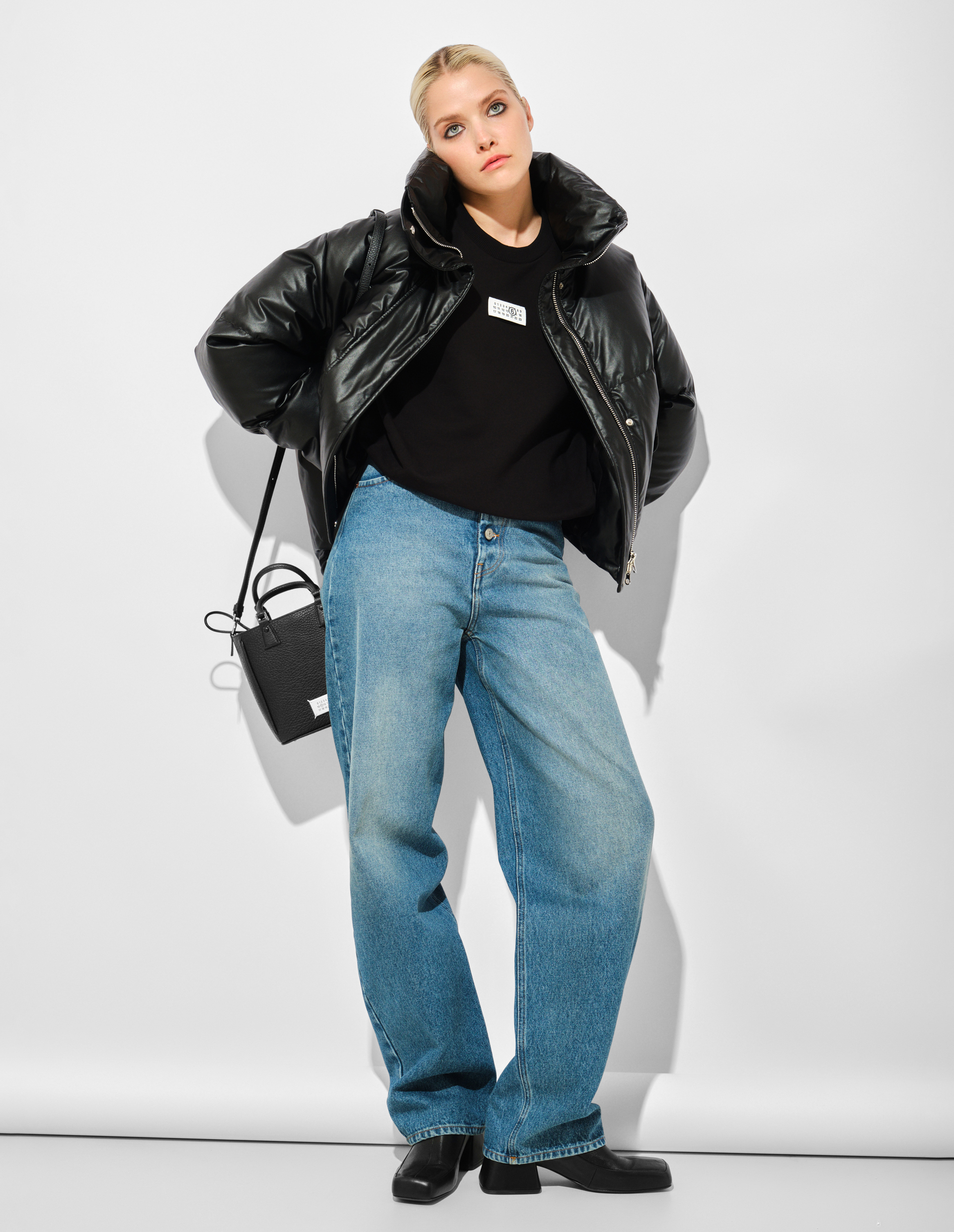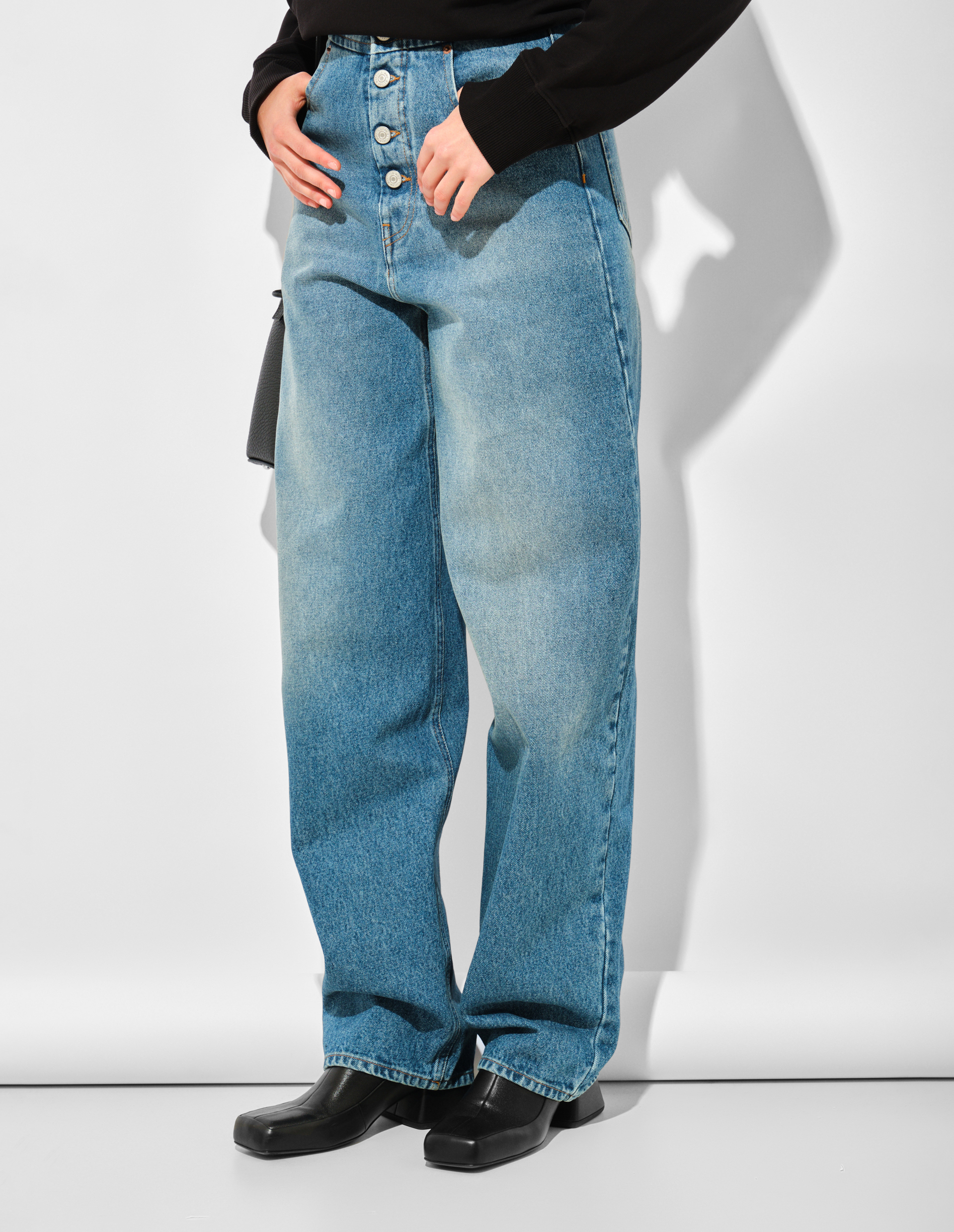 Широкие джинсы из плотного 100% хлопка с застежкой на пуговицы и увеличенной длиной переосмысливают классический силуэт через призму пропорций коллекции FW25. Прямой крой с высокой талией и свободные брючины создают архитектурный объем, контрастирующий с традиционной пятикарманной конструкцией. Акцентные швы и фирменная белая строчка сзади подчеркивают деконструктивный подход MM6, где утилитарные детали преобразуются в элементы авангардного кроя, завершая трансформацию базовой модели в объект экспериментального дизайна.