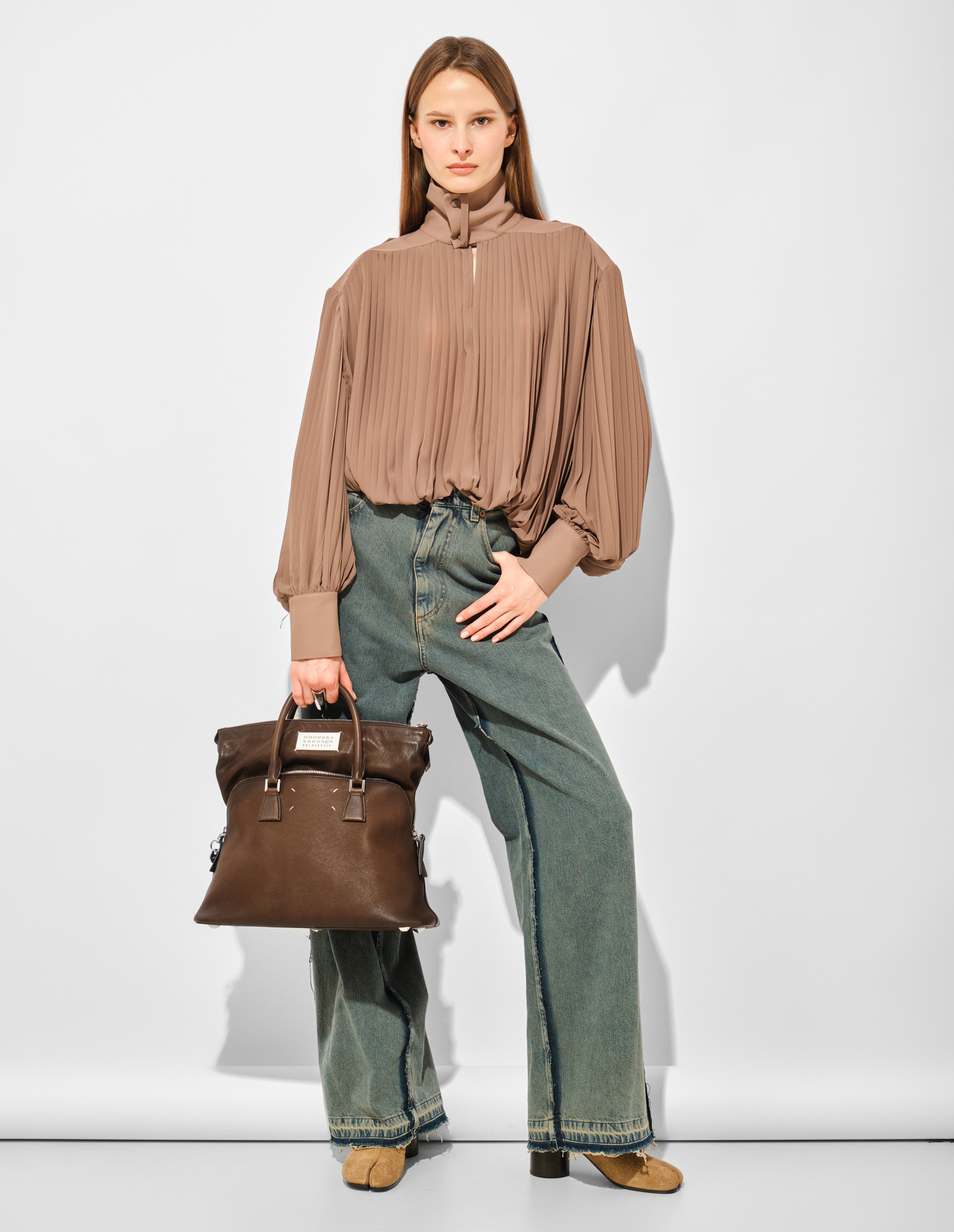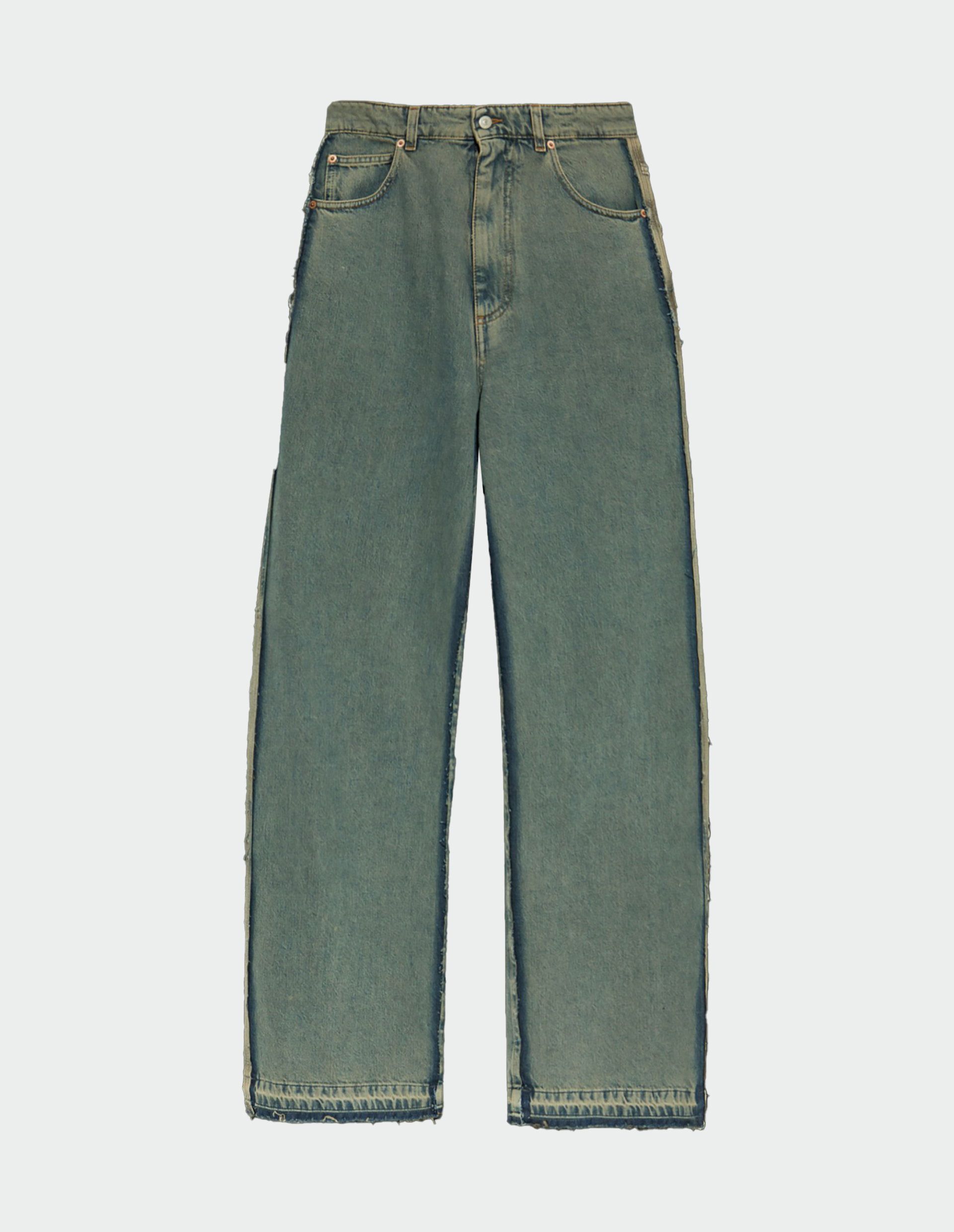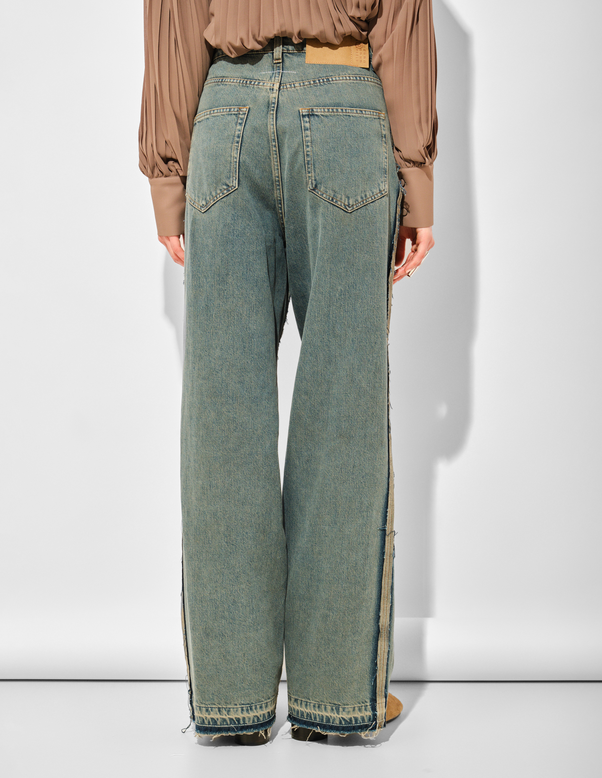 Наглядный пример того, как MM6 работает как лаборатория по адаптации сложных кодов основного Дома. Здесь напрямую обыгрывается наследие деконструкции — краеугольного камня философии Мартина Маржелы, где предмет разбирается по швам, чтобы быть собранным заново с новым смыслом. Эффект «вывернутости» и двойные швы — это не производственный брак, а намеренный дизайнерский манифест, переводящий маржеловский метод из 80-х в современный, носимый контекст. MM6 берёт эту интеллектуальную провокацию и воплощает её в форме широких, модных джинсов, делая авангардное мышление доступным элементом повседневного гардероба. Носить их — значит демонстрировать понимание того, что современная мода может быть умной игрой с формой и восприятием.