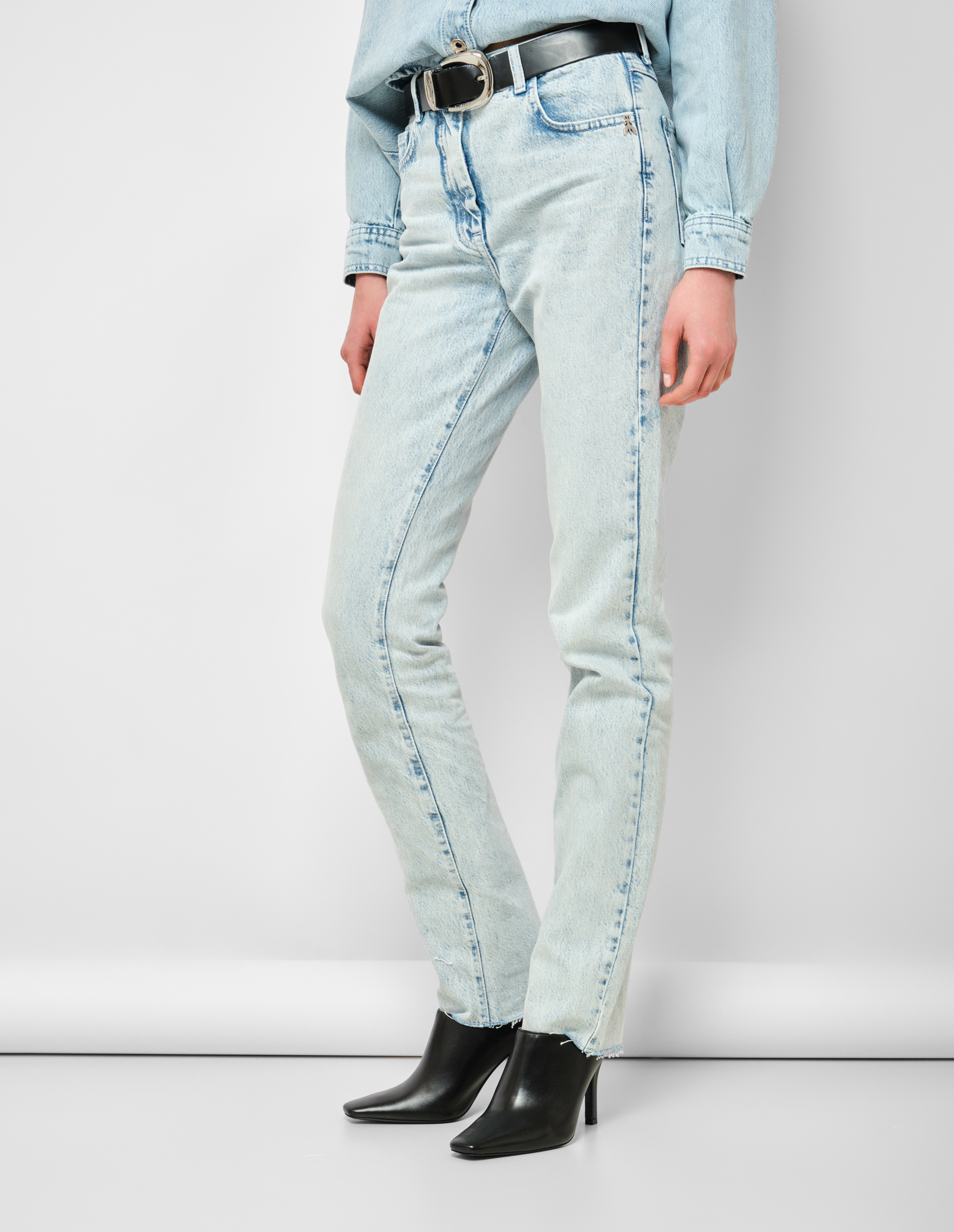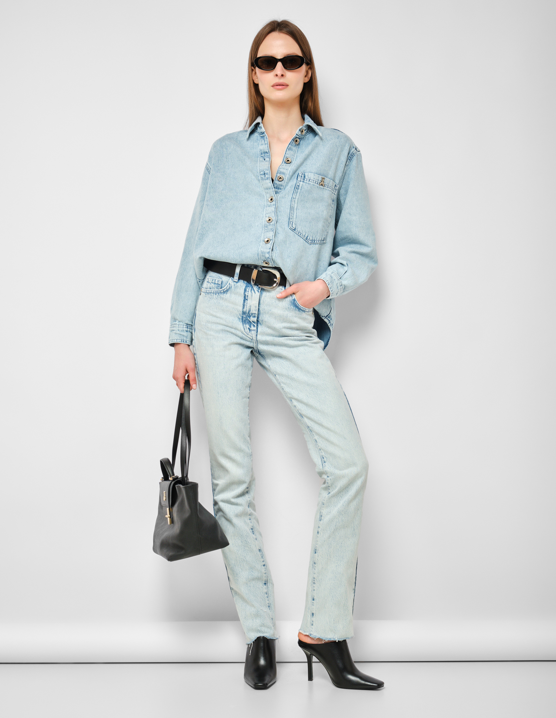 Безупречная база, в которой каждая деталь говорит о характере. Их прямой силуэт и мягкий светло-голубой оттенок создают идеальную основу для повседневного гардероба. Но истинная индивидуальность проявляется в деталях: необработанный край снизу добавляет образу лёгкую, нарочитую небрежность, а аккуратное лого на кармане становится сдержанным, но узнаваемым знаком качества. Это идеальный баланс между классической простотой и современным, чуть бунтарским акцентом.