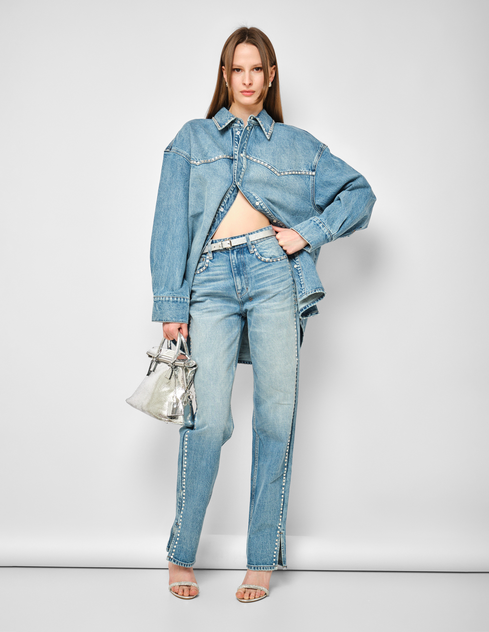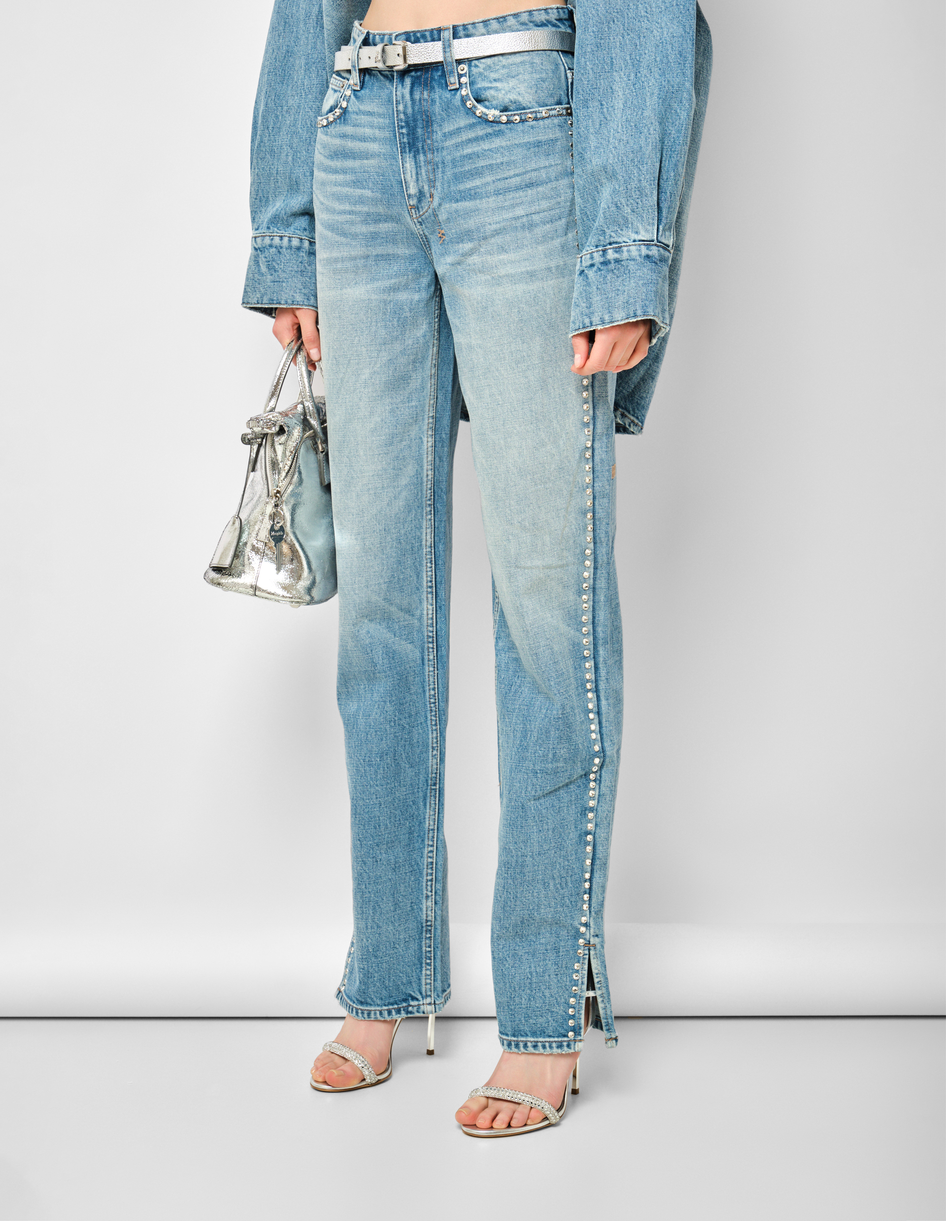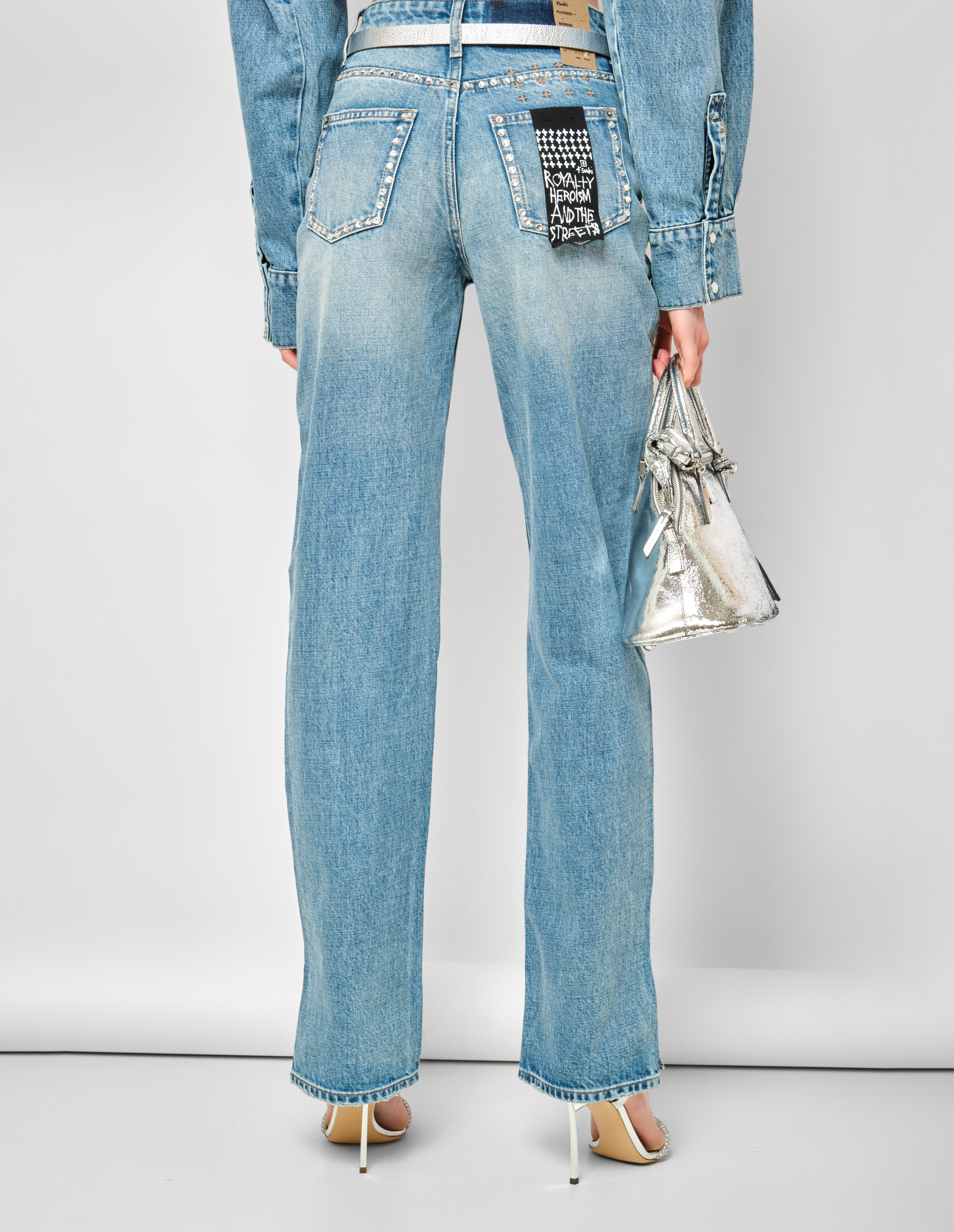 Икона денима в кристальном переосмыслении. Модель Playback Jean 2.0 Maverik Krystal от KSUBI представляет собой современную эволюцию культового силуэта Playback. Прямой крой с небольшим расширением книзу (straighter leg) в сочетании с расслабленной посадкой в бедрах и высокой талией создает идеальный баланс между комфортом современных джинсов и стройнящей вертикалью классических моделей. Модель выполнена из премиум-денима с винтажной синей каменной стиркой, потертостями и контрастной табачной строчкой, добавляющей вещи аутентичного рабочего шарма. Ключевая деталь, превращающая эти джинсы в вечерний стейтмент, — кристаллы diamante, выложенные вдоль строчки передних карманов, по боковым швам и по краям задних карманов. Игра света на кристаллах контрастирует с матовой, "прожитой" фактурой денима, создавая сложную, динамичную поверхность.