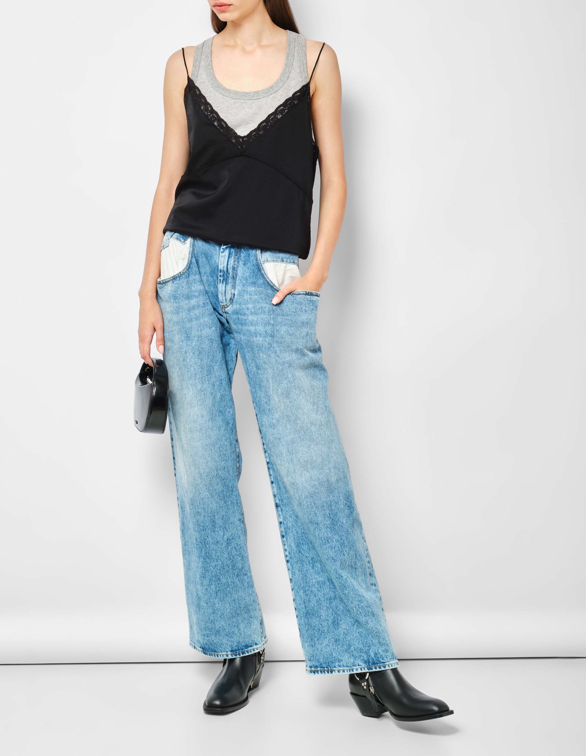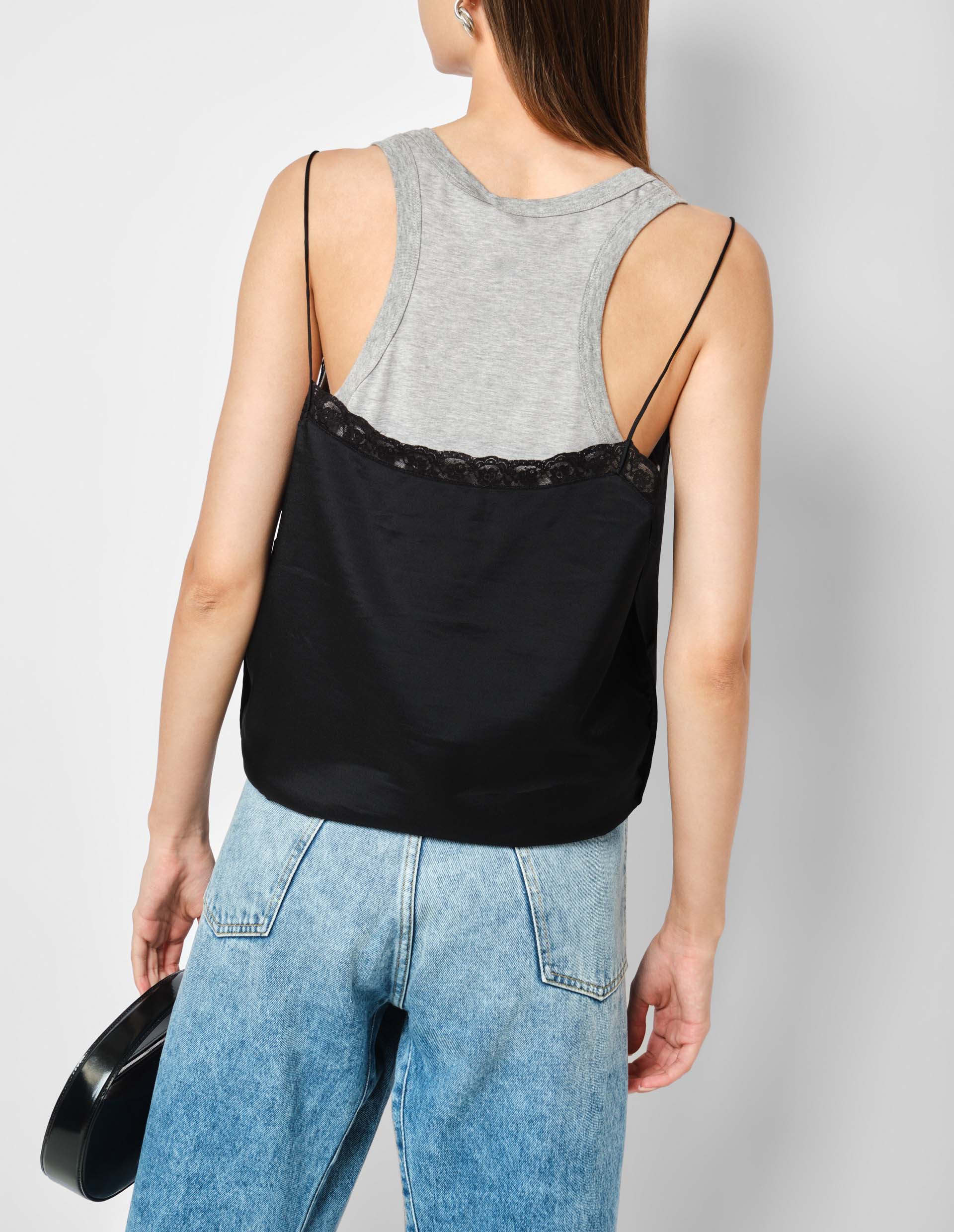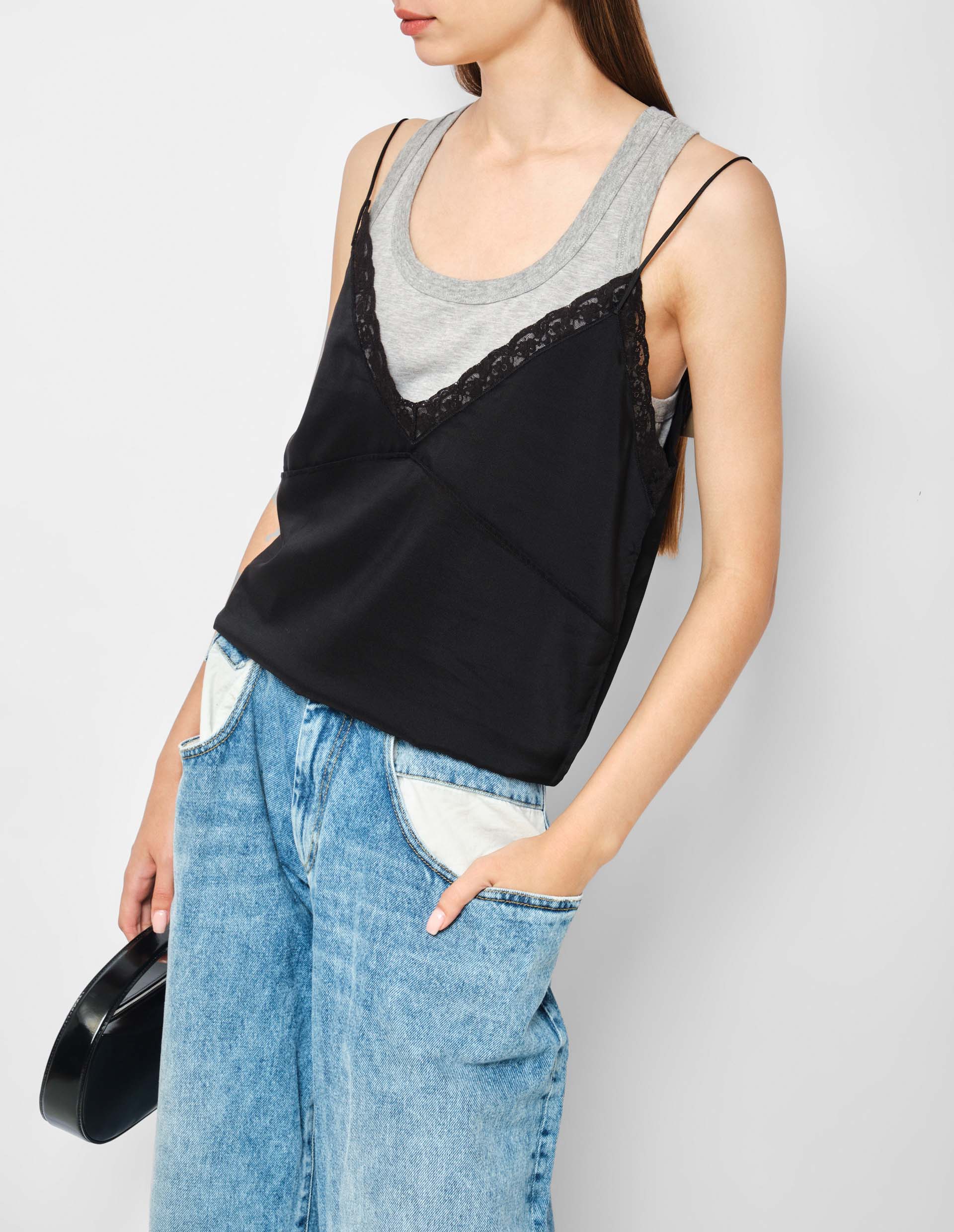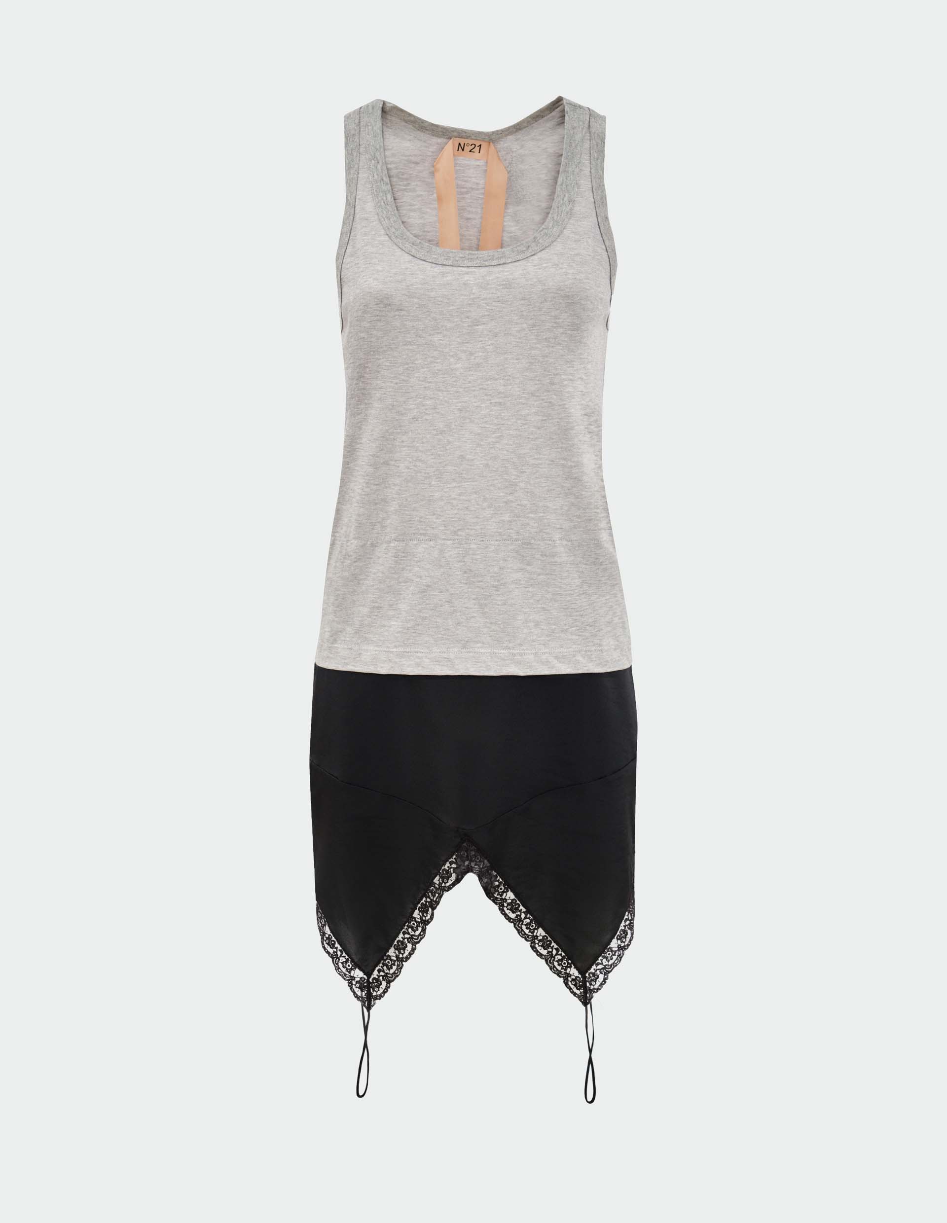 Неожиданный микс материалов и стилей в духе анархичного гламура представлен в изделии от итальянского бренда №21. Это роскошная модель, соединяющая чистые линии трендового tank топа с вневременной женственностью комбинации: креативное сочетание sport-шика и чувственности. Помня о любви Alessandro Dell'Acqua к созданию собственных правил, их нарушению и игнорированию кодексов bon-ton, самые смелые девушки могут носить данную модель, опустив комбинацию, словно в спешке надетое платье после тайной встречи.