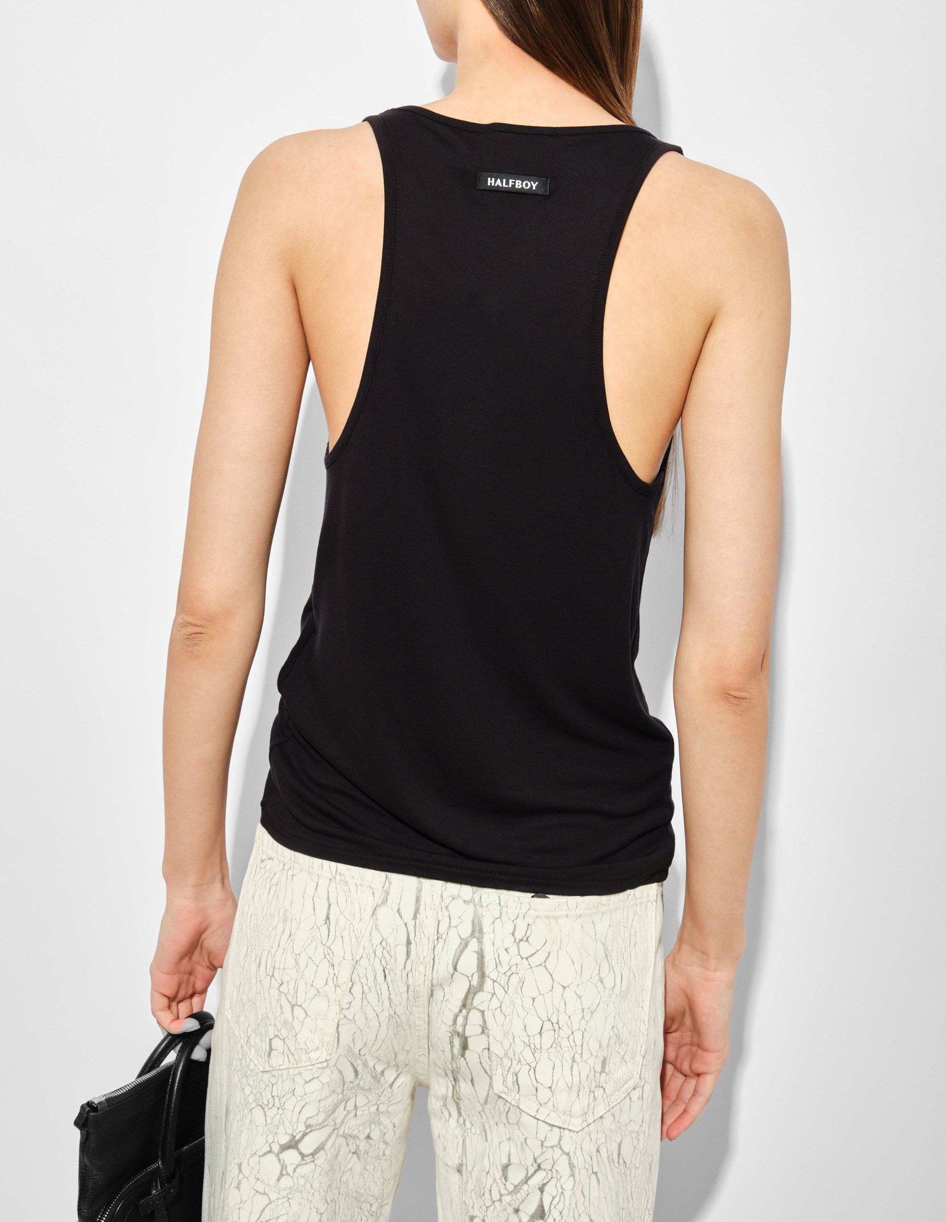 Черный tank топ от Halfboy гармонично миксует минимализм и функциональность. Выполненный из тонкого премиального трикотажа, он подчеркивает легкость и комфорт. Широкие проймы и вырез racer на спине добавляют образу спортивный шик, сохраняя при этом утонченность. Эта модель станет универсальной базой для любого образа — от повседневного до вечернего. Качество итальянского производства и андрогинный крой делают его воплощением ДНК бренда, где каждая деталь говорит о внимании к эстетике и индивидуальности.