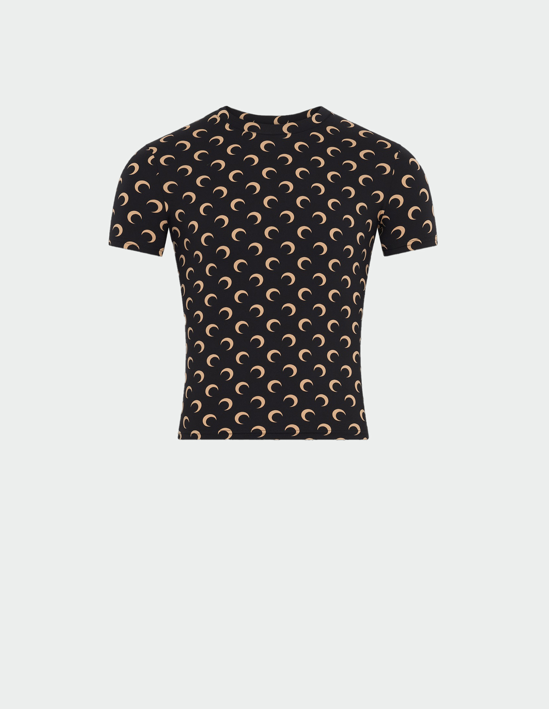 Топ Marine Serre объединяет несколько стержневых концепций бренда: джерси, полностью созданное из переработанных материалов, сертифицированных по стандарту GRS, и легендарный принт All Over Moon. Этот узор стал настоящим символом Дома, отражая его философию одежды будущего, которая звучит как RADICAL CALL FOR LOVE (РАДИКАЛЬНЫЙ ПРИЗЫВ К ЛЮБВИ). Полумесяцы на этой облегающей футболке с короткими рукавами и круглым вырезом нанесены с использованием гравированных металлических цилиндров, что подчеркивает ручной подход и уникальность каждого изделия. Модель входит в культовую линейку SECOND SKIN, изделия которой, как вторая кожа, идеально повторяют контуры тела.