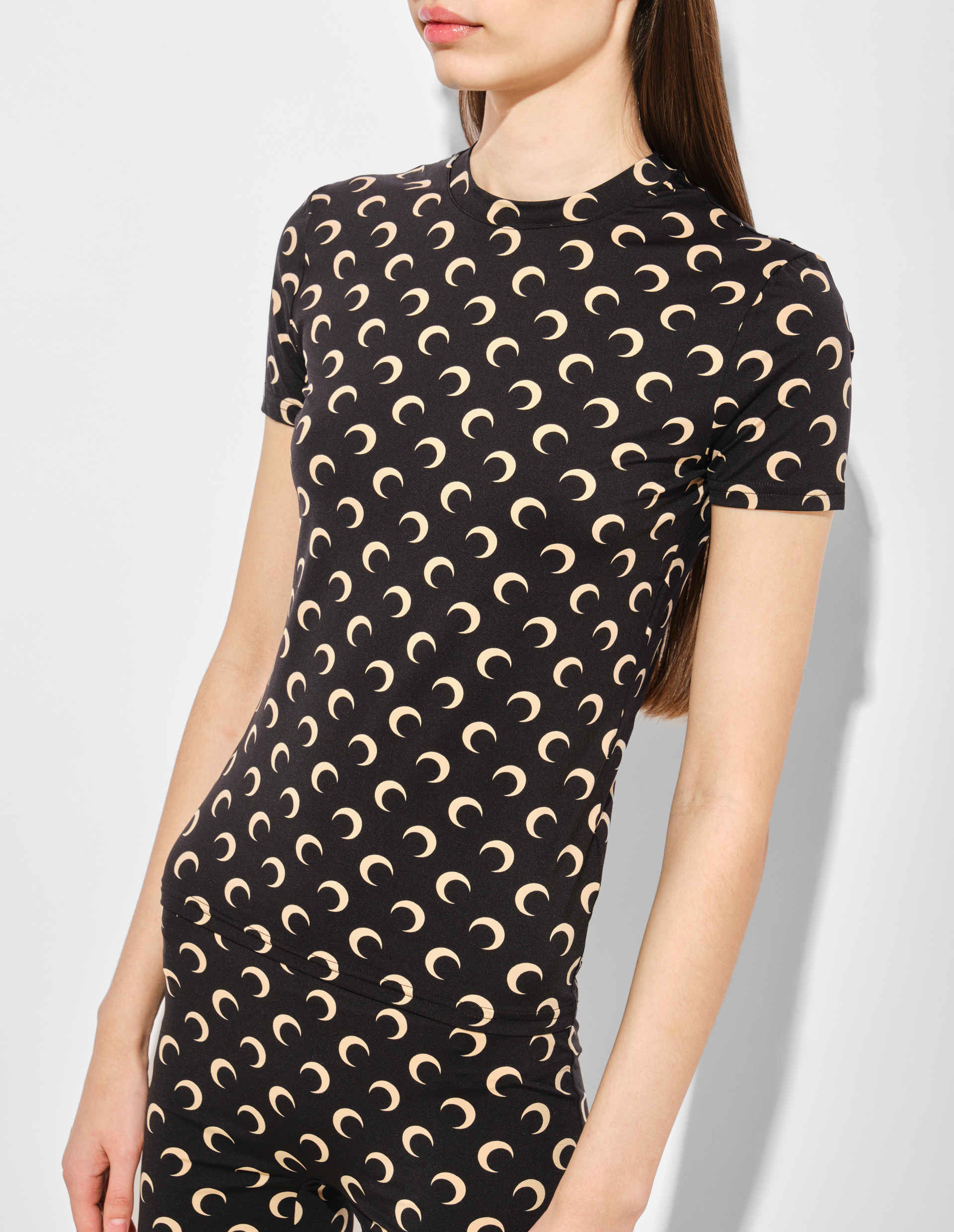 Главный мотив Marine Serre — лунный принт, покрывающий легендарные леггинсы, комбинезоны, топы и водолазки, создающие эффект second skin. Дизайнер восхищается химеризмом спутника Земли и тем, как он представлен — от лунных фаз до древних богинь, исламской иконографии и культового аниме ""Sailor Moon"". Полумесяц — это вечный узор, глубоко духовный символ, означающий женственность, текучесть, возрождение.