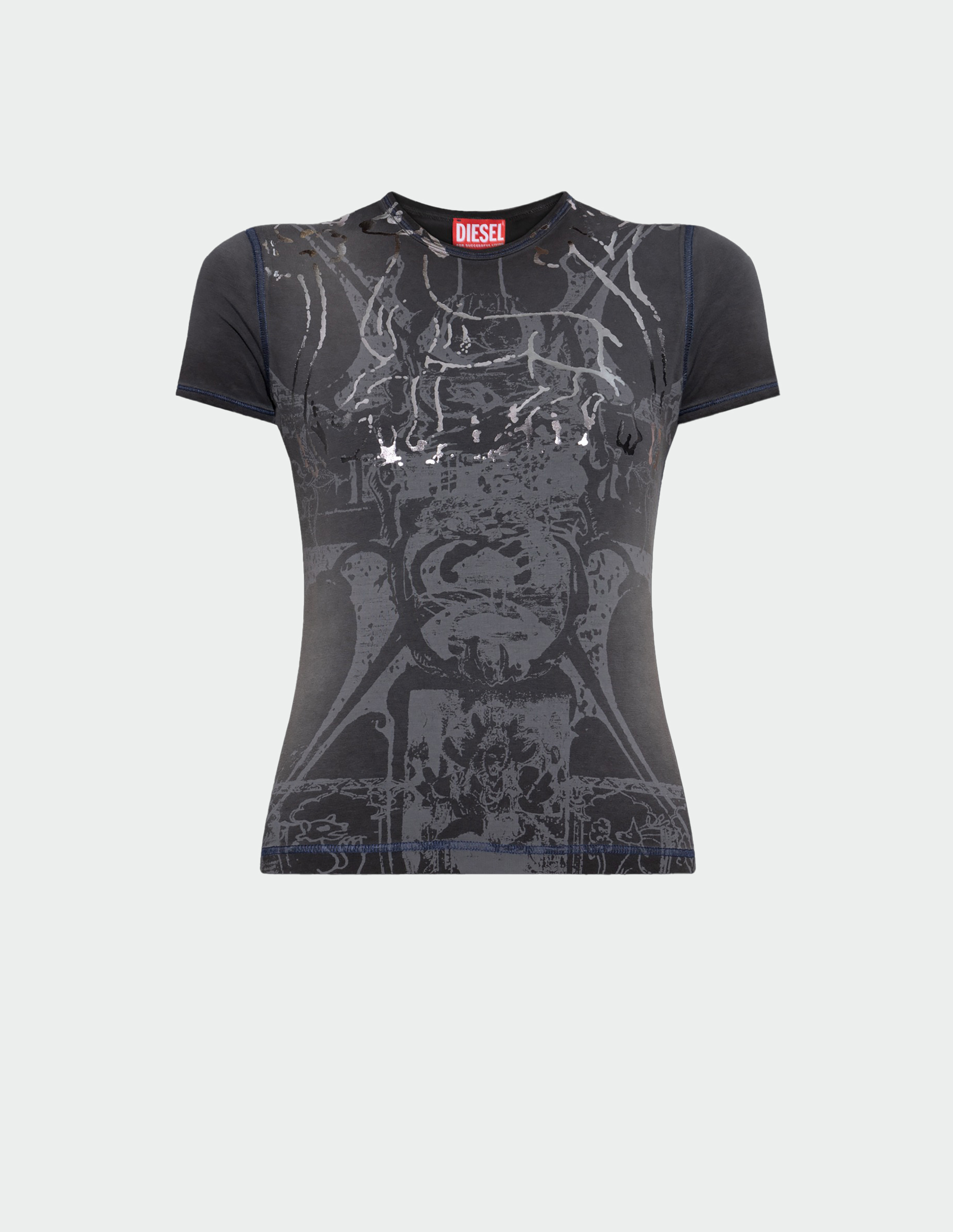 Средневековый шик с бунтарским акцентом – футболка с цифровым принтом и блестящей фольгированной отделкой, добавляющей дерзкий современный акцент историческим мотивам. Плотный эластичный трикотаж из 95% органического хлопка, выращенного с соблюдением экологических стандартов, облегает фигуру, подчеркивая силуэт. Изнанка специально окрашена для создания эффекта винтажного выцветания – типичная для Diesel игра с контрастами.