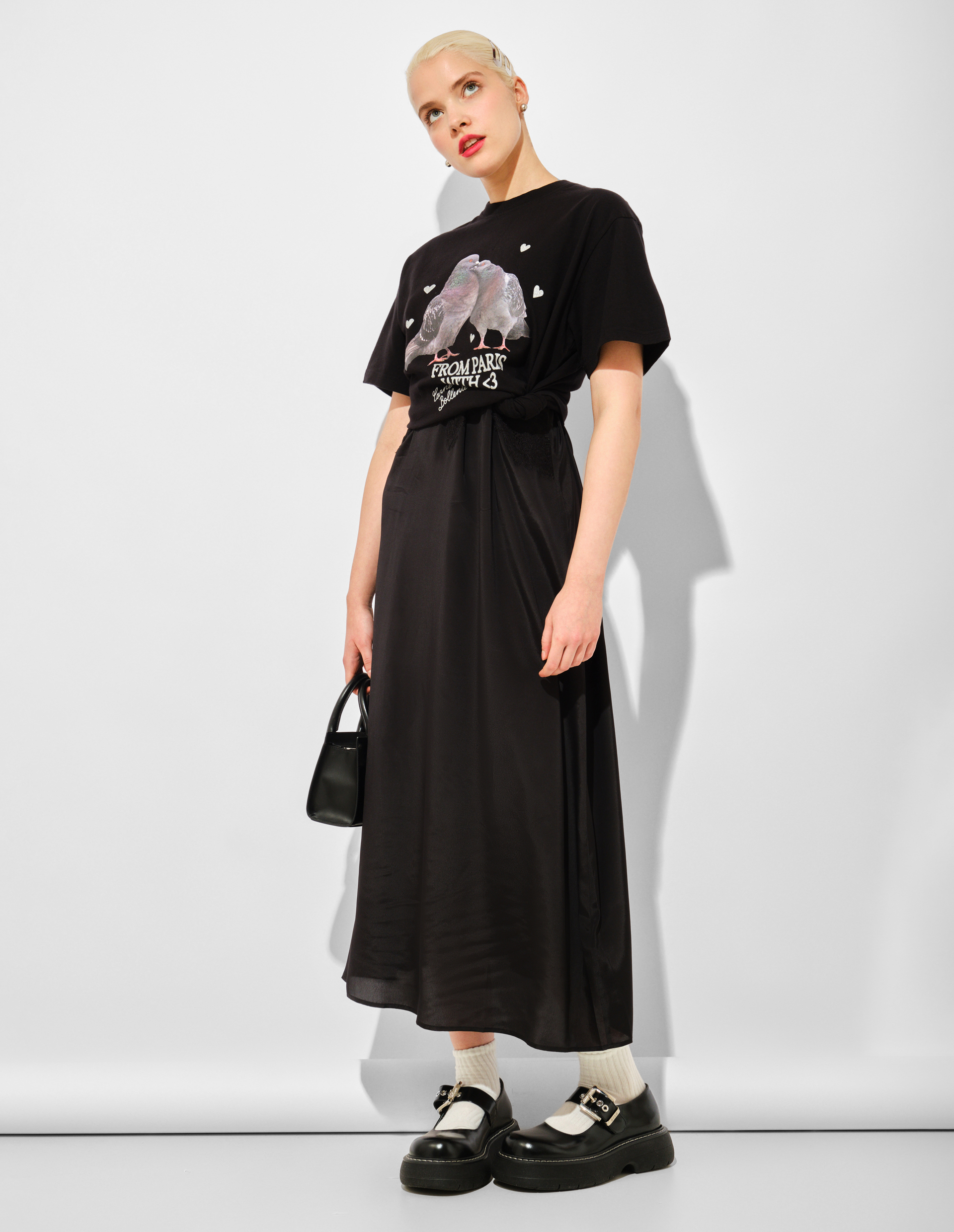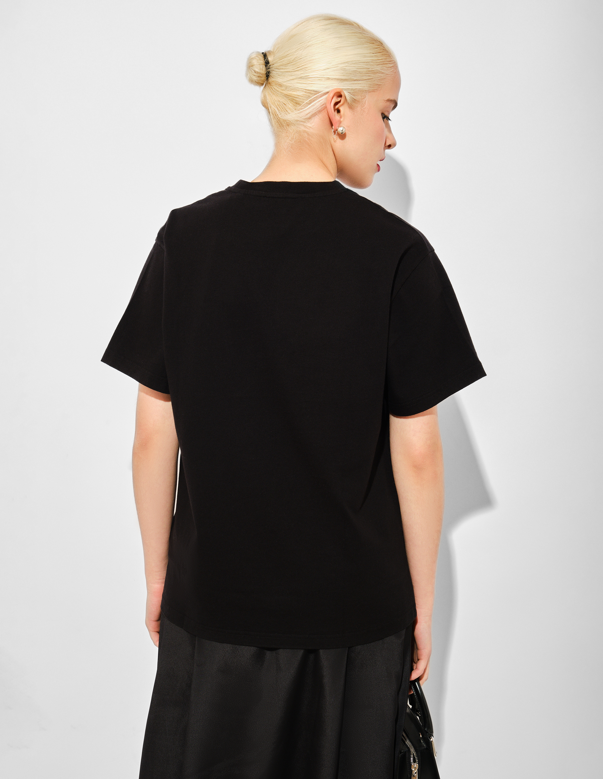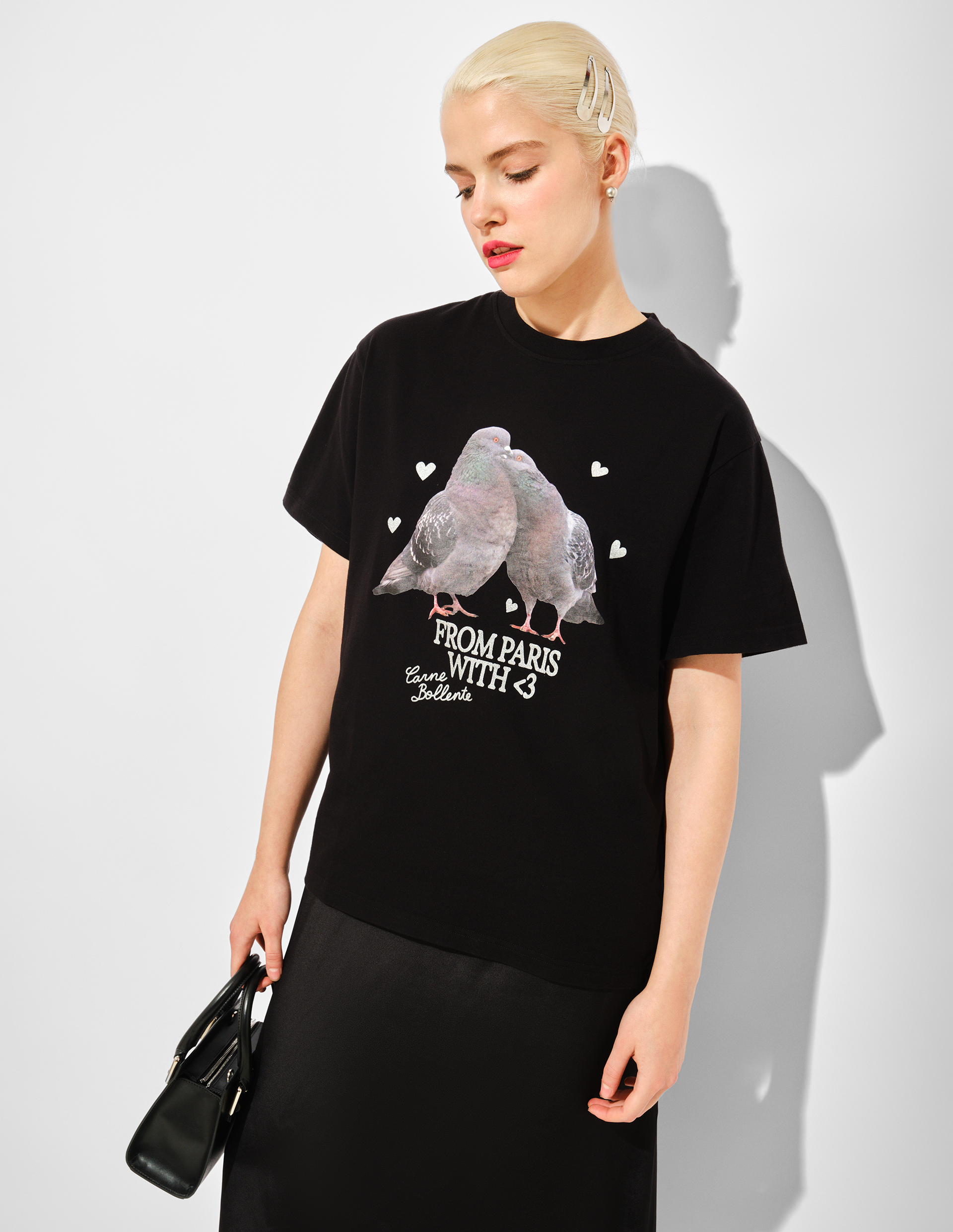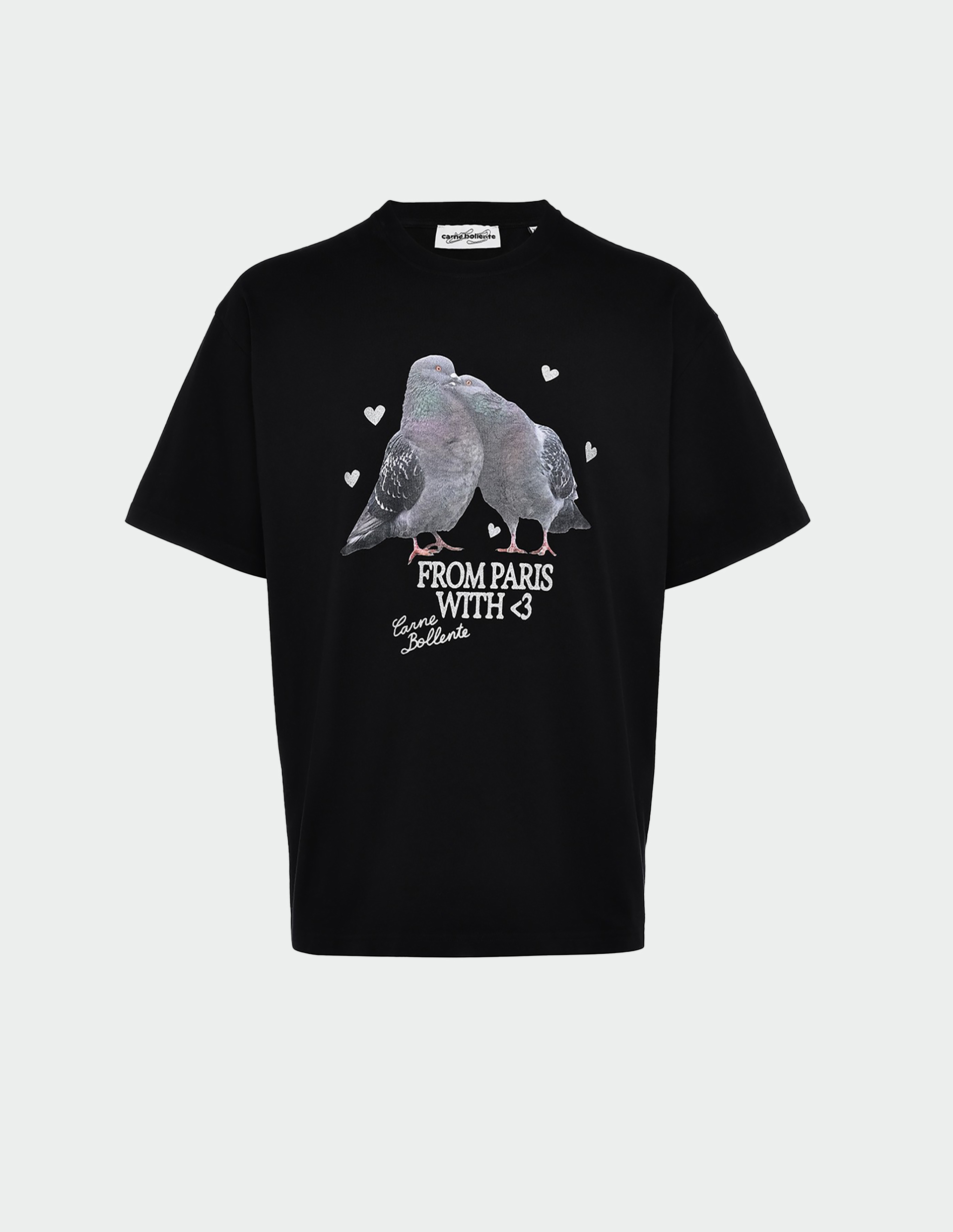 Парижская открытка с двойным дном. На груди, словно на почтовой марке, красуется романтичный дуэт воркующих голубей с подписью «From Paris With Love». Но в контексте Carne Bollente эта идиллия обретает фирменную игривость: в Париже настоящая любовь бывает разной — страстной, нежной и без тени стыда. Мягкий чёрный хлопок становится элегантным фоном для сюжета, который балансирует между милой наивностью и тонким намёком, превращая простую футболку в остроумное заявление.