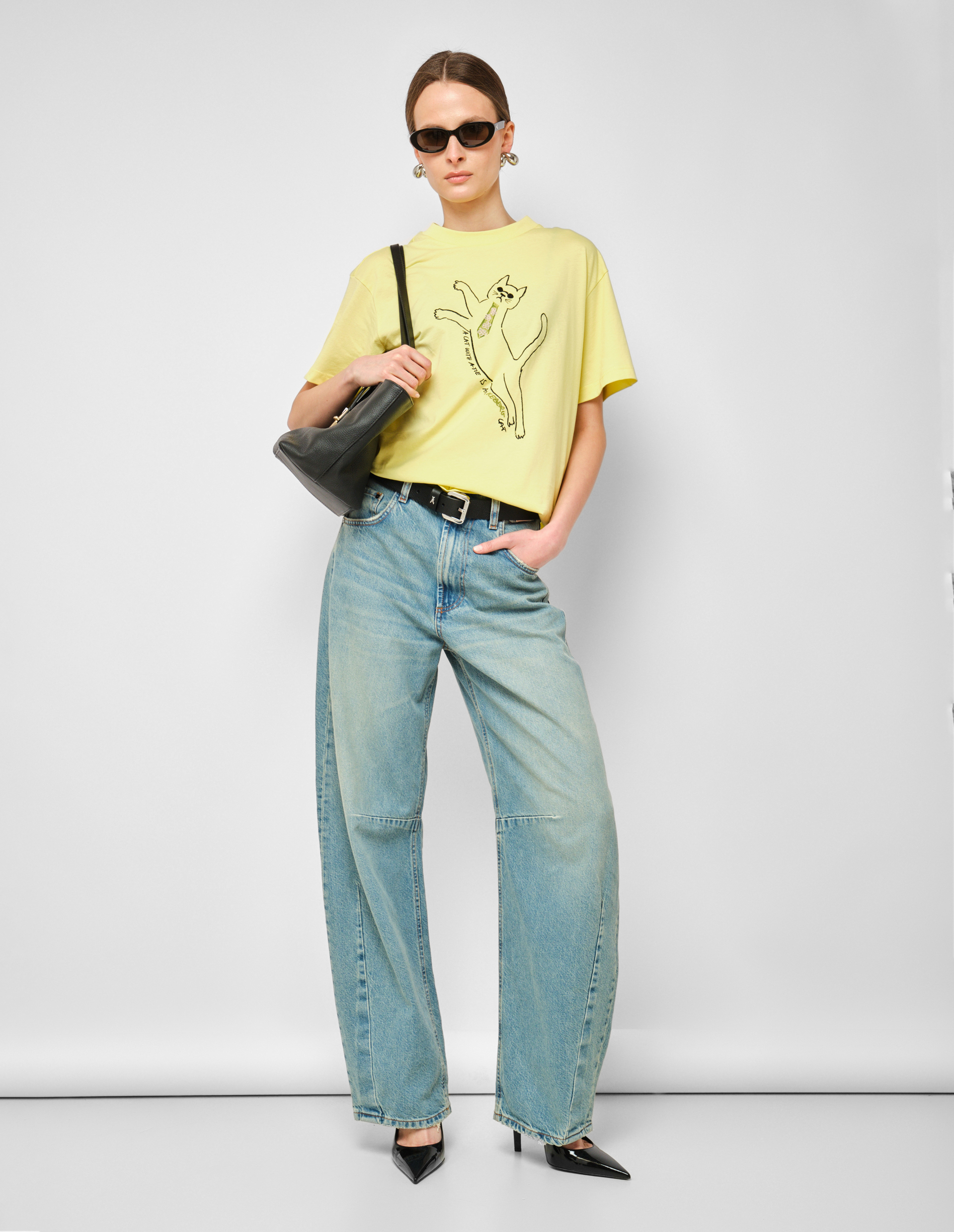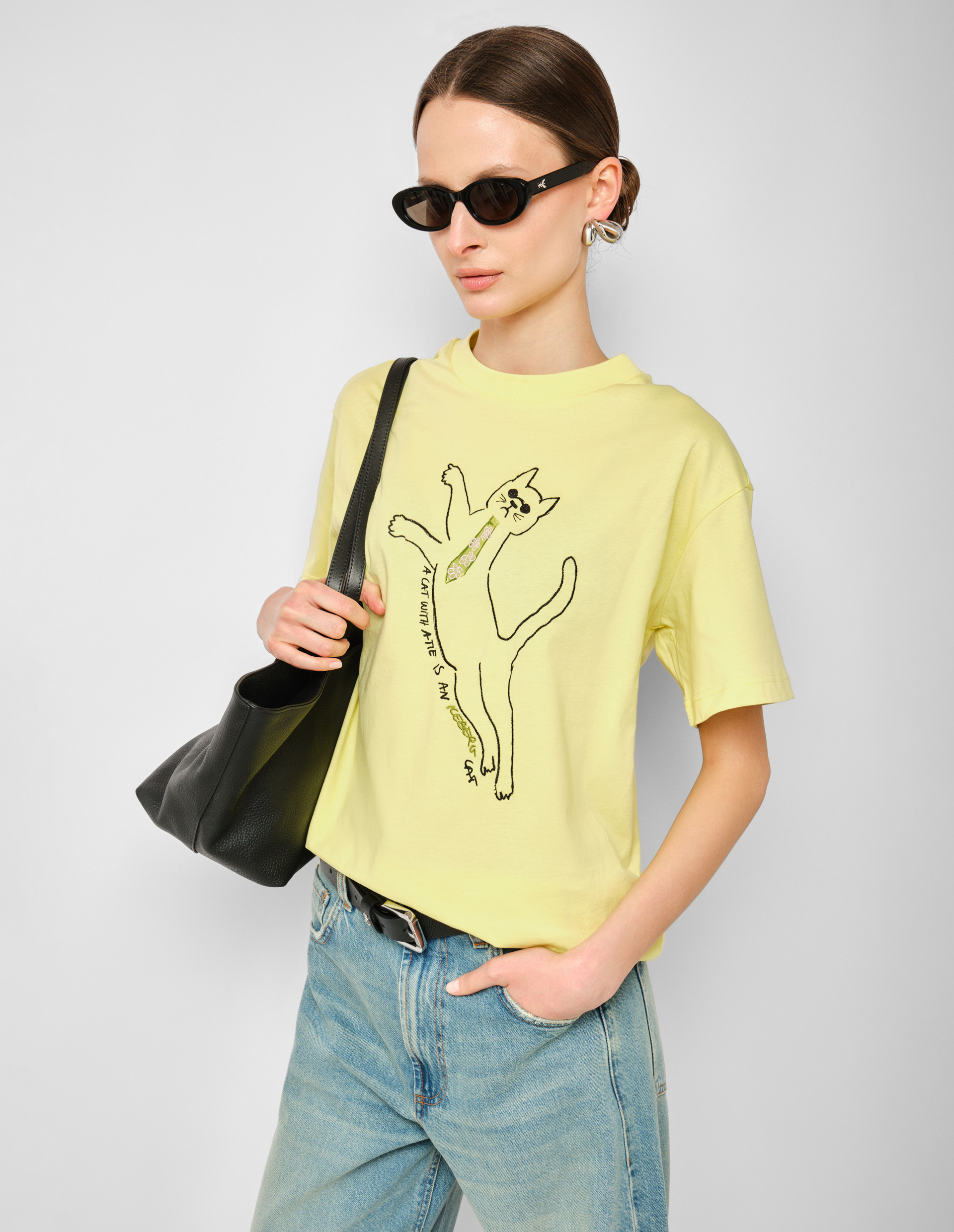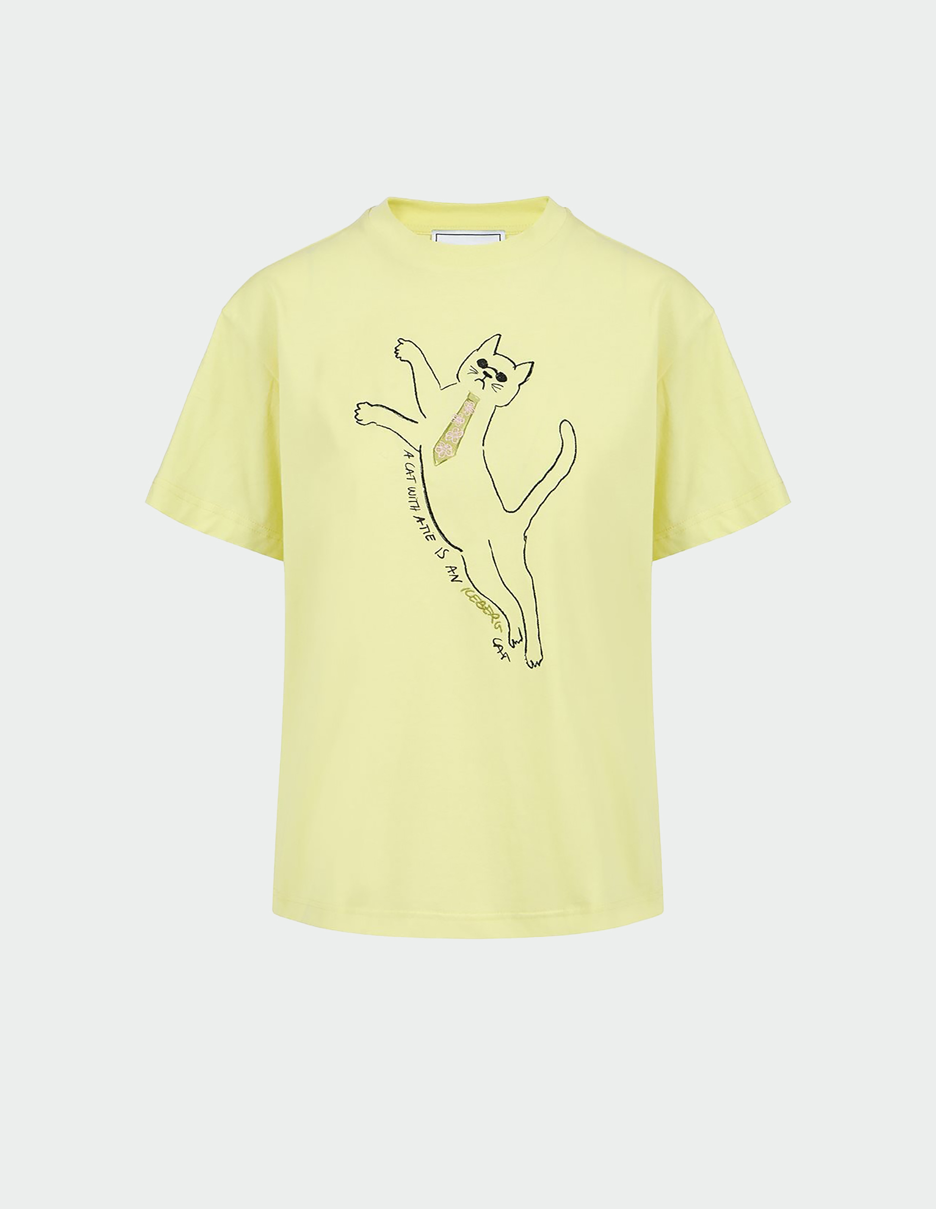 Светло-желтая футболка с принтом кота на груди