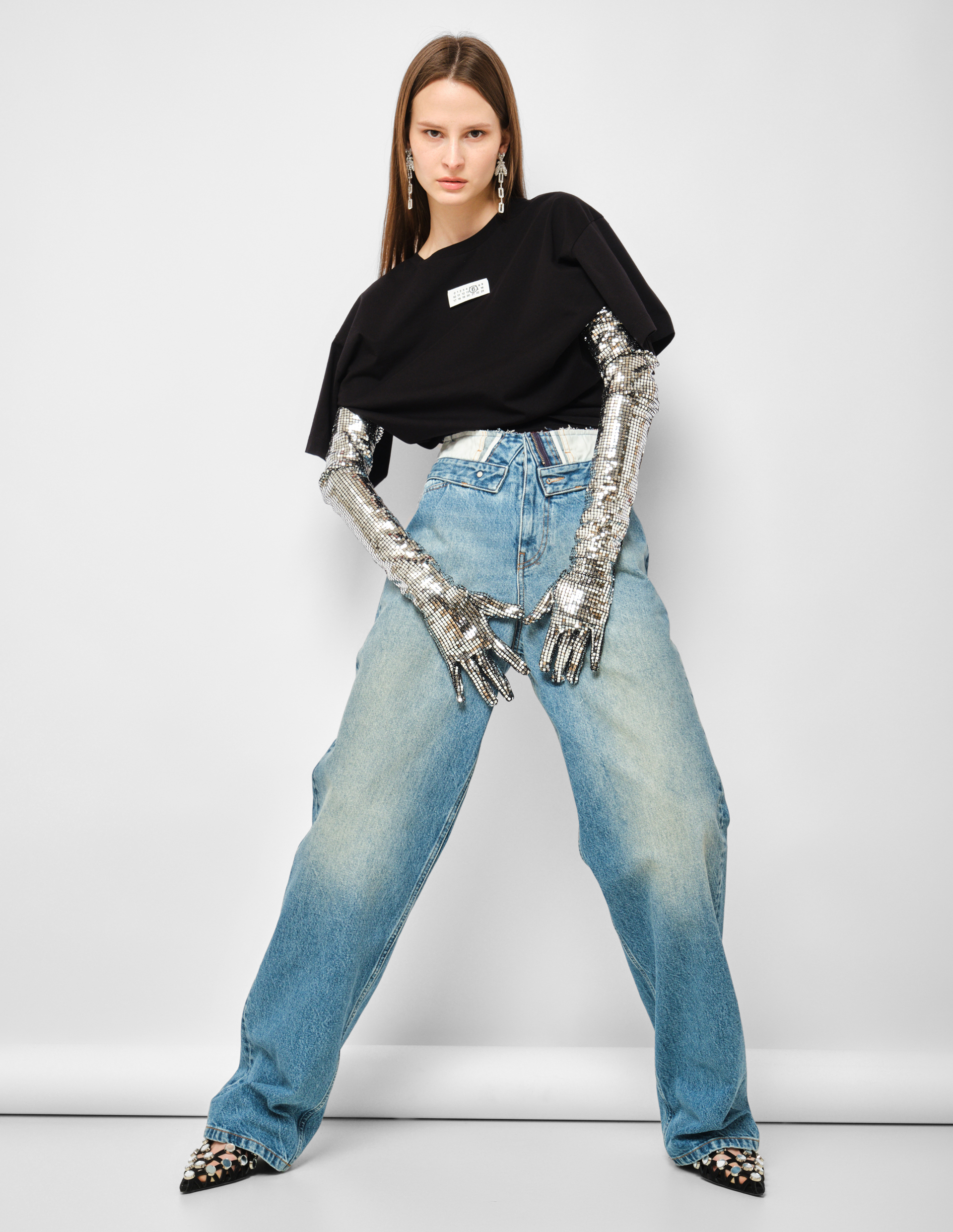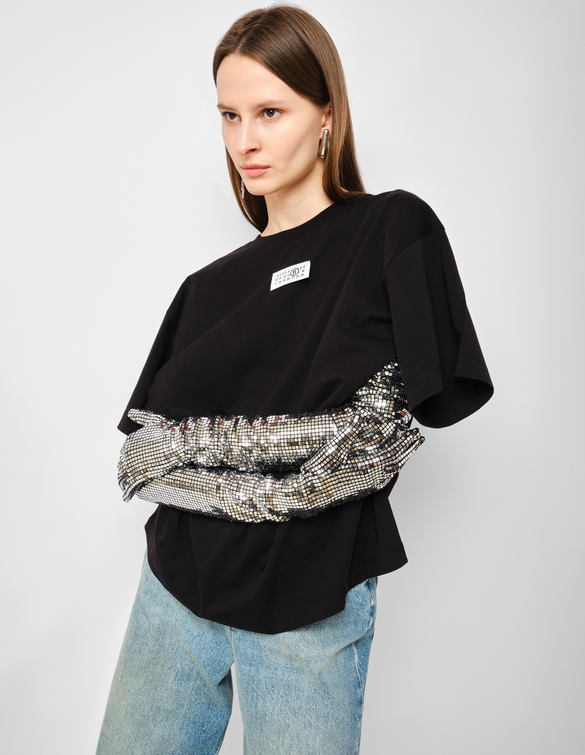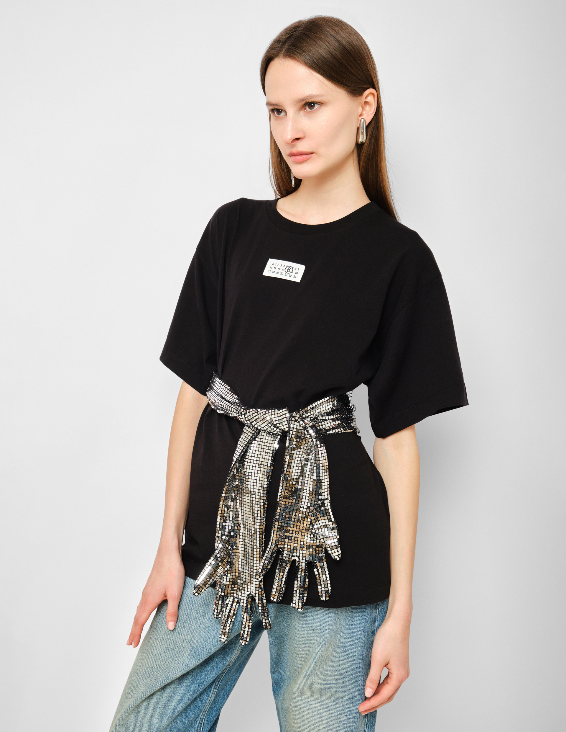 Диско-шар встречает деконструкцию. Эта футболка от MM6 Maison Margiela — возможно, самая праздничная вещь в гардеробе философского минимализма. Мягкая черная футболка оверсайз-кроя из 100% хлопкового джерси могла бы быть просто идеальной базой, если бы не главная архитектурная деталь: в боковые швы вшиты высокие перчатки, щедро расшитые кристаллами, словно поверхность диско-шара . Это не просто декор — это инструмент трансформации, доведенный до степени чистого восторга. Вы можете надеть перчатки, и футболка превратится в гибридный предмет гардероба, где уличная простота встречается с клубным гламуром. Или снять их и завязать на поясе, создавая новый объем и графический акцент, меняющий силуэт до неузнаваемости. Кристаллы вспыхивают при каждом движении, преображая минималистичную основу в настоящий праздник света. Оверсайз-крой дарит абсолютную свободу и создает тот самый расслабленный силуэт, который сегодня выбирают главные фэшн-инфлюенсеры. Фирменная белая строчка из четырех стежков сзади — сдержанная подпись мастера, заметная лишь посвященным . Сегодня мода на трансформеры и вещи с несколькими лицами достигает новых высот — эта футболка дает вам три разных настроения в одной покупке: расслабленное базовое, структурированное с поясом и концептуально-праздничное с надетыми перчатками. Носите ее с классическими брюками и минималистичными аксессуарами, позволяя перчаткам стать единственным, но самым выразительным акцентом. Или с джинсами и грубыми ботинками, завязав перчатки на поясе, чтобы создать контраст уличной эстетики и клубного шика. Польза этой вещи — в ее трансформативности и способности быть разной каждый день, подчиняясь вашему настроению. Важный нюанс: перчатки с кристаллами требуют бережного отношения — рекомендуется стирка в холодной воде в мешочке для деликатных тканей и сушка вдали от прямых солнечных лучей, чтобы сохранить блеск кристаллов . Состав из 100% хлопка гарантирует комфорт и долговечность.
