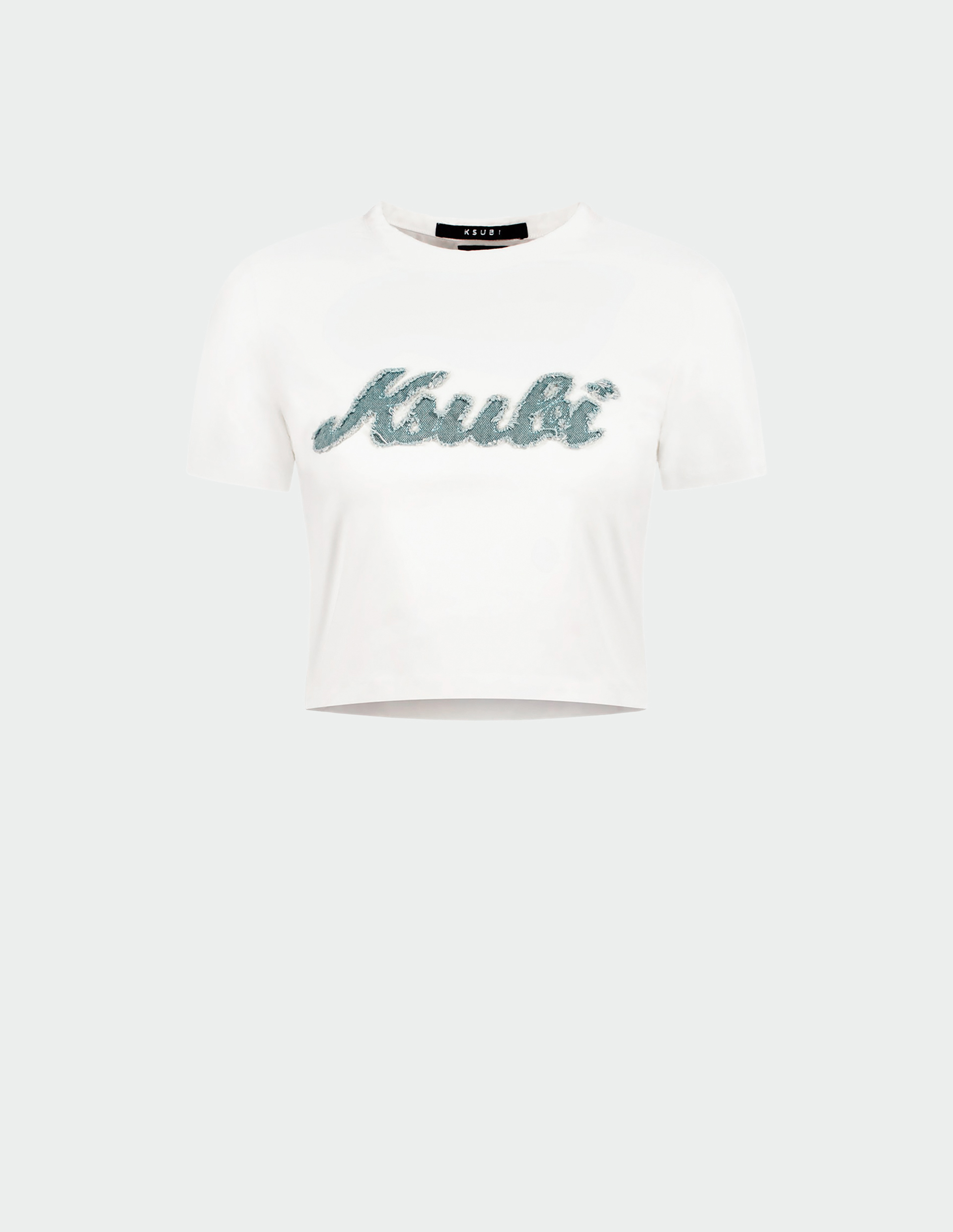 Графический контраст и игра фактур. Эта укороченная футболка от KSUBI превращает минималистичный белый топ в носитель фирменной брендовой идентичности. Модель выполнена из мягкого хлопкового джерси, который обеспечивает комфорт и сохранение формы. Ключевой акцент — крупное нашитое лого KSUBI из синего денима, которое контрастирует с белоснежным фоном не только цветом, но и текстурой: мягкая гладкость хлопка встречается с шероховатой плотностью джинсовой ткани. Укороченная длина создает современный, динамичный силуэт, делая эту футболку идеальным верхом для брюк и юбок с высокой посадкой.