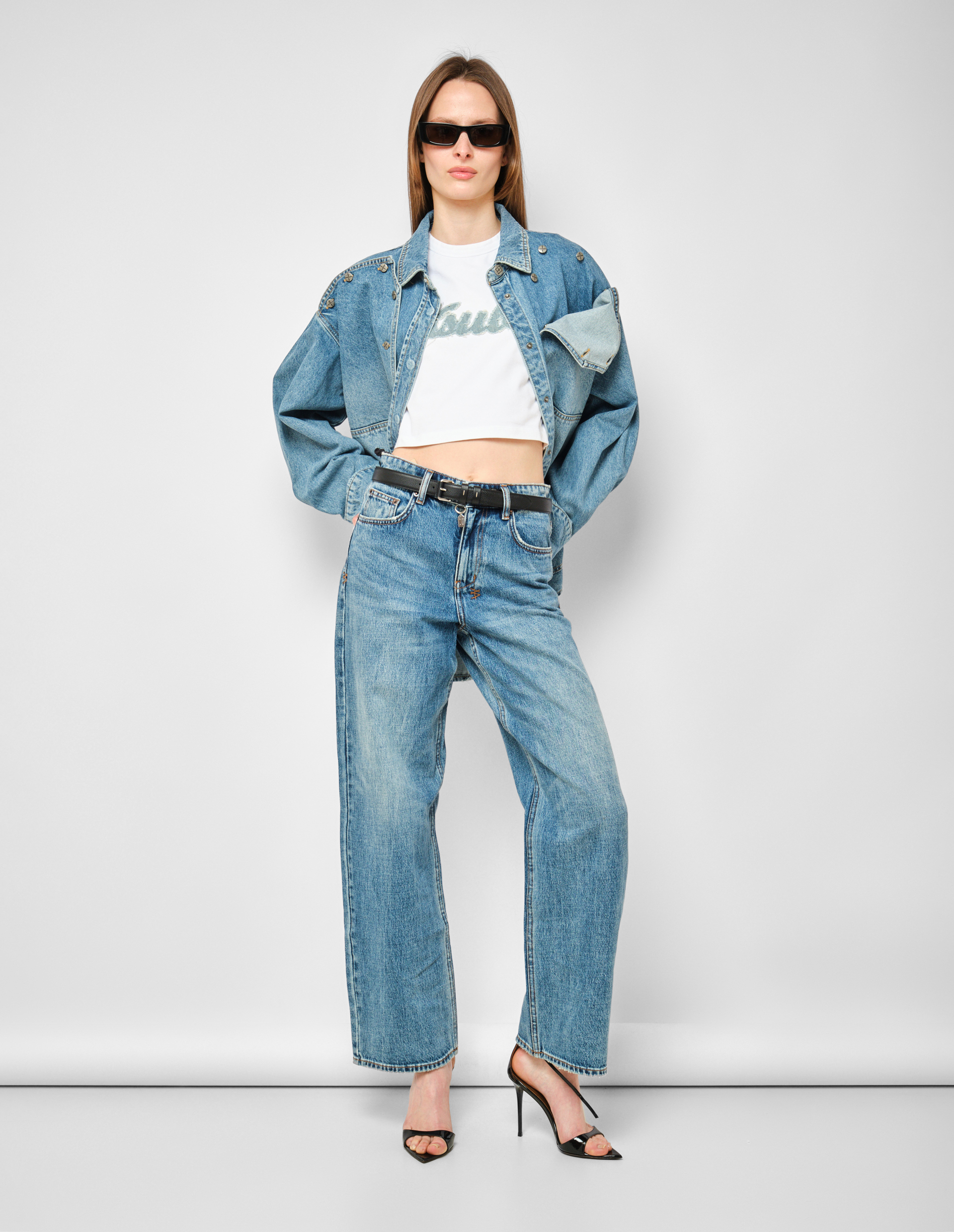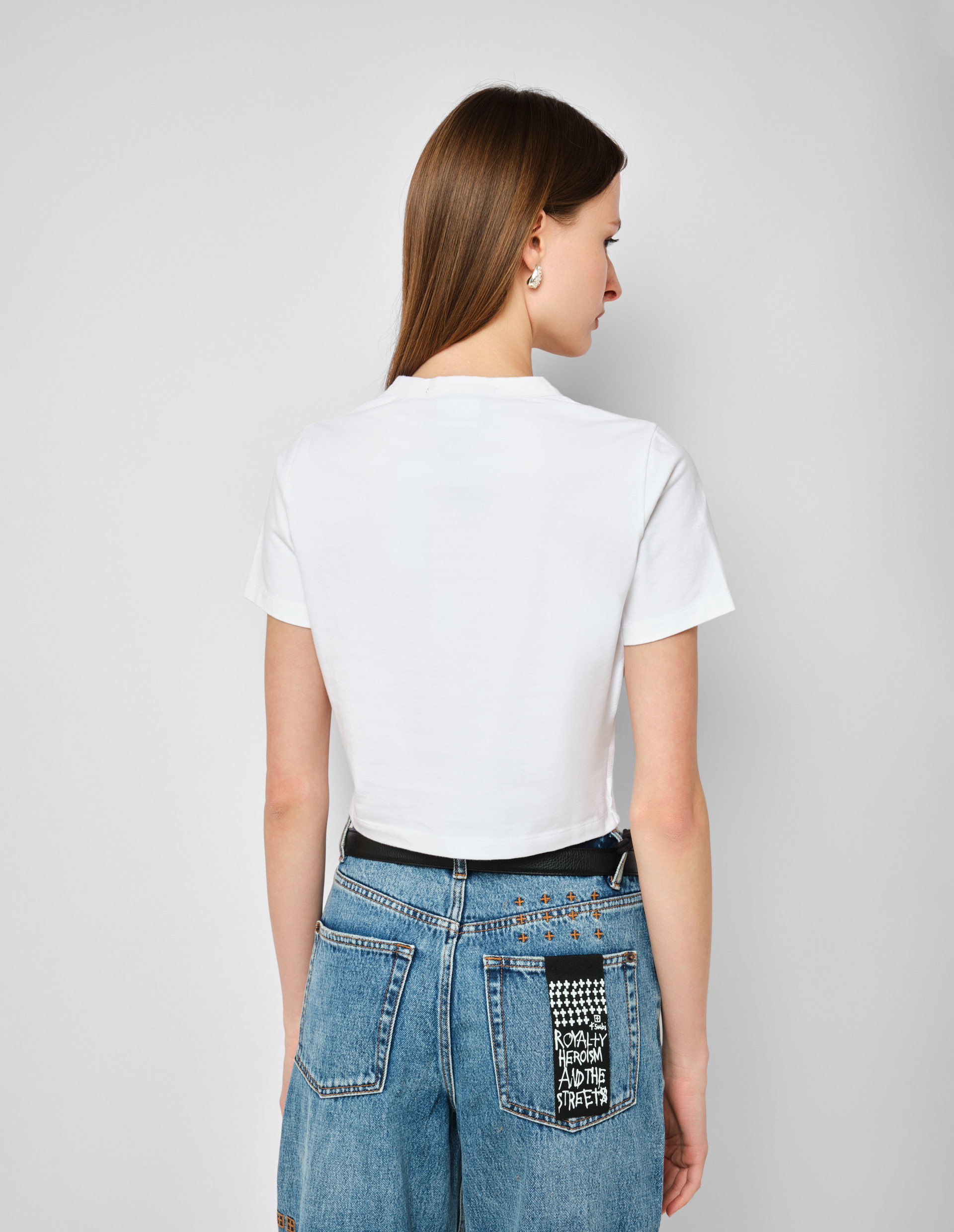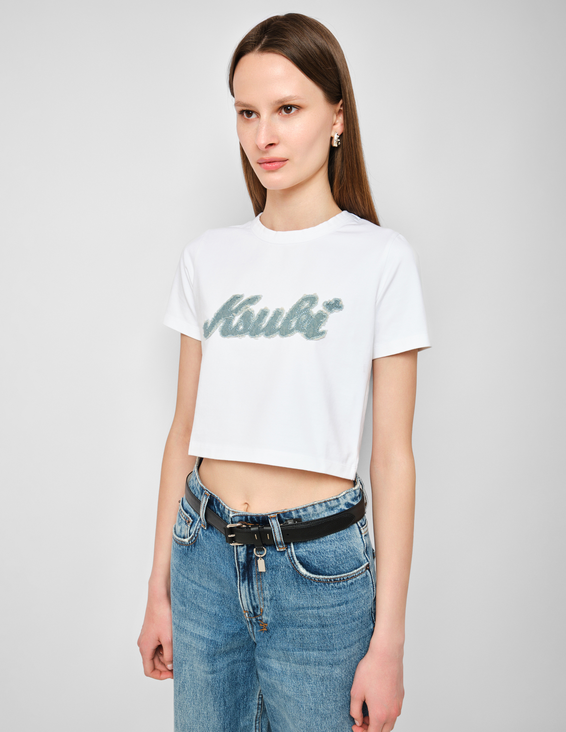 Укороченная белая футболка с джинсовой нашивкой-логотипом