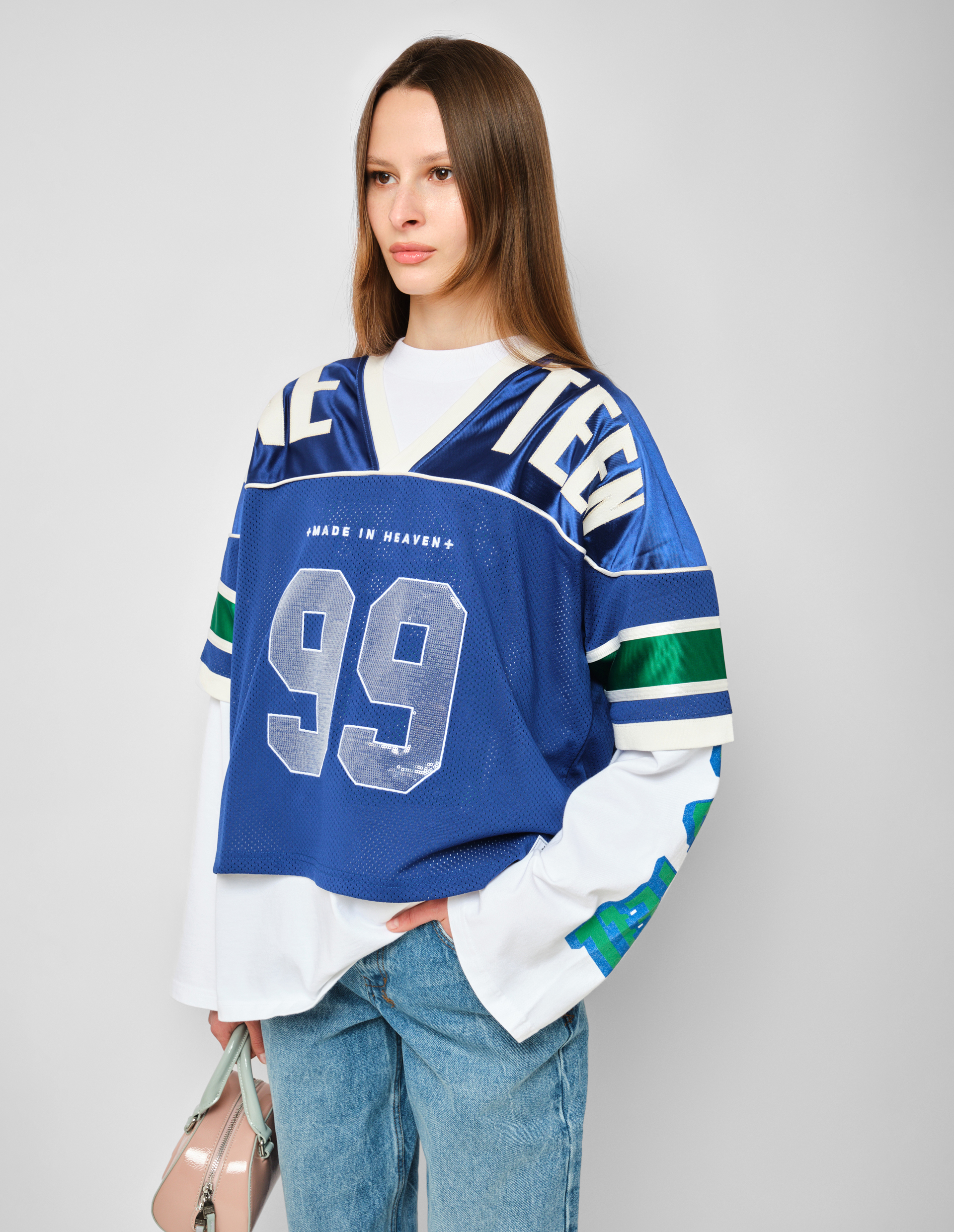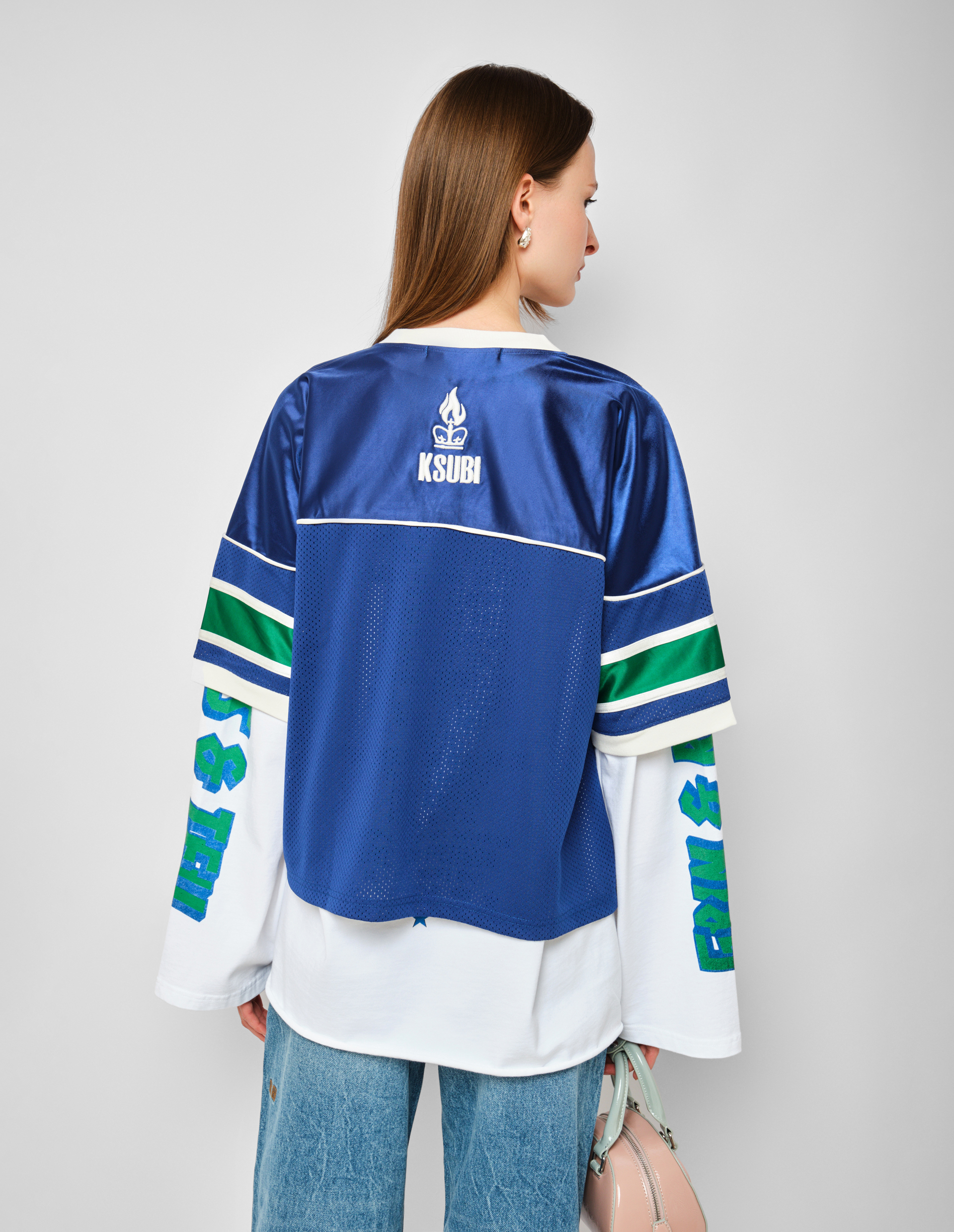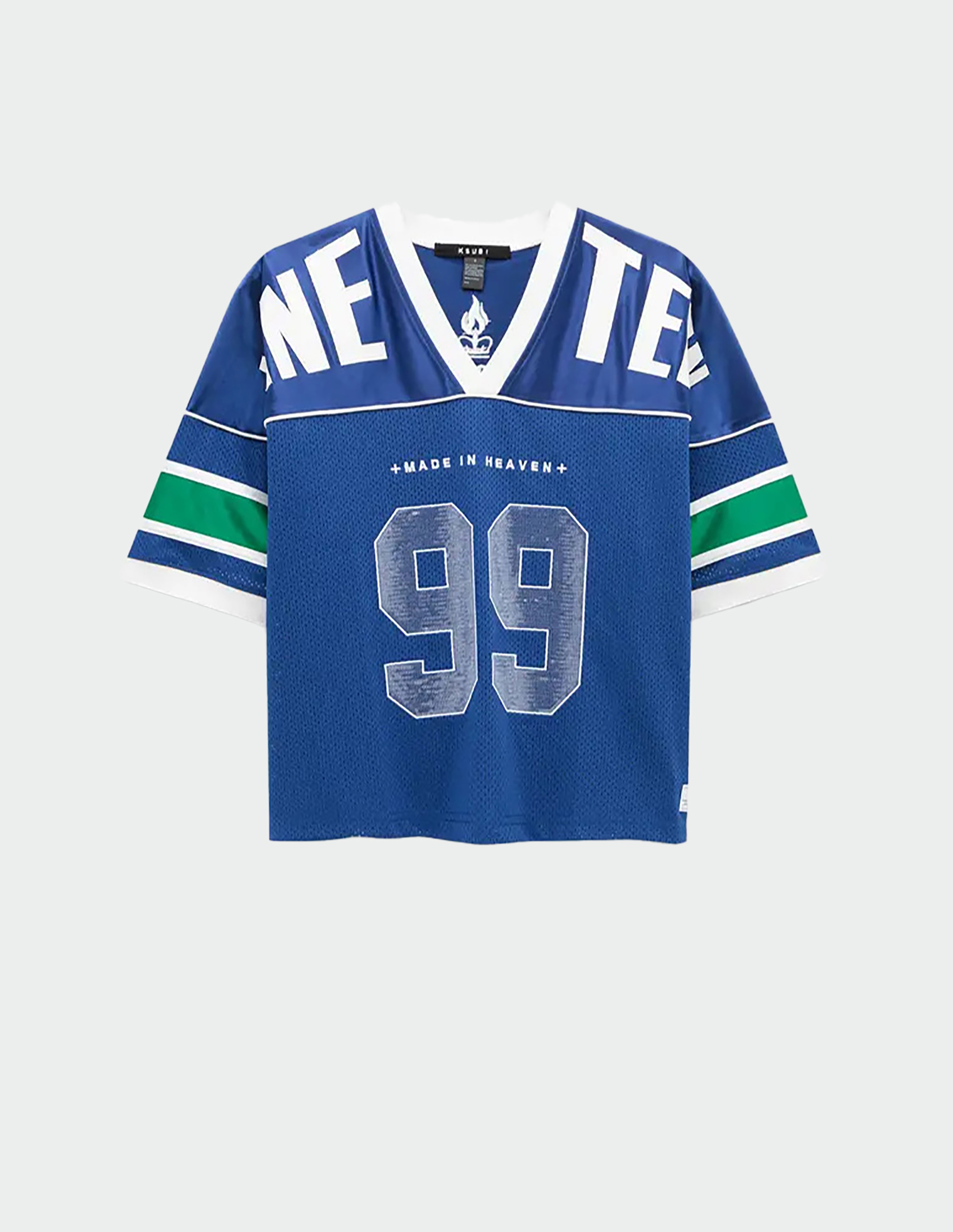 Спортивный люкс с баскетбольной фактурой. Эта майка от KSUBI представляет собой гибрид эстетики 90-х и ультра-современного стритвира. Модель имеет оверсайз-крой со спущенным плечом, V-образным вырезом, коротким рукавом и укороченной длиной, создающей современный, слоистый силуэт. Верх выполнен из премиум-джерси с атласной отделкой, скомбинированного с перфорированной баскетбольной сеткой в ярких сине-зеленых тонах, что добавляет текстуры и спортивной динамики. Контрастная белая окантовка, ребристый воротник и манжеты структурируют силуэт. Главный акцент — объемная аппликация в виде цифр 99, выложенная мерцающими пайетками на груди, а также текстурные графические принты спереди и сзади.