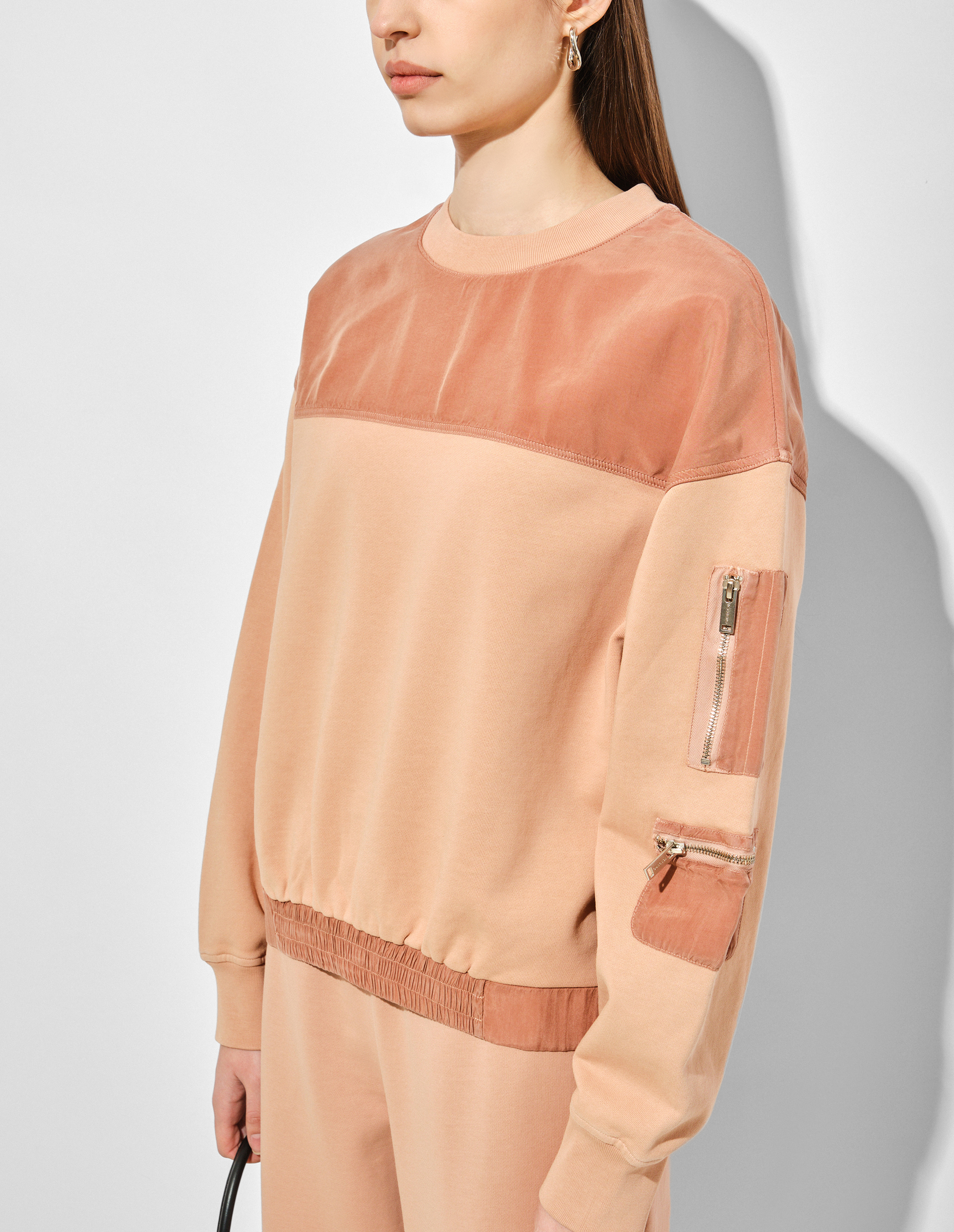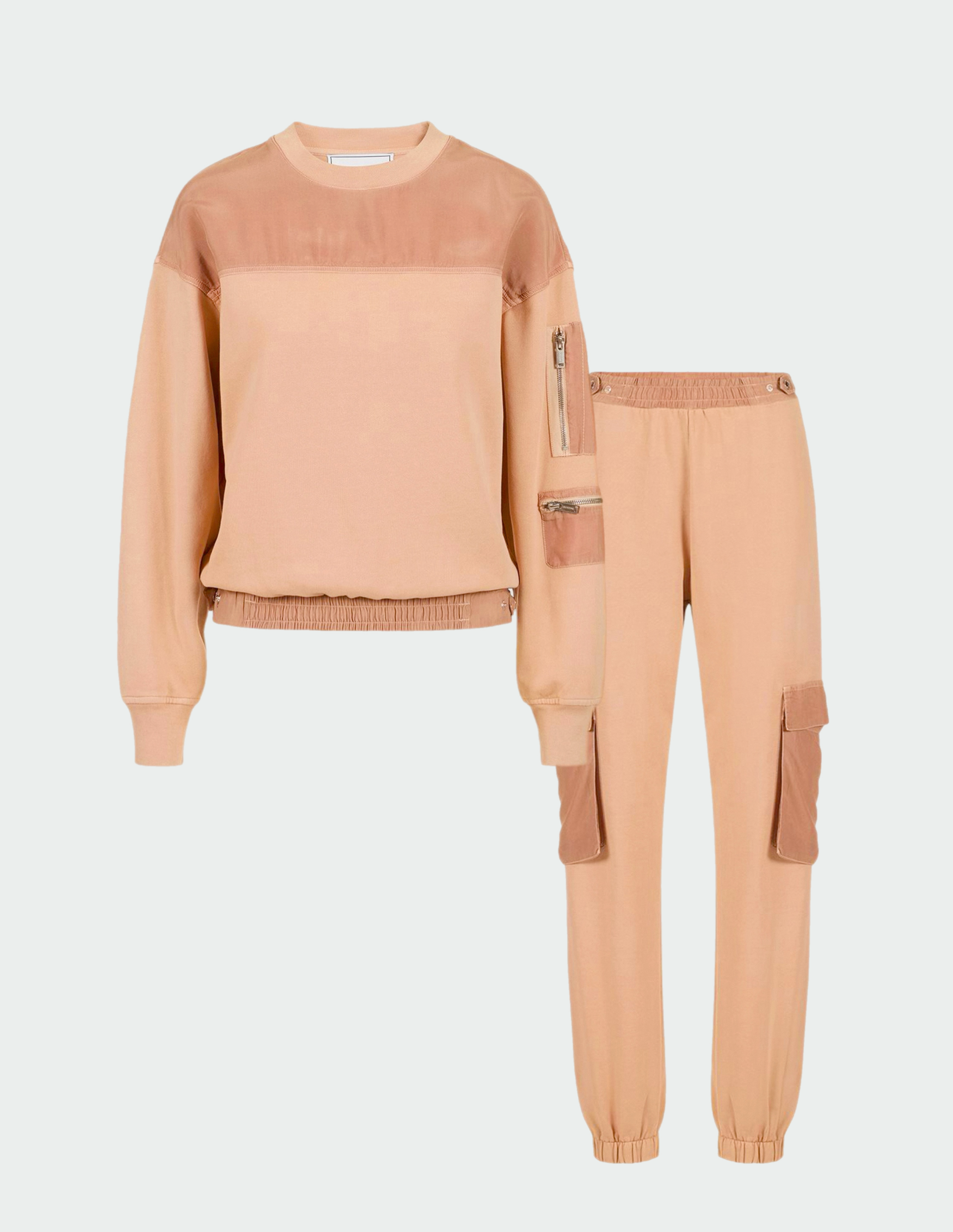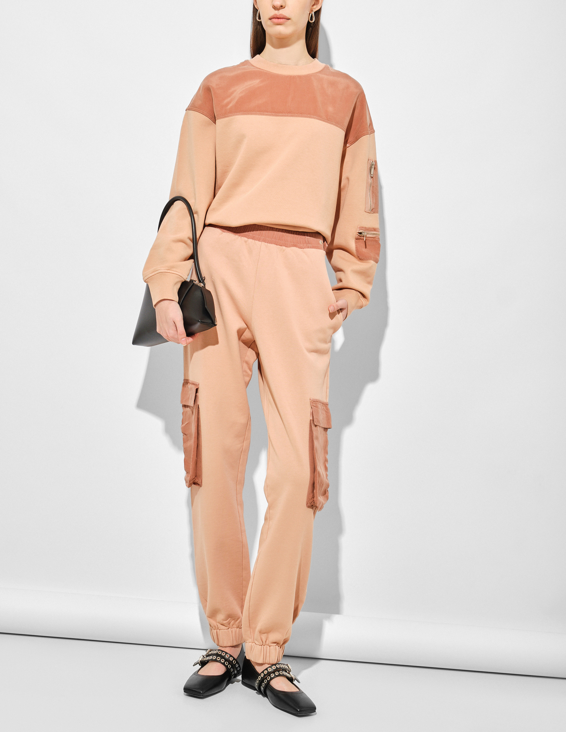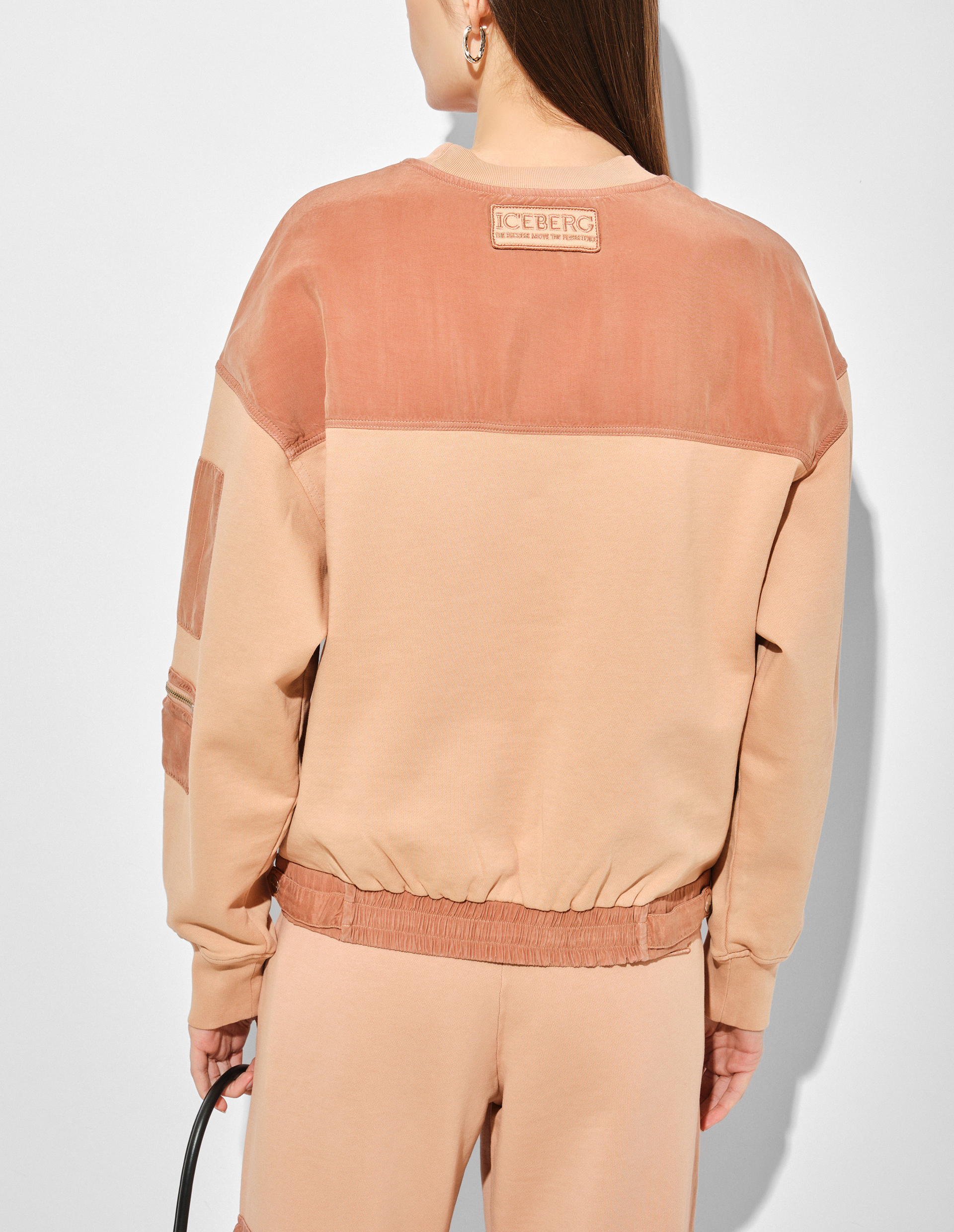Авангардное наследие 70-х и дух инноваций сезона SS25 переопределили концепцию роскошной спортивной одежды, которая нашла свое отражение в этом костюме оттенка Blush. Он представлен свитшотом из хлопка, окрашенным в готовом виде, с круглым вырезом и нашивкой ICEBERG в тон, добавляющей нотку фирменной элегантности. Брюки-карго также изготовлены из хлопкового флиса, обеспечивающего абсолютный комфорт благодаря своей мягкости. На их эластичном поясе, а также по линии низа толстовки предусмотрены регулировочные ремешки на кнопках — функциональность и изысканность, проявленная в деталях. Карманы на рукавах и бедрах выполнены из техноматериала купро в том же оттенке, что и костюм, чтобы сохранить идею утонченности и практичности.