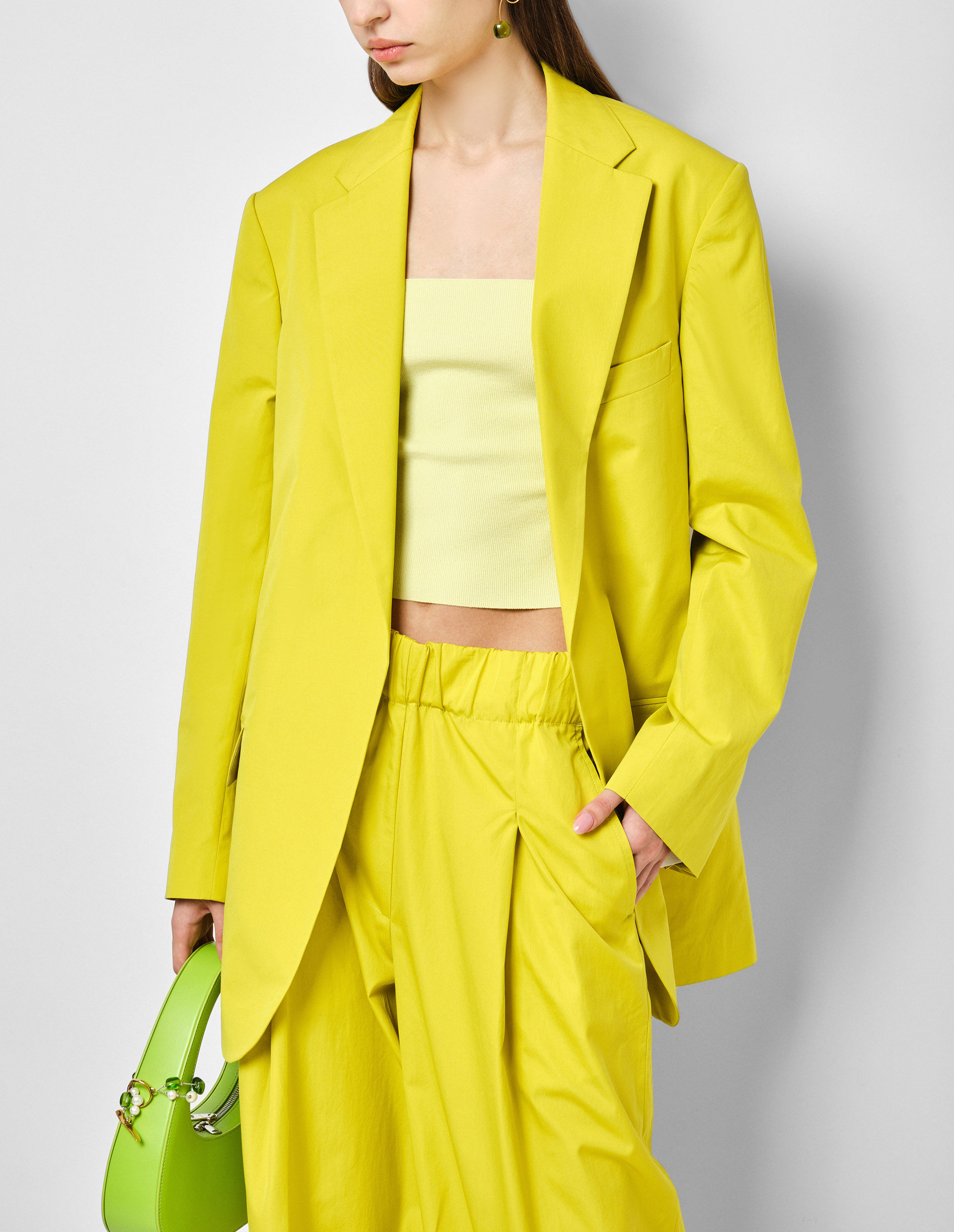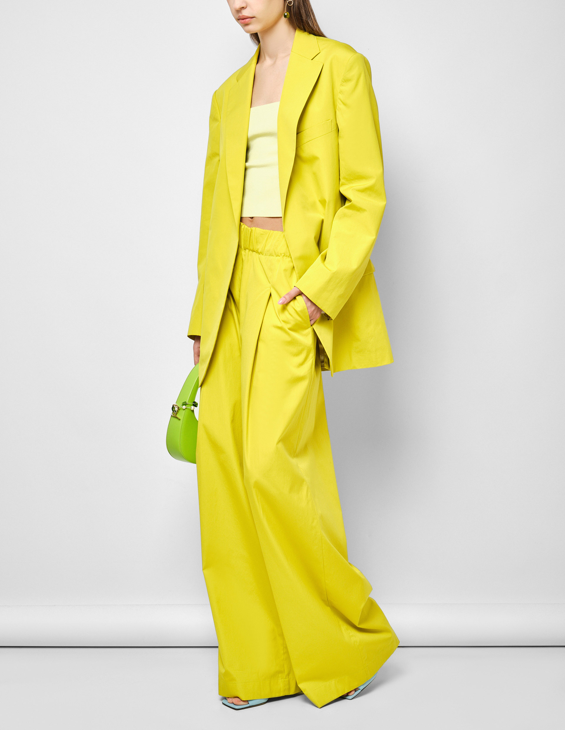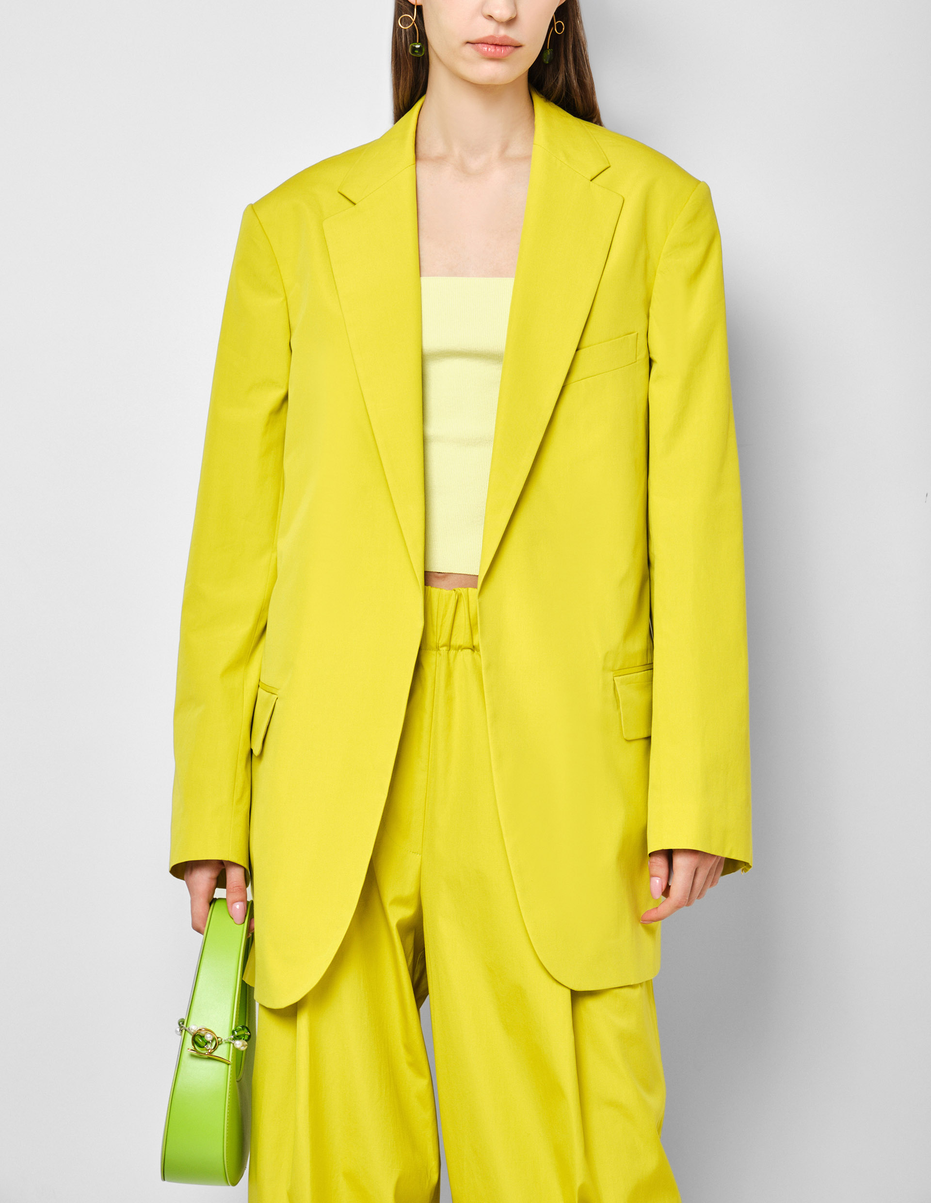 Преображаем офисные аутфиты в по-настоящему яркие и летние вместе с удлиненным желтым пиджаком без пуговиц BLUR. Его акцентный флуоресцентный оттенок создает ощущение summer party, а отсутствие пуговиц придает то самое расслабленное и непринужденное настроение. Несмотря на такие контрастные детали, пиджак выполнен в соответствии с классическими характеристиками как зазубренные лацканы, длинные рукава с разрезами на манжетах, шлица по центру сзади и прорезные карманы, а особо прочное плетение интерлок из высококачественного хлопка выдает мастерство бренда Dries Van Noten. Создайте полноценный образ вместе с желтыми широкими брюками PILA от бренда Dries Van Noten.