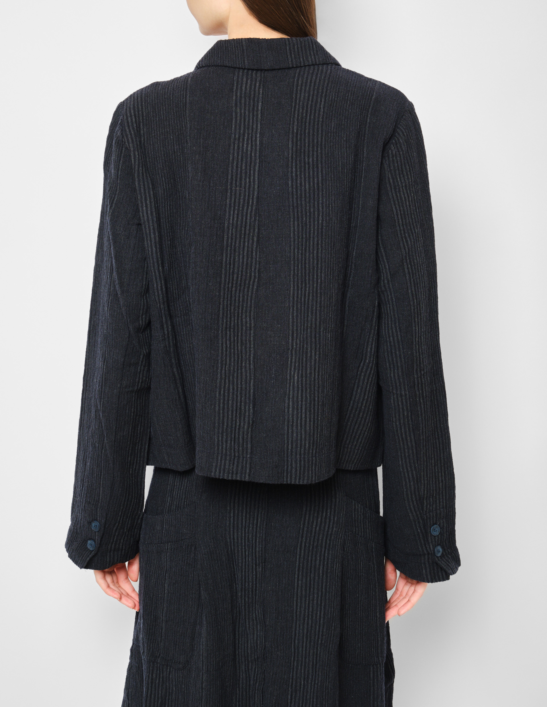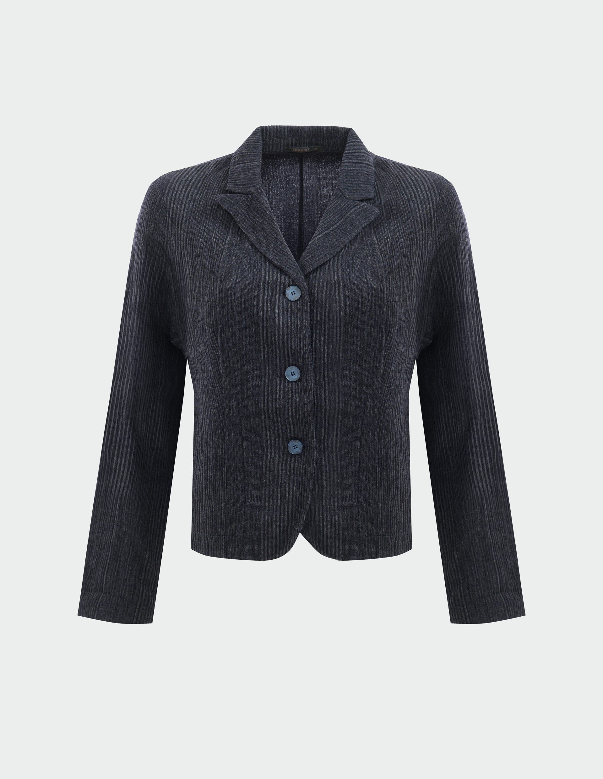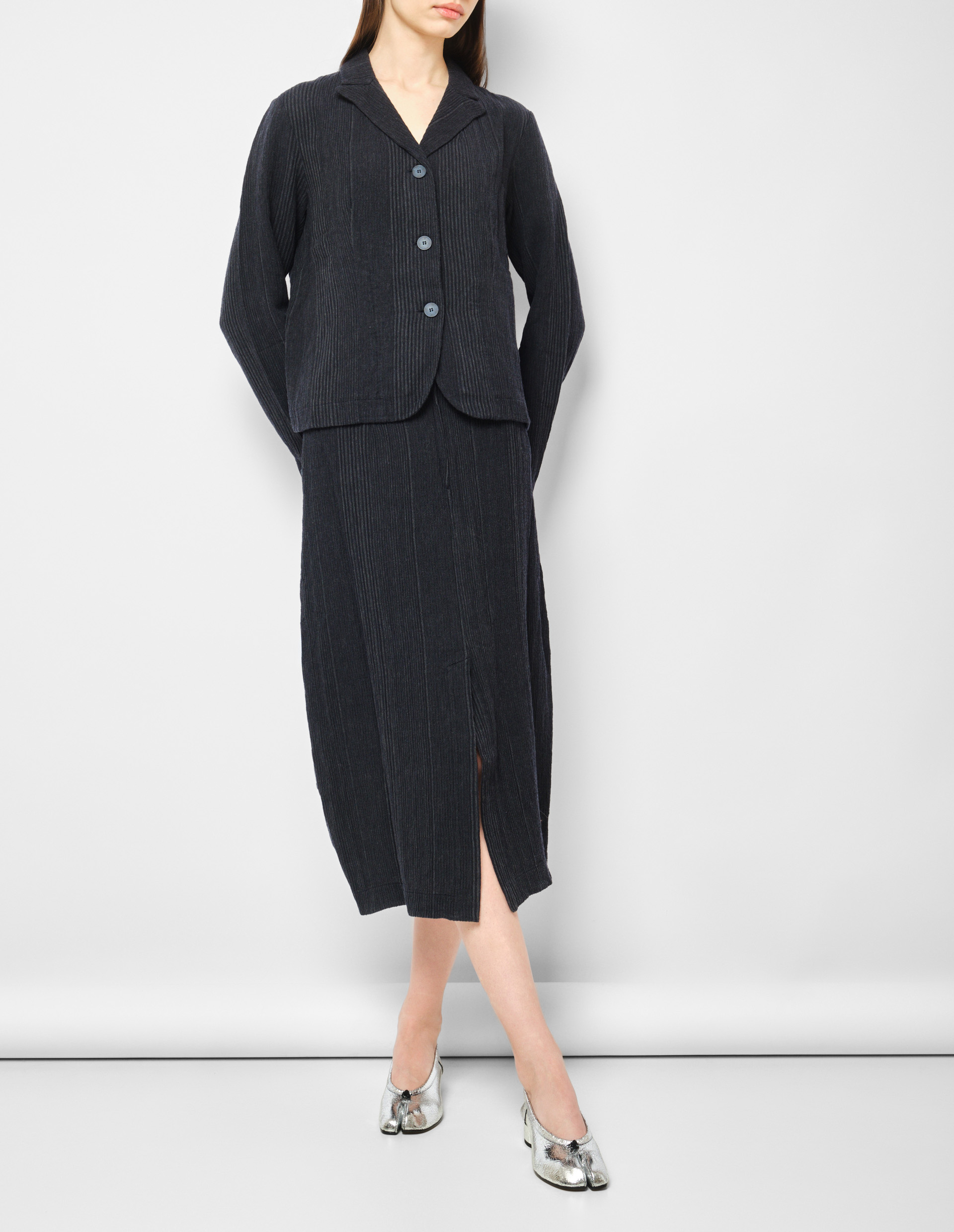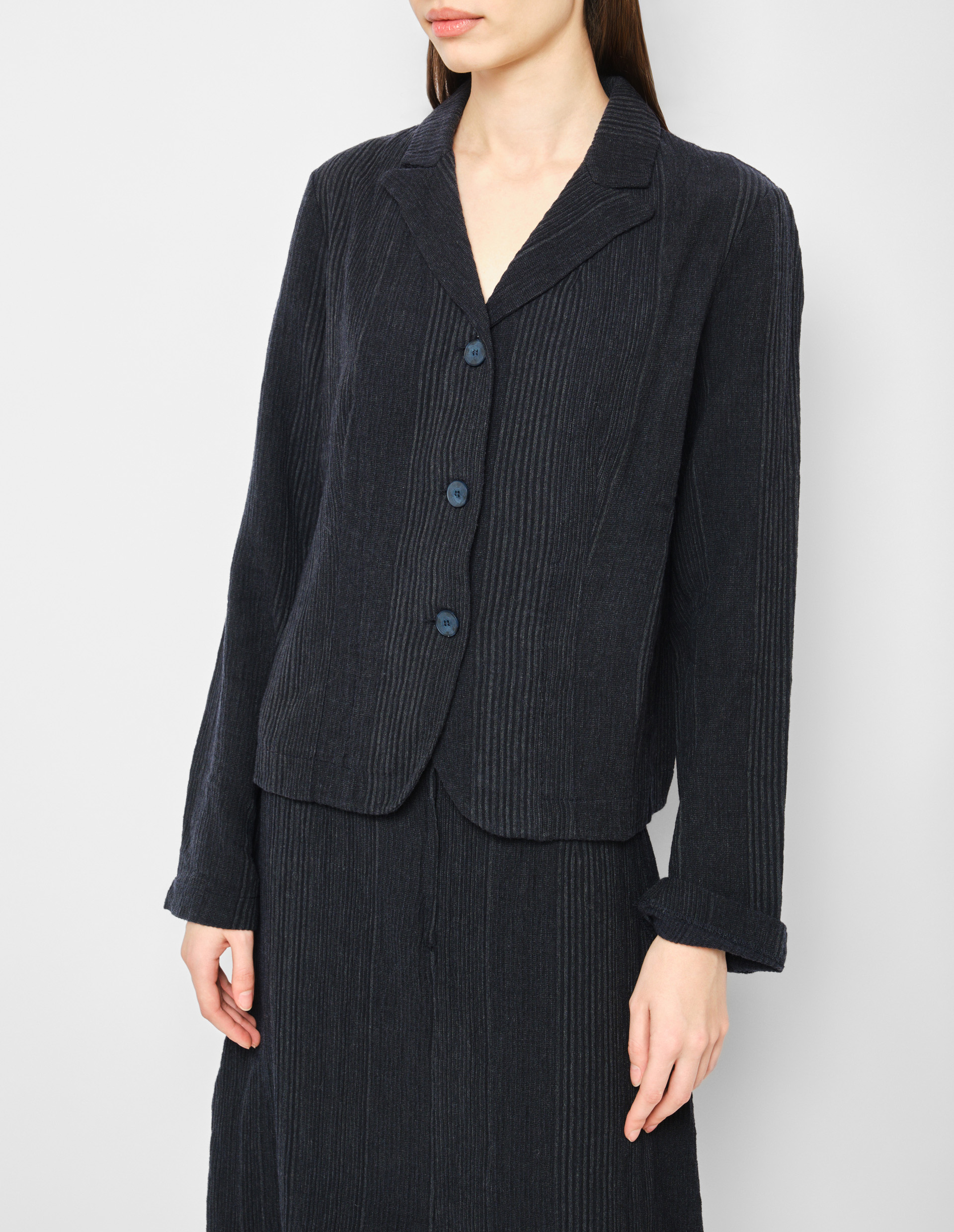 Модель с двойственной природой. Нежный пиджак из вискозы с шерстью согревает без ощущения массивности. Узор в тонкую полоску добавляет изящества. Расслабленный крой мягко драпирует силуэт, подчеркивая легкость и женственность. Тисненая текстура красиво играет оттенками. Пуговицы на полочках и рукавах выполнены в расцветке ткани. Классические лацканы как отсылка к офисному стилю. Нескучный жакет на каждый день, который сочетается как с юбкой из комплекта, так и с другими вещами.