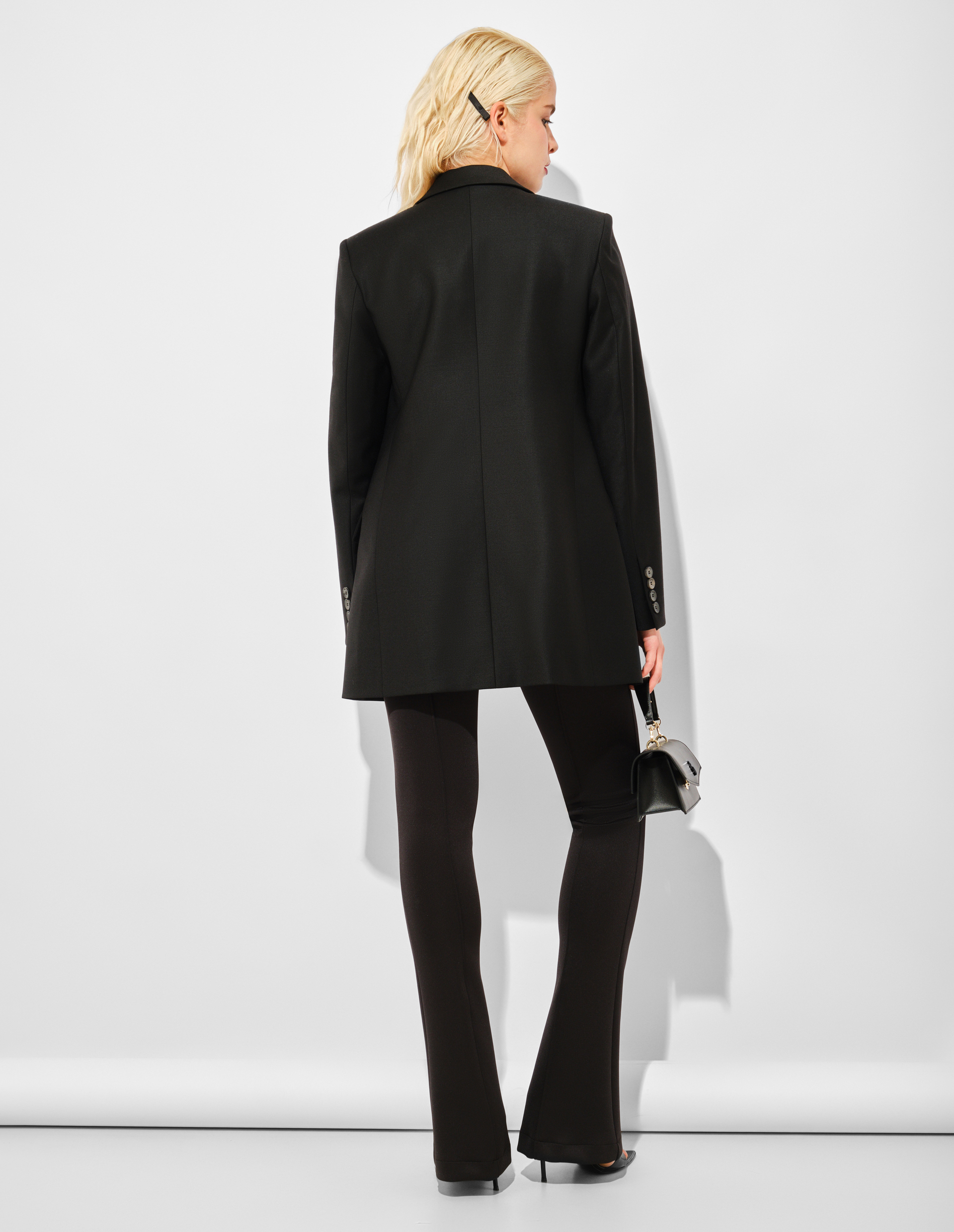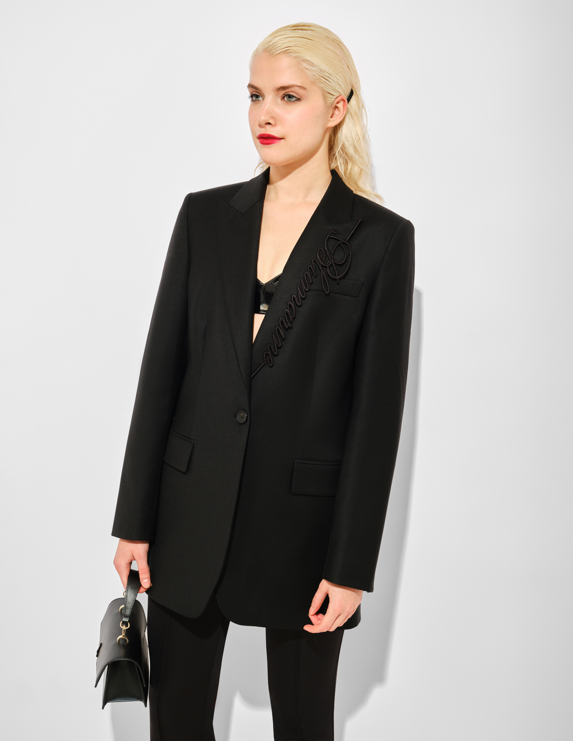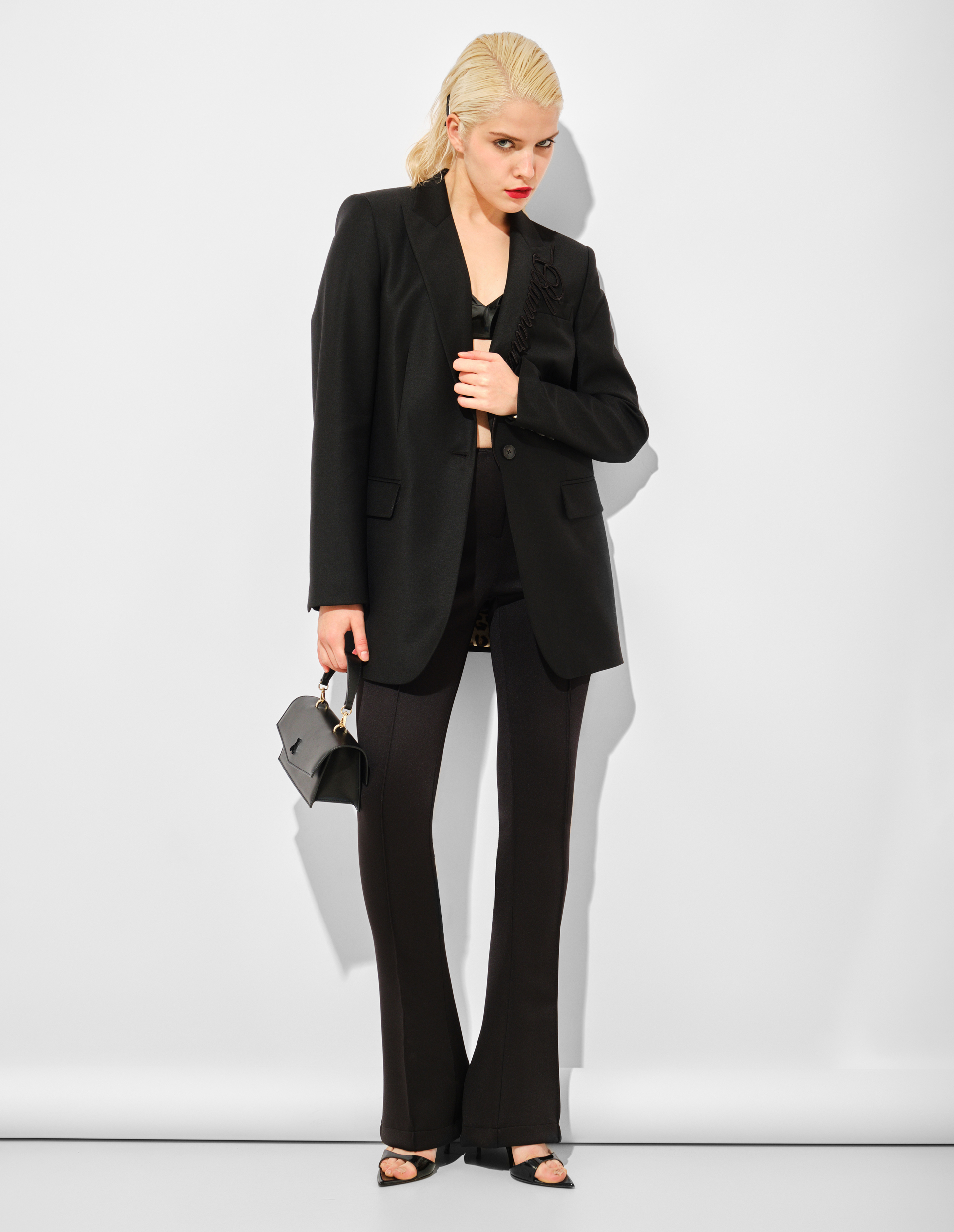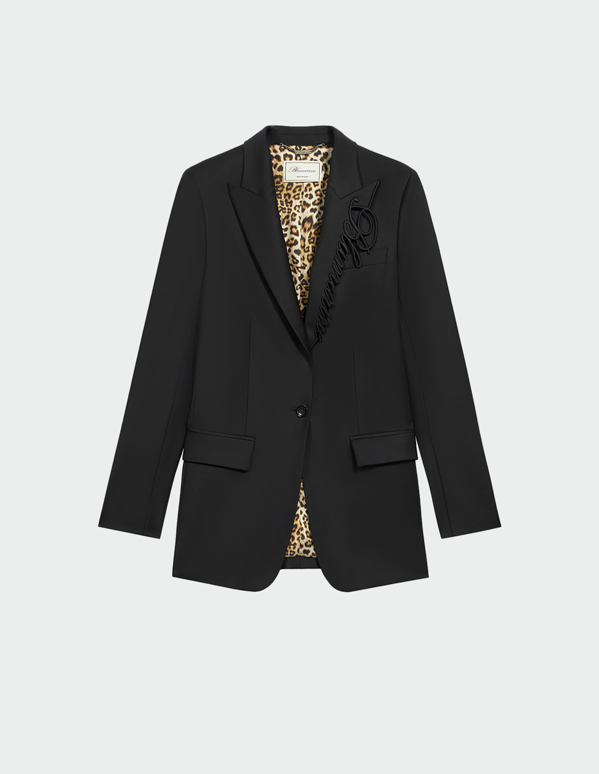 Мастер-класс по элегантной дерзкой классике. Классический кроеный силуэт жакета из чёрной шерсти говорит на языке безупречной строгости и дисциплины. Но истинная суть бренда раскрывается в деталях: тонкая вышивка логотипа «Blumarine» на лацкане — это громкая метка, зашифрованное послание для посвящённых. И главный сюрприз — подкладка с леопардовым принтом, скрытый взрыв гламура, известный только вам. Этот контраст делает жакет идеальным инструментом для игры с образами, где за фасадом деловой серьёзности всегда прячется дерзкая, романтичная душа.