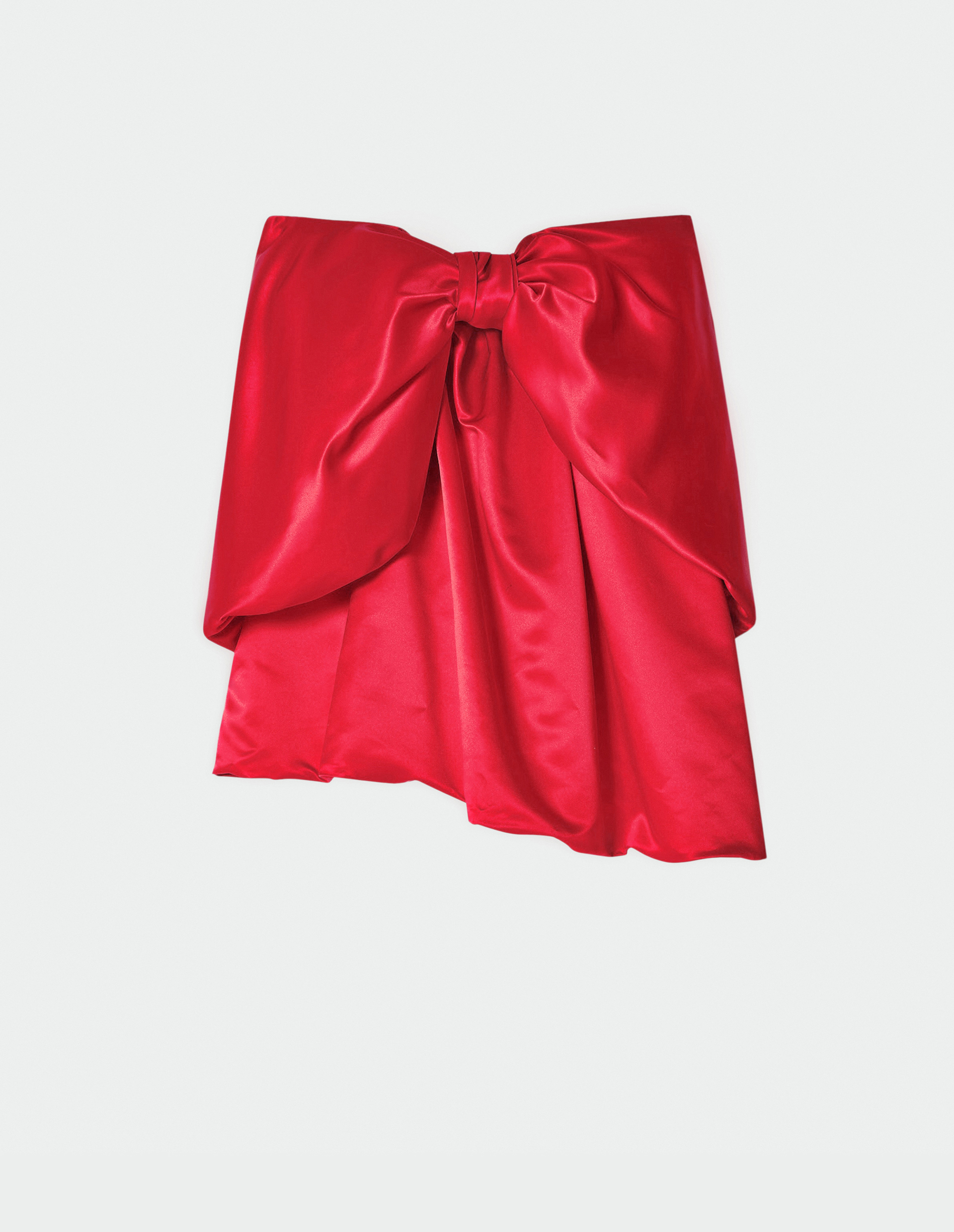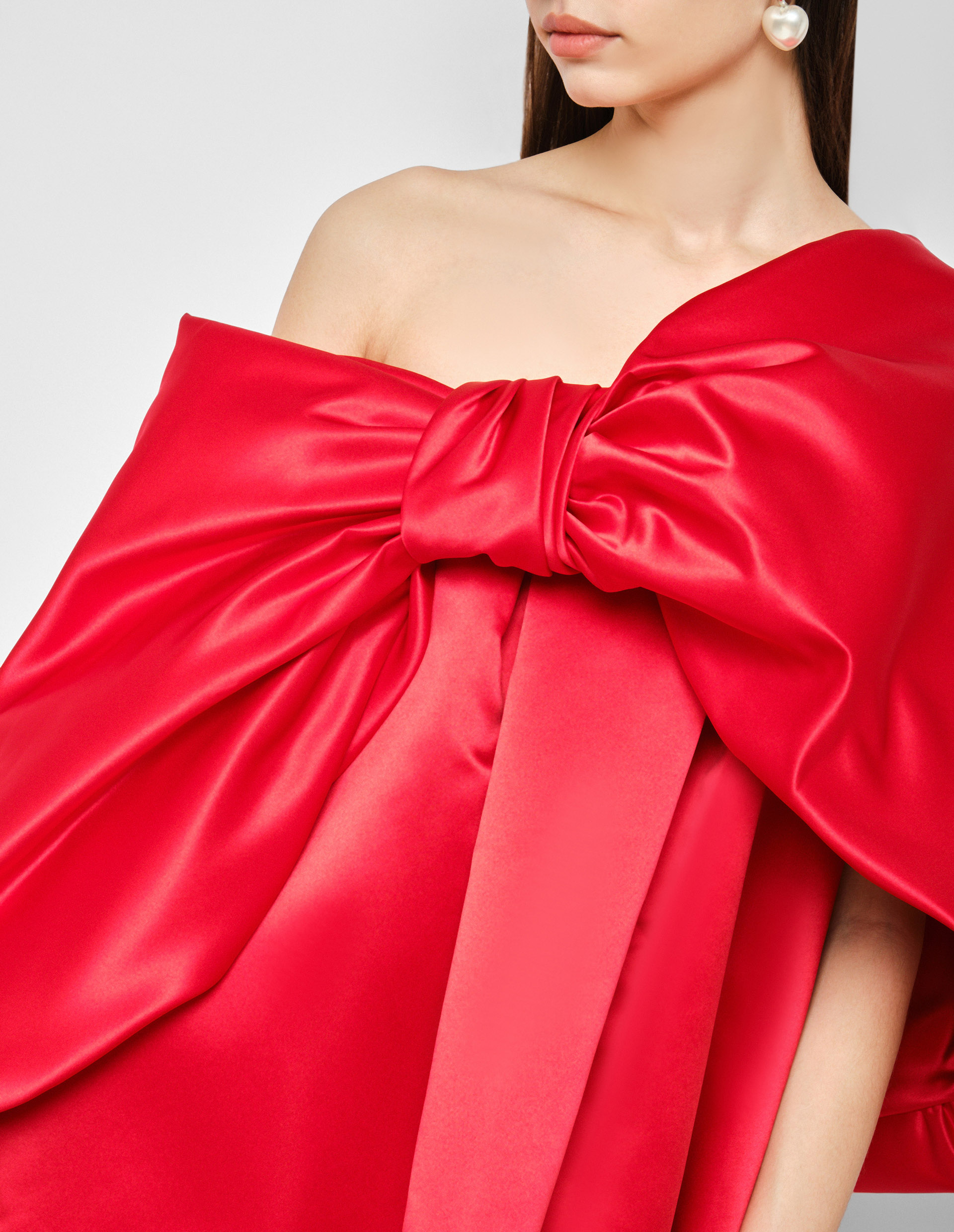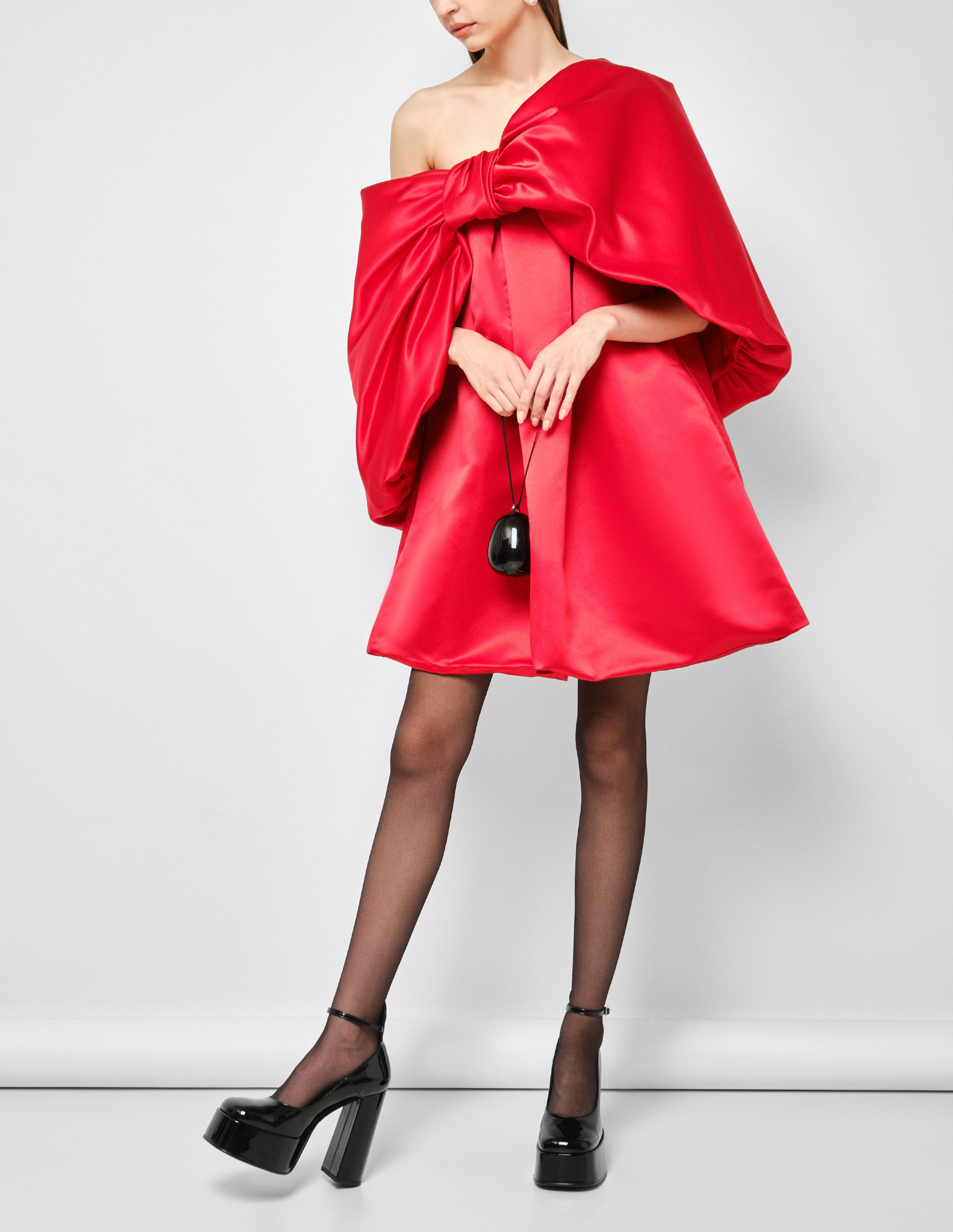 В атласном платье-мини из волшебной подиумной коллекции бренда Simone Rocha можно, в прямом смысле, ощутить себя настоящим ярким и праздничным подарком с крупным алым бантом. Ведь именно этот трендовый элемент являются основным декором акцентного и очаровывающего изделия. Асимметричный крой на одно плечо придает платью ту самую естественность и непринужденность, которая будто контрастирует с насыщенно красным оттенком и гладкой сатиновой фактурой. Это вызов окружающему миру, что несмотря на броскую подачу, женщины бренда Simone Rocha — это, в первую очередь, сильные, независимые личности со своим изысканным чувством стиля и индивидуальностью.