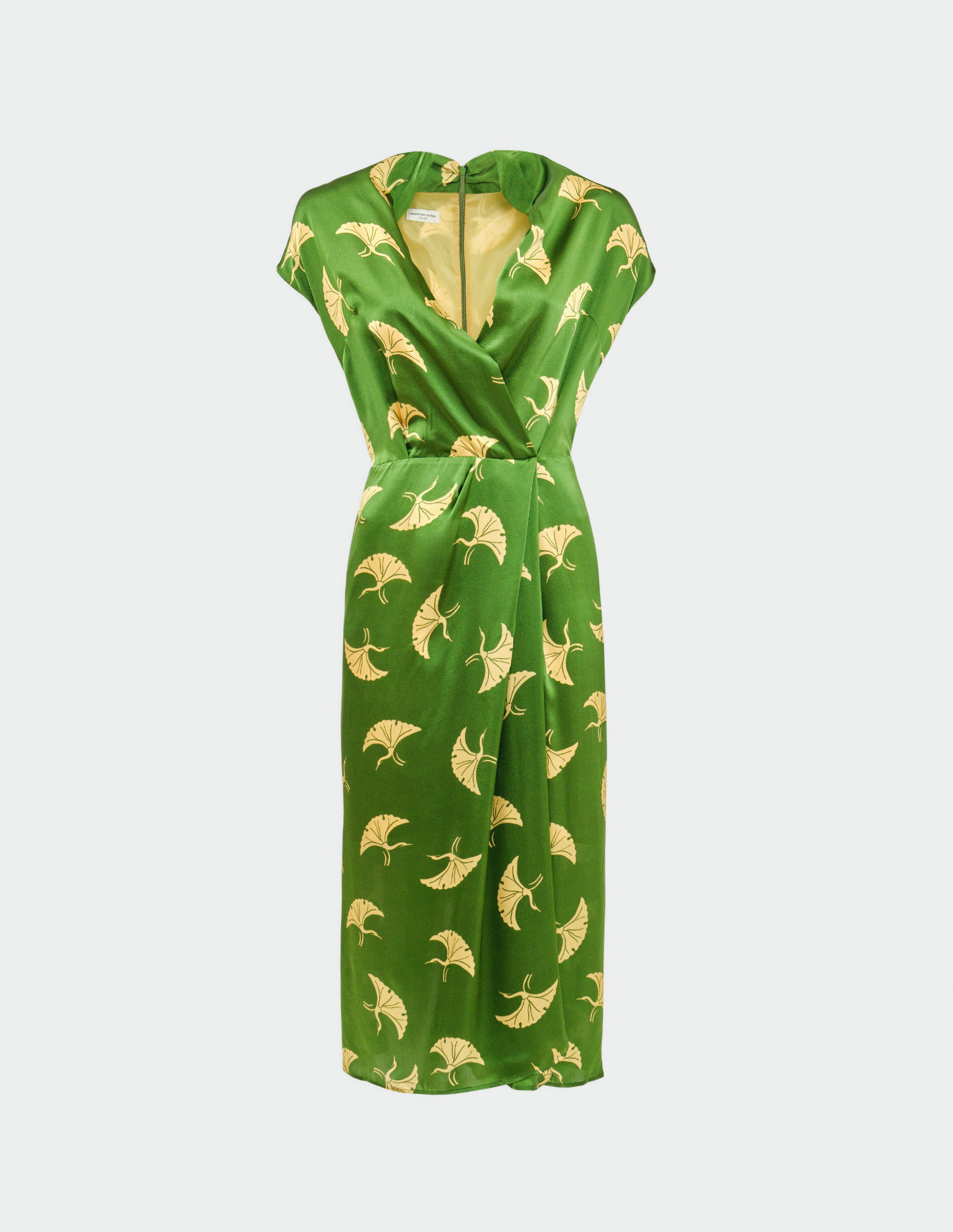 Созданные дизайнером и портным в третьем поколении, основатель одноименного бренда Dries Van Noten черпает вдохновение для своих изделий из безупречных силуэтов и произведений искусства со всего мира. Благодаря чему получилось создать одновременно женственное, благородное и акцентное платье DILIAN, которое абсолютно аутентично и загадочно. Искусно воплощенный золотой орнамент роскошно подчеркивает насыщенный зеленый оттенок модели, которая выполнена в довольно лаконичном и даже скромном силуэте, имитирующим запах. Яркое сопоставление броского цветового решения и изящной формы еще больше выделяется за счет, манящего своей гладкостью, особого шелкового состава, являющийся фирменной отличительностью особенностью бренда.