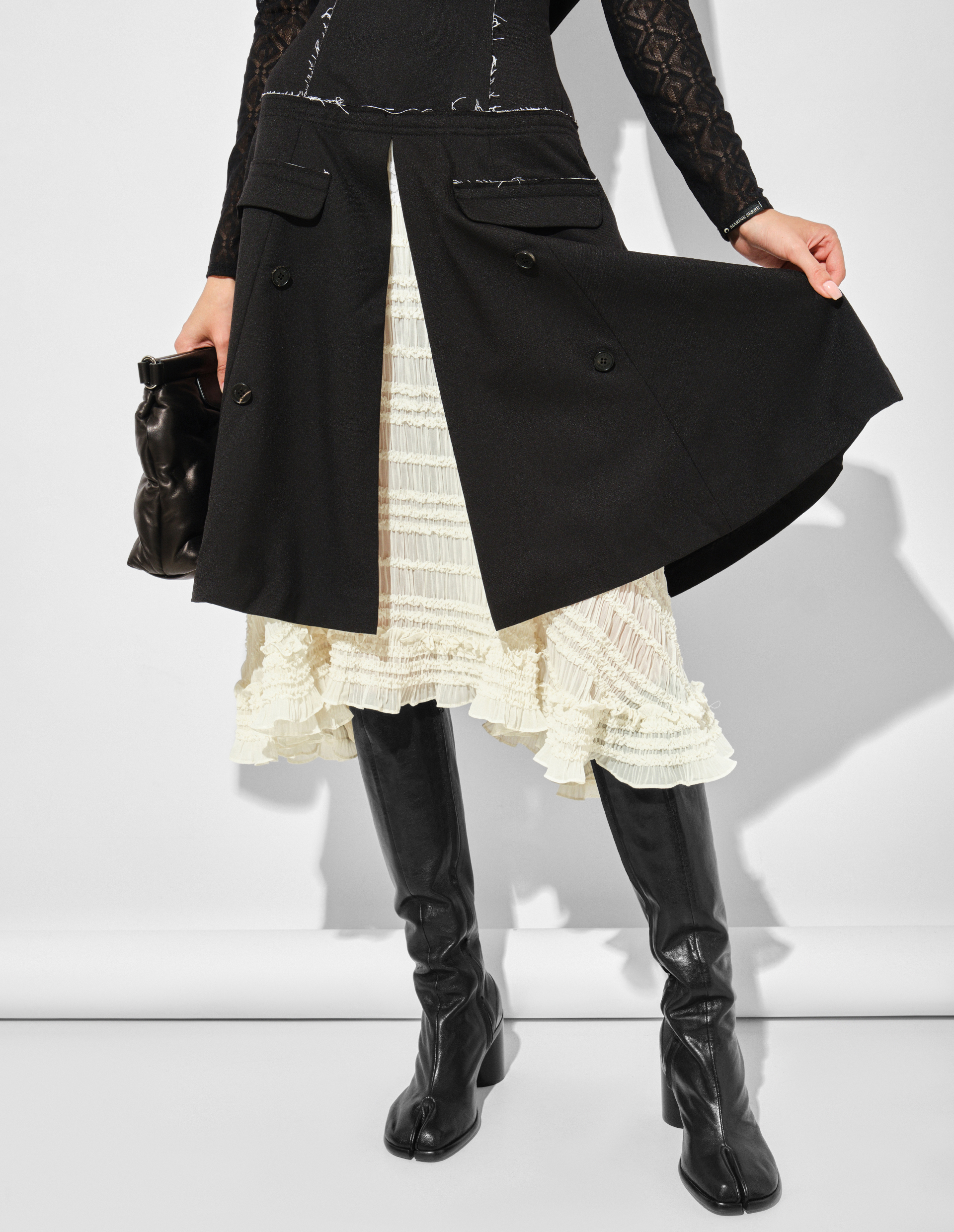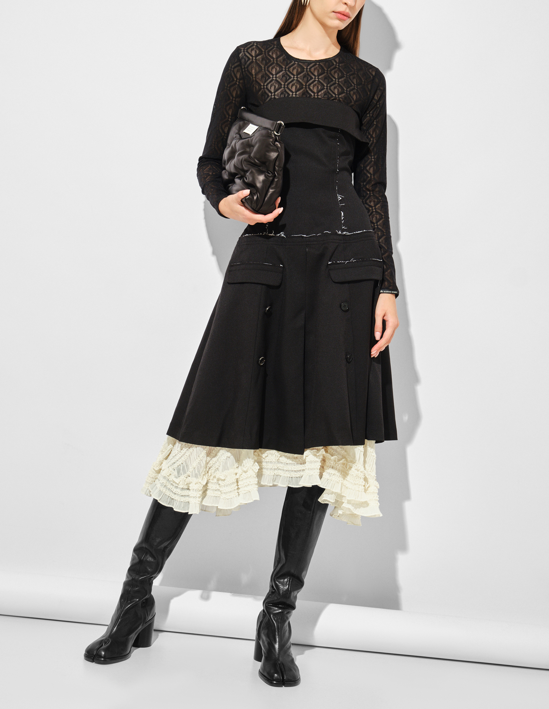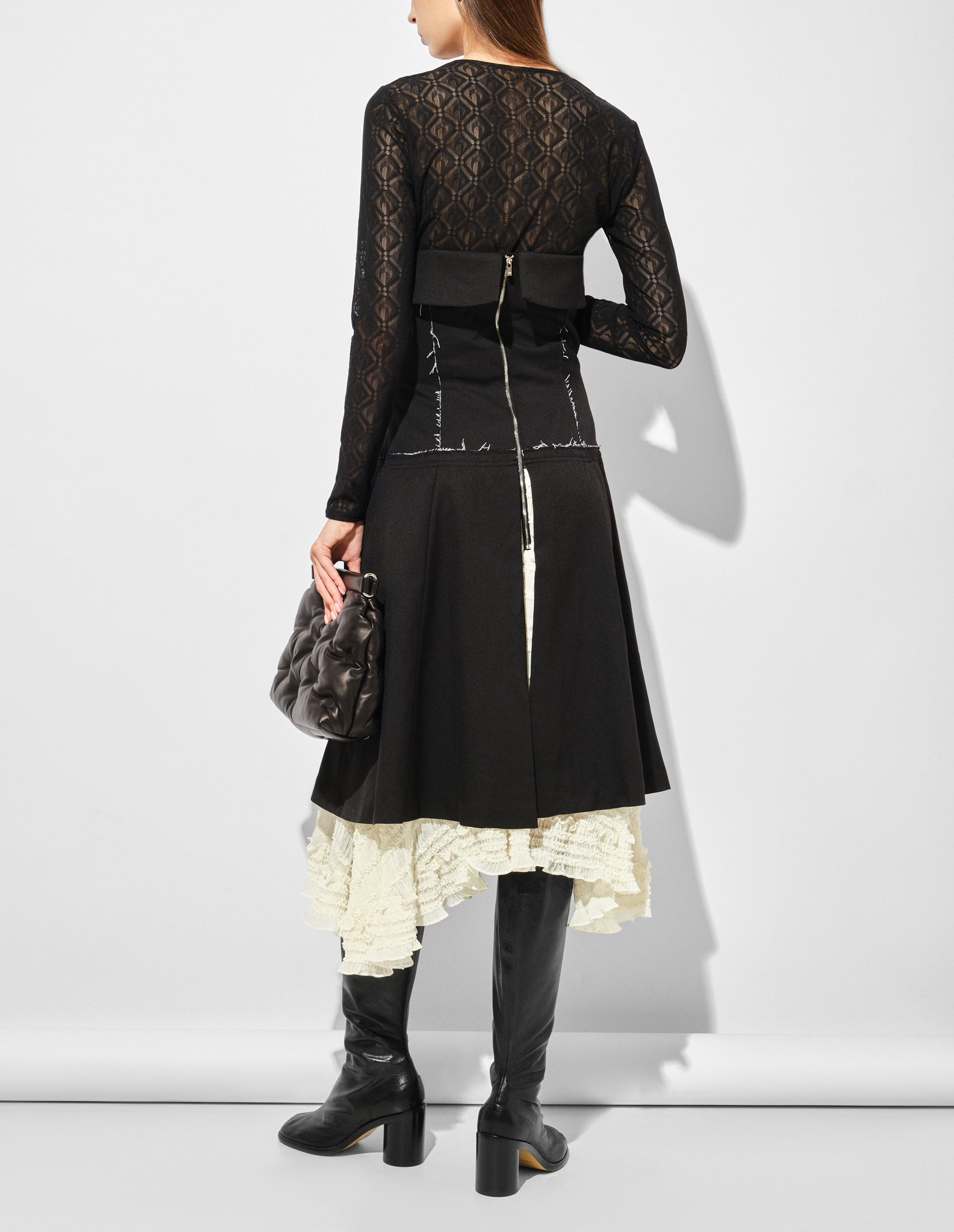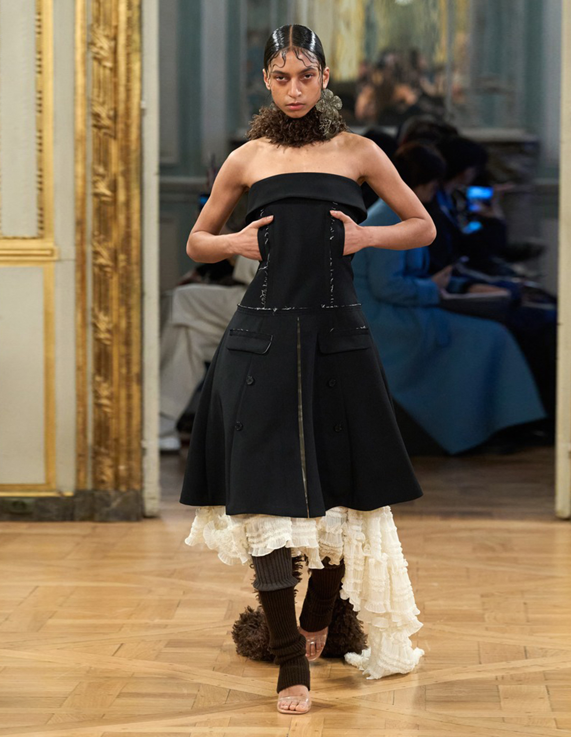 Удивительное платье-бюстье на основе смесовой шерсти от бренда с уникальным характером ROKH. Оно представляет сложную задумку с верхом-бюстье без бретелей и романтичный подол. В нем соединилась юбка А-силуэта, из-под которой виднеется кружевной пышный подъюбник для романтического, но современного вида, передающего настроение хрупкой женственности. Так сливается классицизм и радикальная конструкция, что обеспечивает уникальный подход к дизайну. Он также вдохновлен эпохой Романтизма и Возрождения, повествуя историю о новой красоте, освобожденной от условностей.