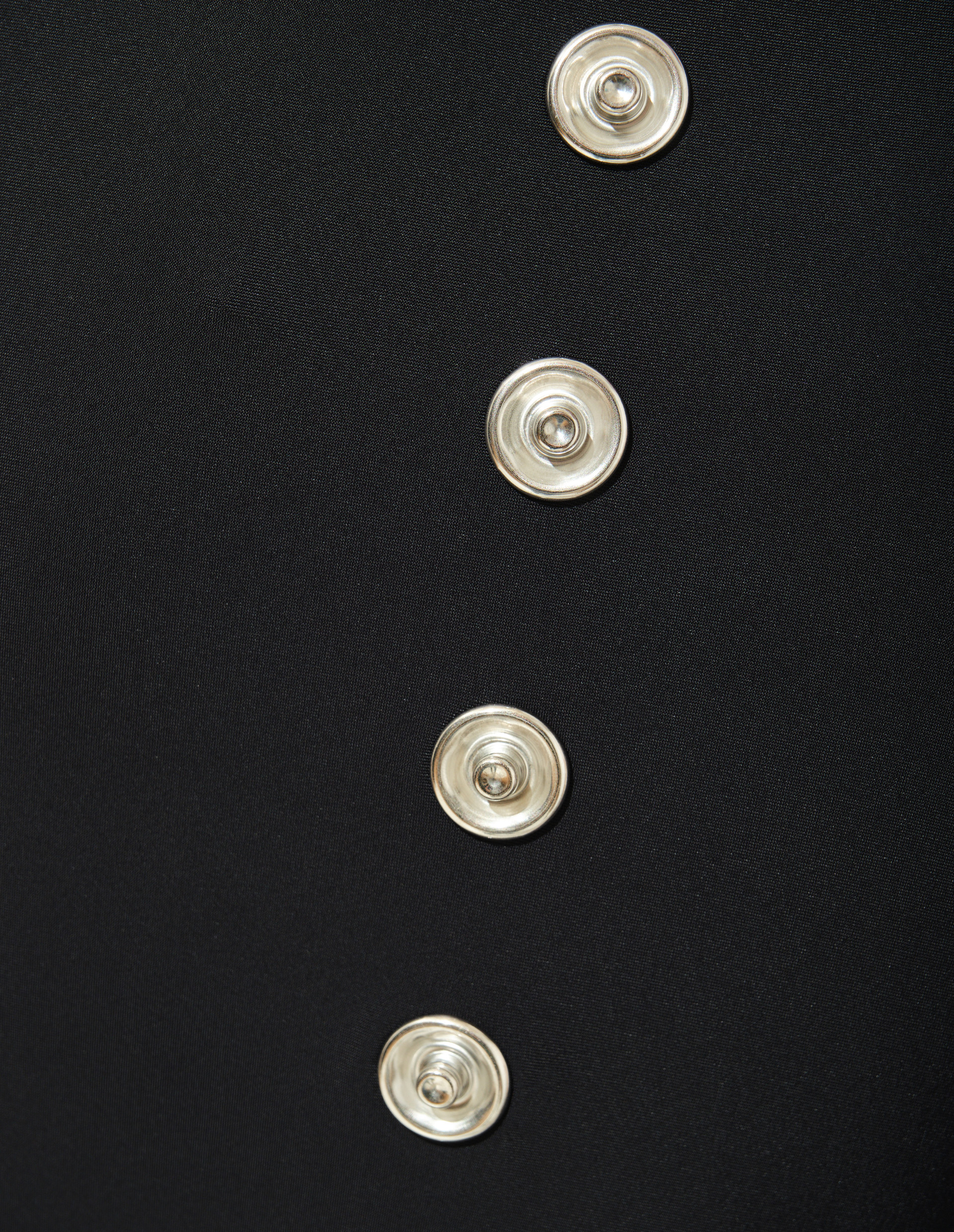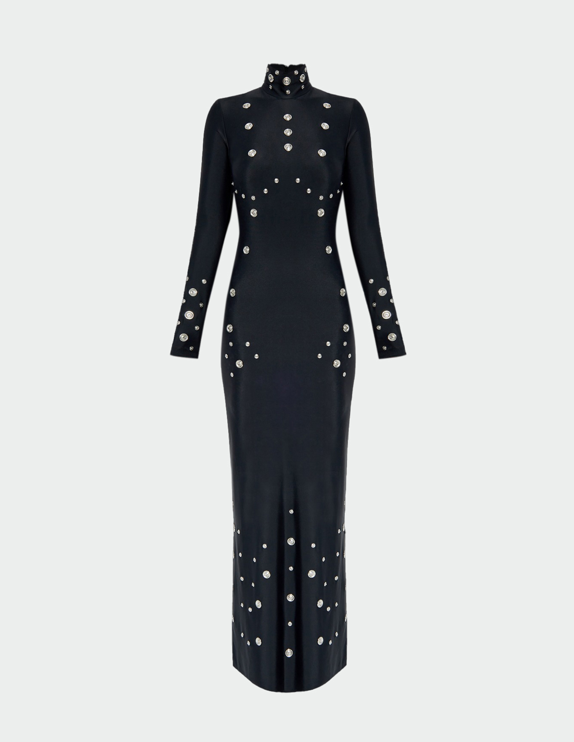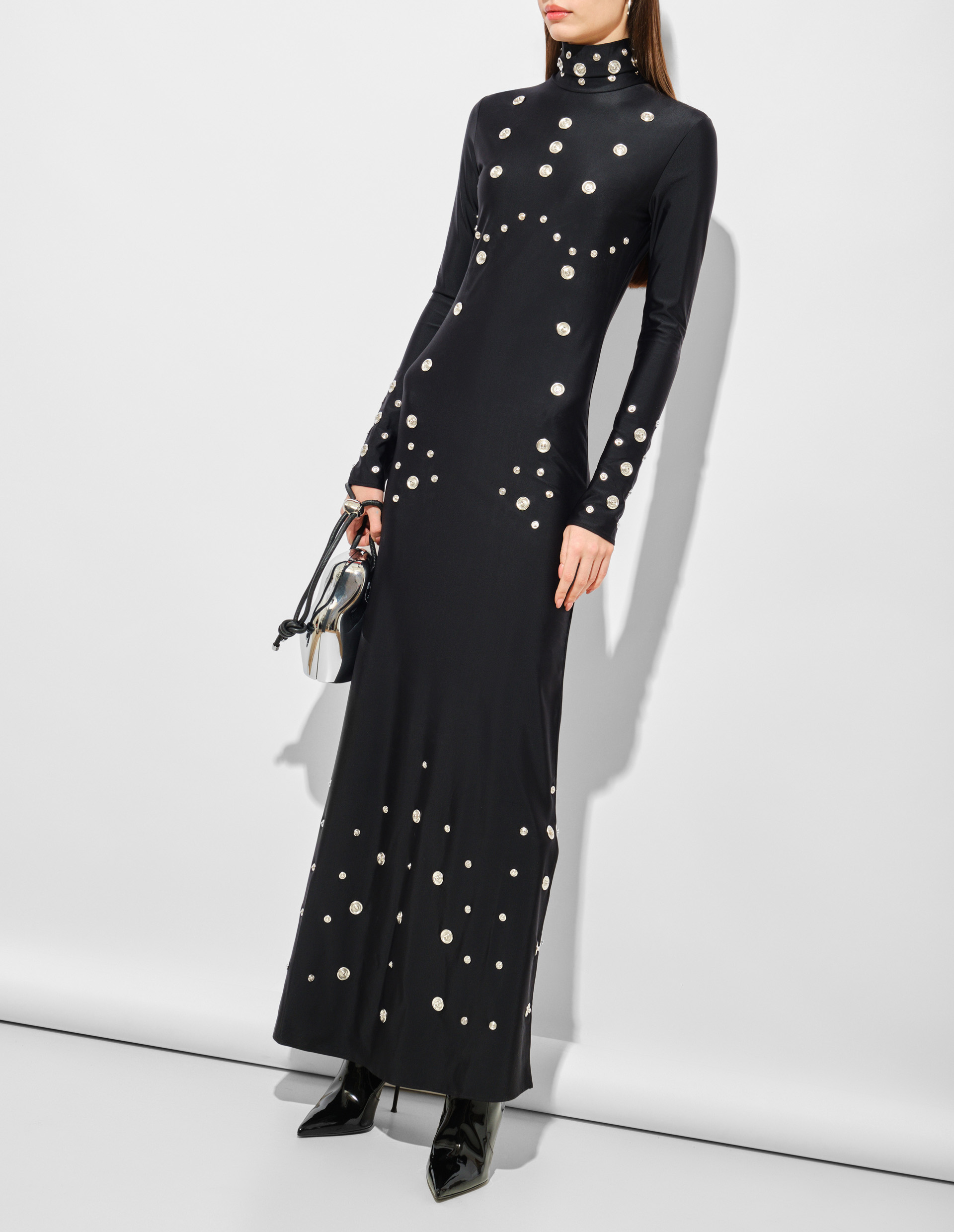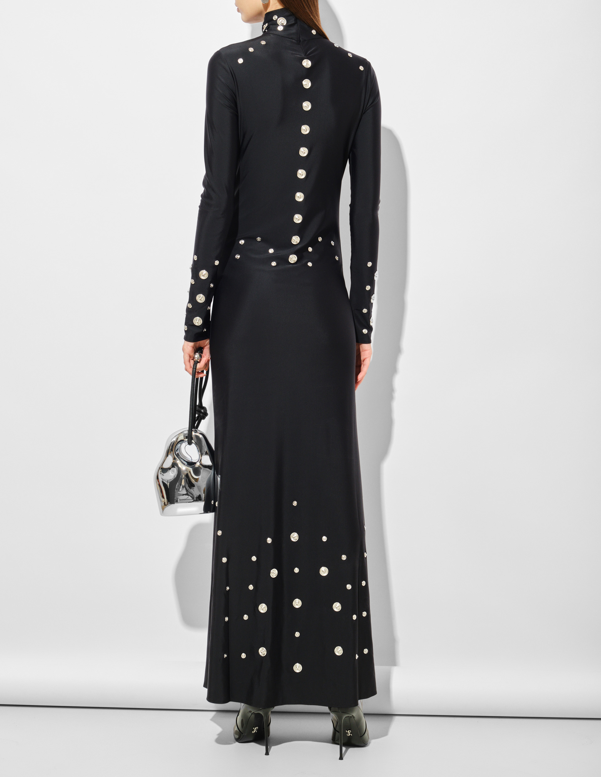 Фантастическое платье в пол из шелковистого стрейч-трикотажа с высоким воротником-стойкой и длинными узкими рукавами. Они дополняют скульптурный силуэт, слегка расширяющийся к низу, напоминая крой песочных часов, одновременно флюидный и статный. Являясь частью коллекции Fall 24 по мотивам "Космической одиссеи", модель черпает вдохновение из научно-фантастической культуры. Подтверждением этого являются украшения в виде десятков металлических кнопок, напоминающих футуристические аккумуляторные батареи. Это отсылает к образу элегантного киборга и героям культовых фильмов, таких как "Матрица", "Секретные материалы".