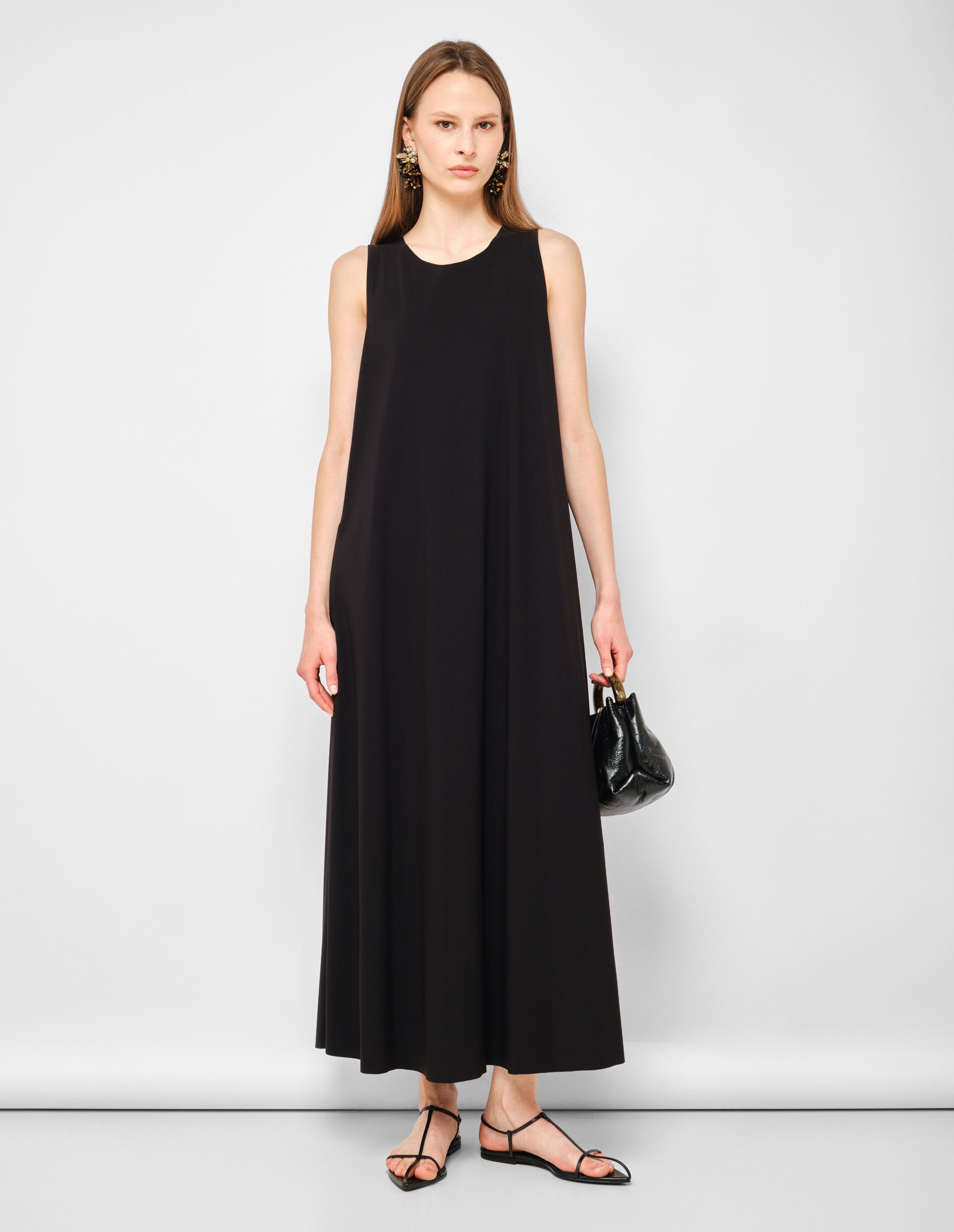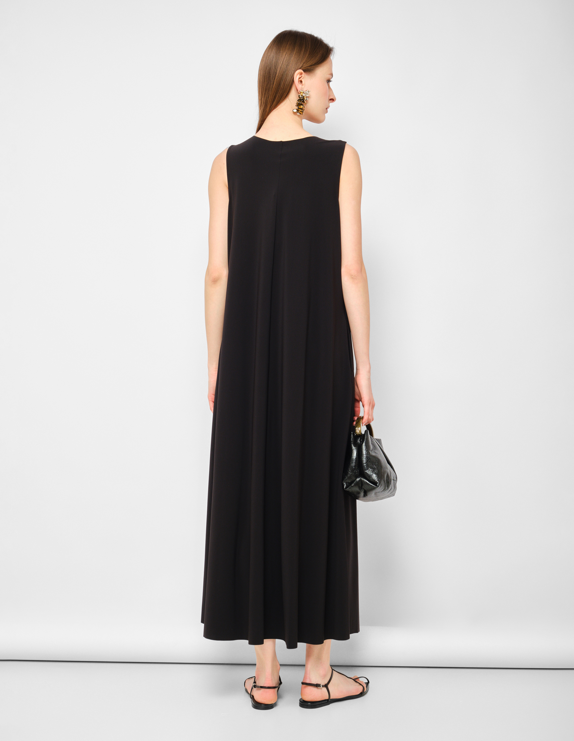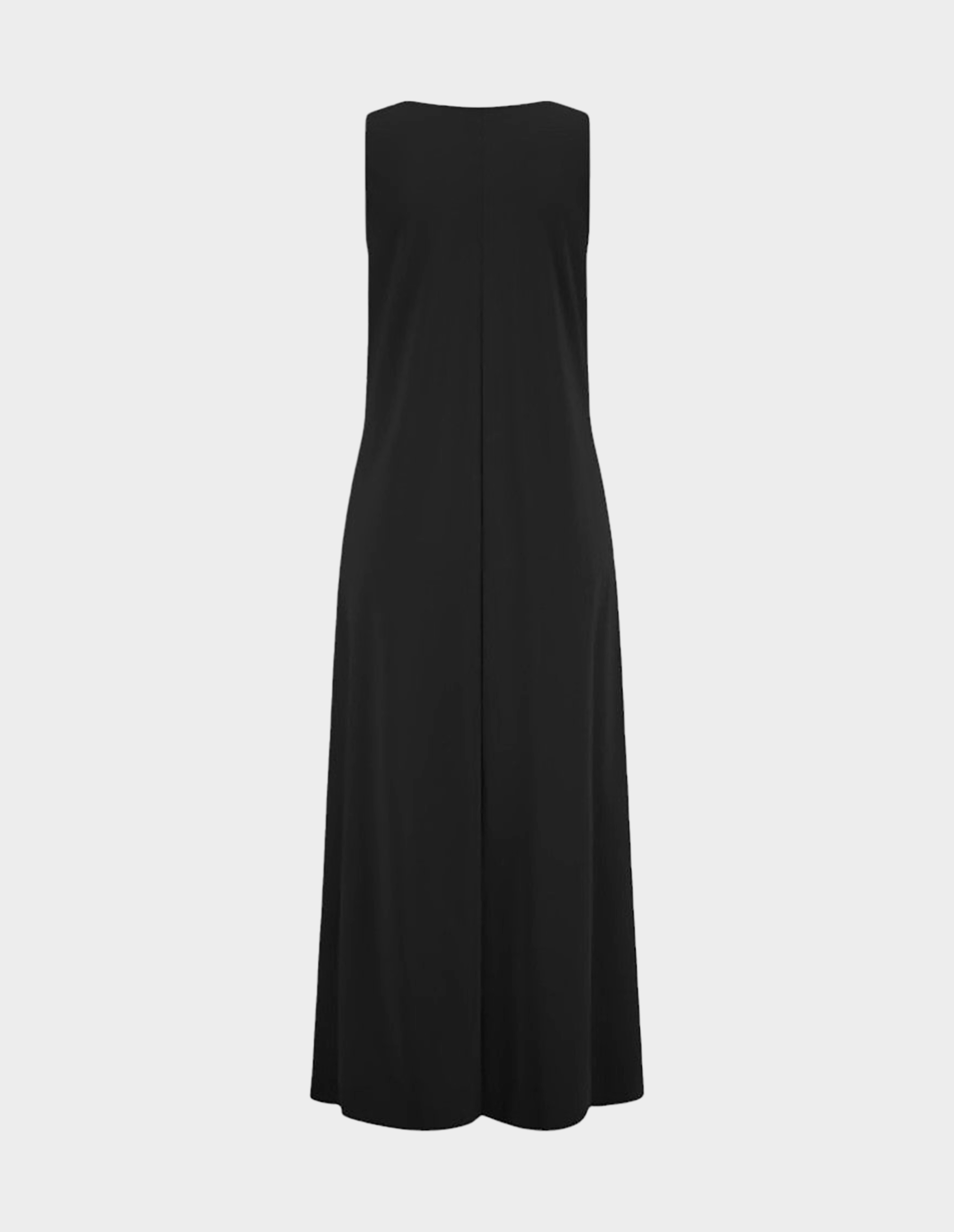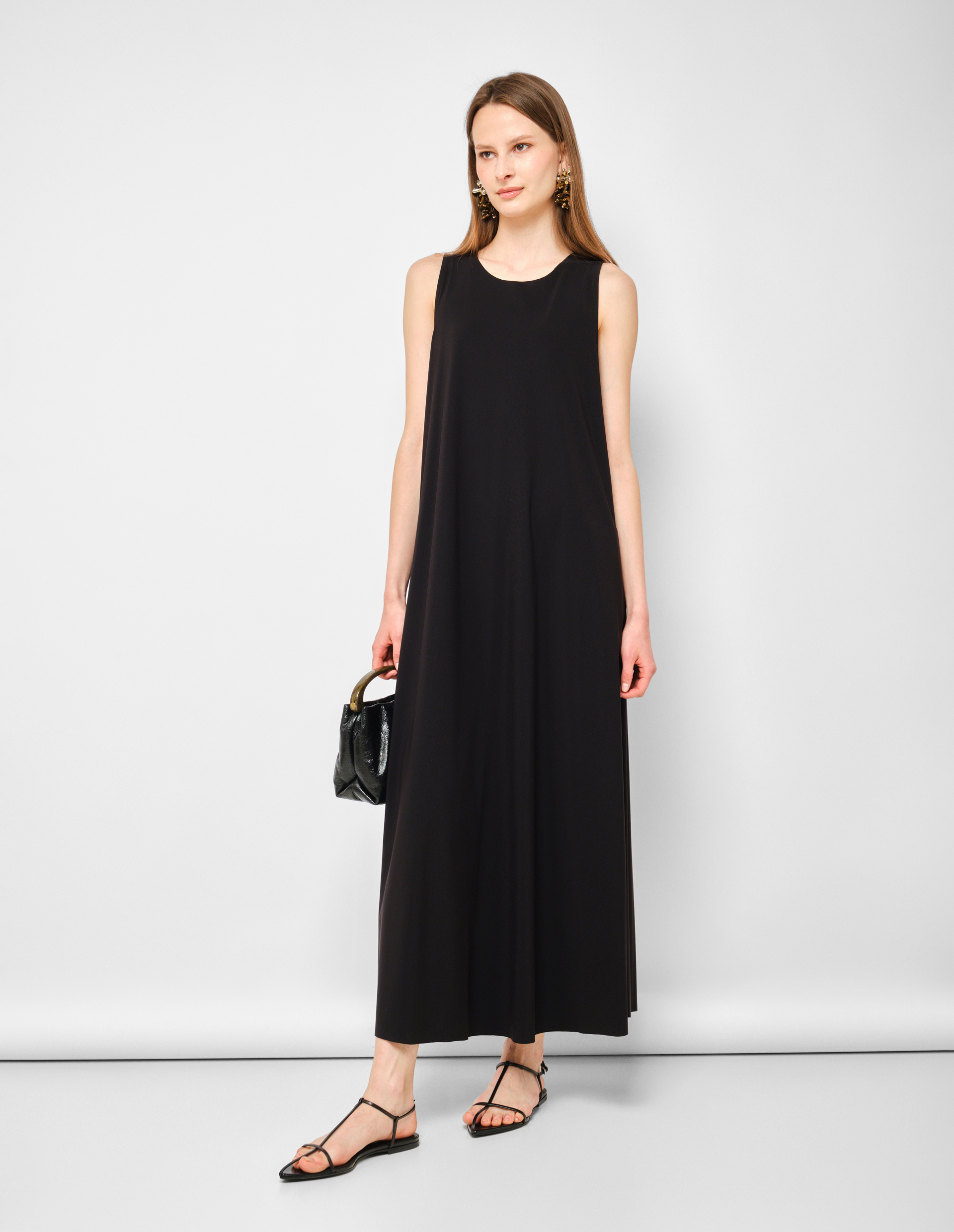 Абсолютная архитектура чистоты. Это платье от RIANI представляет собой идеальный баланс между скульптурной формой и функциональной простотой. Глубокий черный цвет, абсолютная база, выступает идеальным фоном для чистой геометрии кроя. А-силуэт, мягко расширяющийся от плеча к подолу, создает графичный, почти архитектурный объем, который не облегает, а очерчивает фигуру, оставляя пространство для дыхания и движения. Длина в пол добавляет драматической стройности и делает платье универсальным кандидатом как для дневных выходов, так и для вечерних мероприятий. Бесшовный круглый вырез создает чистую линию без лишних деталей, подчеркивая линию плеч и ключиц. Практичные боковые карманы добавляют функциональности, не нарушая минималистичной эстетики. Это платье — чистый холст, который ждет своих аксессуаров и обуви, но при этом самодостаточно в своей лаконичности.