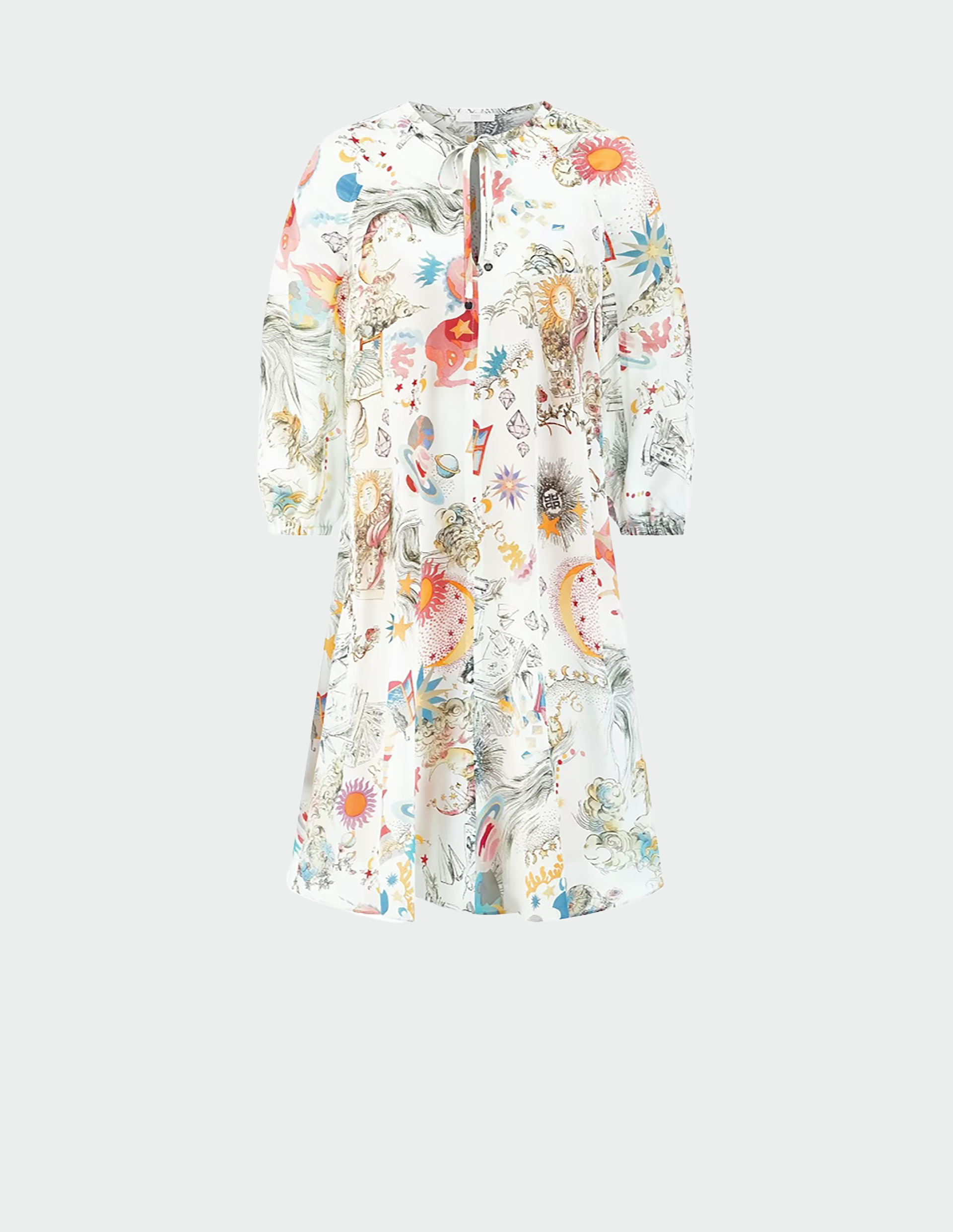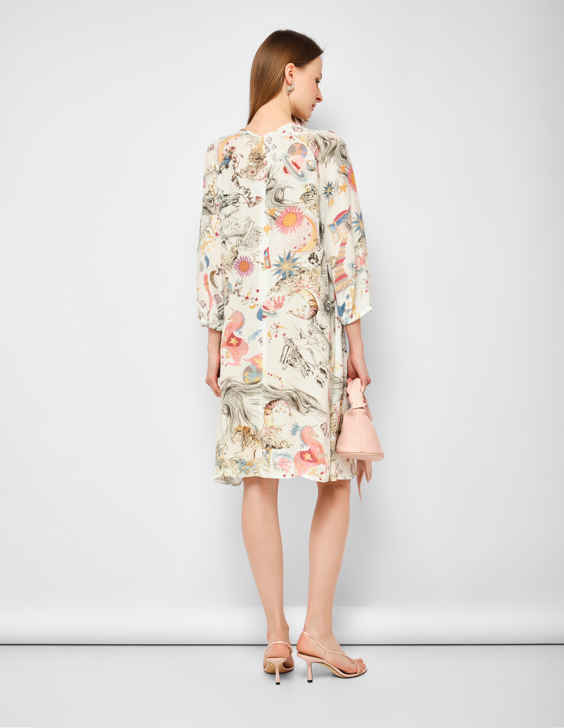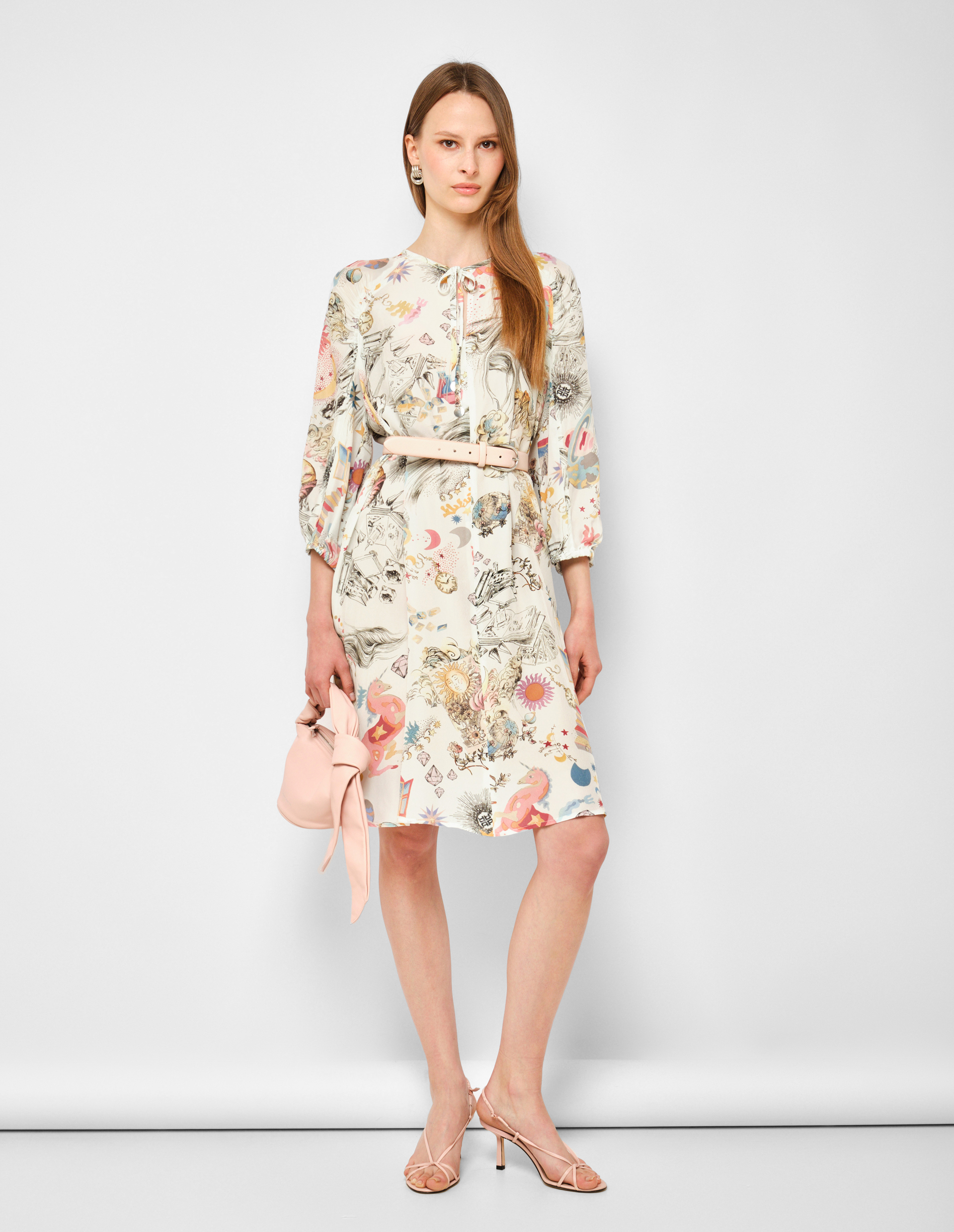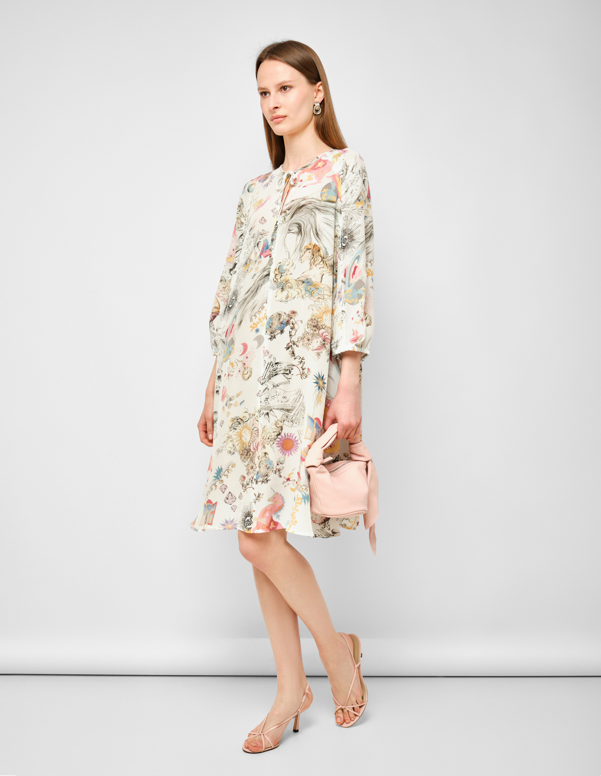 Платье от RIANI приглашает в путешествие, не требуя билета. Белоснежный фон выступает идеальным холстом для принта «Сказочный пейзаж» — тонкой графичной росписи, изображающей фантазийные миры с солнцем, планетами, маяками и парящими шарами. Этот сюрреалистичный коллаж добавляет одежде интеллектуальной глубины и игривого настроения, превращая повседневное платье в носитель истории. Длина миди создает универсальный, женственный силуэт. Ключевая деталь — воротник на завязке, который можно носить завязанным бантом или свободно спускающимся. Длинный рукав добавляет графической стройности и делает платье идеальным выбором для прохладных дней.